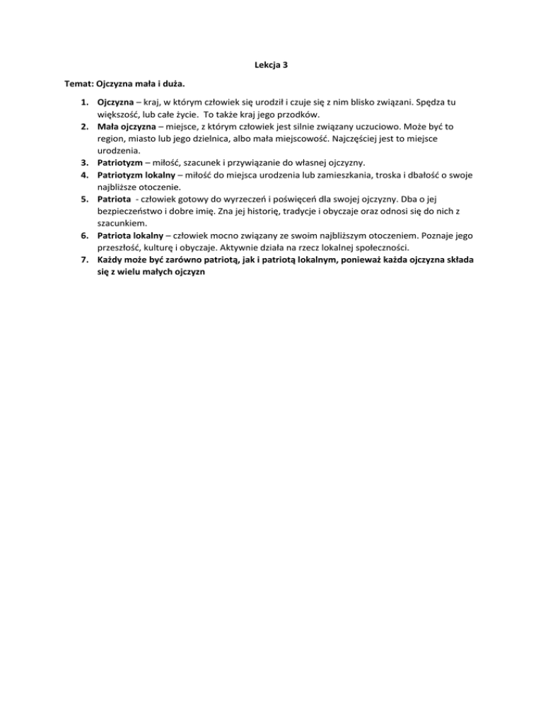 Lekcja 3 Temat: Ojczyzna mała i duża. 1. Ojczyzna – kraj, w którym człowiek się urodził i czuje się z nim blisko związani. Spędza tu większość, lub całe życie. To także kraj jego przodków. 2. Mała ojczyzna – miejsce, z którym człowiek jest silnie związany uczuciowo. Może być to region, miasto lub jego dzielnica, albo mała miejscowość. Najczęściej jest to miejsce urodzenia. 3. Patriotyzm – miłość, szacunek i przywiązanie do własnej ojczyzny. 4. Patriotyzm lokalny – miłość do miejsca urodzenia lub zamieszkania, troska i dbałość o swoje najbliższe otoczenie. 5. Patriota - człowiek gotowy do wyrzeczeń i poświęceń dla swojej ojczyzny. Dba o jej bezpieczeństwo i dobre imię. Zna jej historię, tradycje i obyczaje oraz odnosi się do nich z szacunkiem. 6. Patriota lokalny – człowiek mocno związany ze swoim najbliższym otoczeniem. Poznaje jego przeszłość, kulturę i obyczaje. Aktywnie działa na rzecz lokalnej społeczności. 7. Każdy może być zarówno patriotą, jak i patriotą lokalnym, ponieważ każda ojczyzna składa się z wielu małych ojczyzn
