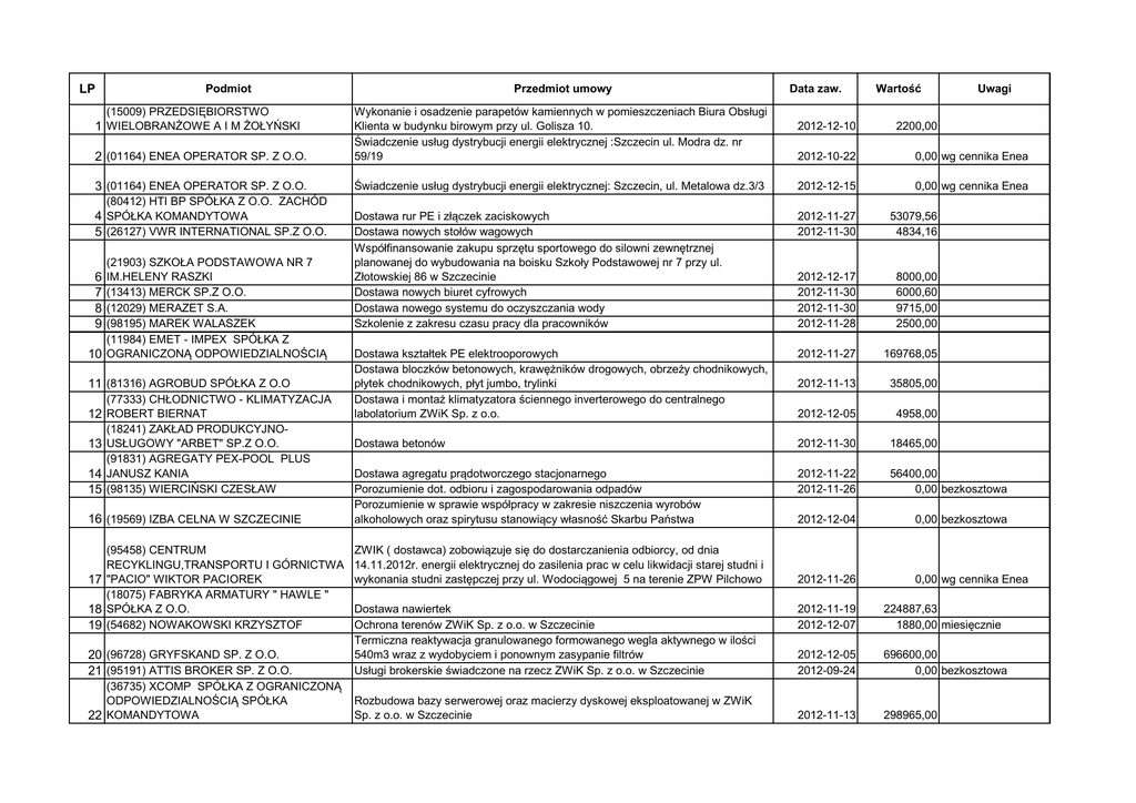 LP Podmiot (15009) PRZEDSIĘBIORSTWO Przedmiot umowy 2 (01164) ENEA OPERATOR SP. Z O.O. Wykonanie i osadzenie parapetów kamiennych w pomieszczeniach Biura Obsługi Klienta w budynku birowym przy ul. Golisza 10. Świadczenie usług dystrybucji energii elektrycznej :Szczecin ul. Modra dz. nr 59/19 3 (01164) ENEA OPERATOR SP. Z O.O. 1 WIELOBRANŻOWE A I M ŻOŁYŃSKI (80412) HTI BP SPÓŁKA Z O.O. ZACHÓD 4 SPÓŁKA KOMANDYTOWA 5 (26127) VWR INTERNATIONAL SP.Z O.O. (21903) SZKOŁA PODSTAWOWA NR 7 IM.HELENY RASZKI (13413) MERCK SP.Z O.O. (12029) MERAZET S.A. (98195) MAREK WALASZEK (11984) EMET - IMPEX SPÓŁKA Z 10 OGRANICZONĄ ODPOWIEDZIALNOŚCIĄ 6 7 8 9 11 (81316) AGROBUD SPÓŁKA Z O.O 12 13 14 15 (77333) CHŁODNICTWO - KLIMATYZACJA ROBERT BIERNAT (18241) ZAKŁAD PRODUKCYJNOUSŁUGOWY "ARBET" SP.Z O.O. (91831) AGREGATY PEX-POOL PLUS JANUSZ KANIA (98135) WIERCIŃSKI CZESŁAW 16 (19569) IZBA CELNA W SZCZECINIE (95458) CENTRUM RECYKLINGU,TRANSPORTU I GÓRNICTWA 17 "PACIO" WIKTOR PACIOREK (18075) FABRYKA ARMATURY " HAWLE " 18 SPÓŁKA Z O.O. 19 (54682) NOWAKOWSKI KRZYSZTOF Data zaw. 2012-12-10 Wartość Uwagi 2200,00 2012-10-22 0,00 wg cennika Enea Świadczenie usług dystrybucji energii elektrycznej: Szczecin, ul. Metalowa dz.3/3 2012-12-15 0,00 wg cennika Enea Dostawa rur PE i złączek zaciskowych Dostawa nowych stołów wagowych Współfinansowanie zakupu sprzętu sportowego do silowni zewnętrznej planowanej do wybudowania na boisku Szkoły Podstawowej nr 7 przy ul. Złotowskiej 86 w Szczecinie Dostawa nowych biuret cyfrowych Dostawa nowego systemu do oczyszczania wody Szkolenie z zakresu czasu pracy dla pracowników 2012-11-27 2012-11-30 53079,56 4834,16 2012-12-17 2012-11-30 2012-11-30 2012-11-28 8000,00 6000,60 9715,00 2500,00 Dostawa kształtek PE elektrooporowych Dostawa bloczków betonowych, krawężników drogowych, obrzeży chodnikowych, płytek chodnikowych, płyt jumbo, trylinki Dostawa i montaż klimatyzatora ściennego inverterowego do centralnego labolatorium ZWiK Sp. z o.o. 2012-11-27 169768,05 2012-11-13 35805,00 2012-12-05 4958,00 Dostawa betonów 2012-11-30 18465,00 Dostawa agregatu prądotworczego stacjonarnego Porozumienie dot. odbioru i zagospodarowania odpadów Porozumienie w sprawie współpracy w zakresie niszczenia wyrobów alkoholowych oraz spirytusu stanowiący własność Skarbu Państwa 2012-11-22 2012-11-26 56400,00 0,00 bezkosztowa 2012-12-04 0,00 bezkosztowa 2012-11-26 0,00 wg cennika Enea ZWIK ( dostawca) zobowiązuje się do dostarczanienia odbiorcy, od dnia 14.11.2012r. energii elektrycznej do zasilenia prac w celu likwidacji starej studni i wykonania studni zastępczej przy ul. Wodociągowej 5 na terenie ZPW Pilchowo 20 (96728) GRYFSKAND SP. Z O.O. 21 (95191) ATTIS BROKER SP. Z O.O. Dostawa nawiertek Ochrona terenów ZWiK Sp. z o.o. w Szczecinie Termiczna reaktywacja granulowanego formowanego wegla aktywnego w ilości 540m3 wraz z wydobyciem i ponownym zasypanie filtrów Usługi brokerskie świadczone na rzecz ZWiK Sp. z o.o. w Szczecinie (36735) XCOMP SPÓŁKA Z OGRANICZONĄ ODPOWIEDZIALNOŚCIĄ SPÓŁKA 22 KOMANDYTOWA Rozbudowa bazy serwerowej oraz macierzy dyskowej eksploatowanej w ZWiK Sp. z o.o. w Szczecinie 2012-11-19 2012-12-07 224887,63 1880,00 miesięcznie 2012-12-05 2012-09-24 696600,00 0,00 bezkosztowa 2012-11-13 298965,00 23 24 25 26 27 (69689) PROJEKTY-KOSZTORYSY BUDOWLANE NIERUCHOMOŚCI JANUSZ DETKA (31983) "REALBUD" SP.Z O.O. (68200) DCS AGENCJA REKLAMOWA SP. Z O.O. (11984) EMET - IMPEX SPÓŁKA Z OGRANICZONĄ ODPOWIEDZIALNOŚCIĄ (97205) STOWARZYSZENIE UZBROJENIA DZIAŁKI PRZY UL.TRZCINOWEJ 28 (20474) GMINA MIASTO SZCZECIN 29 (97855) STACHEL MAGDALENA 30 (00574) GMINA STARE CZARNOWO 31 32 33 34 (12999) WYTWÓRNIA TELEWIZJNOFILMOWA "ALFA" SP.Z O.O. (87673) GŁOS DZIENNIK POMORZA (25116) AGORA SPÓŁKA AKCYJNA (83386) ABKOWICZ PRESS WŁODZIMIERZ ABKOWICZ (88052) PROJEKTOWANIE BUDOWLANE 35 ARTUR KONIECZNY 36 (29467) GRONTMIJ POLSKA SP.Z O.O 37 (PRZ0012) STACHEL MAGDALENA (17744) AR-TECH FIRMA PROJEKTOWO38 BUDOWLANA ANDRZEJ RYCHLICKI 39 (31954) MLEASING SP.Z O.O. 40 (31954) MLEASING SP.Z O.O. 41 (85015) ROLNIK SP.Z O.O. 42 (102806) ELJOT JACEK LUTEREK 43 (84985) MEDIA REGIONALNE SP. Z O.O. 44 (25116) AGORA SPÓŁKA AKCYJNA Wykonanie operatu szacunkowego określającego wartość rynkową prawa służebności przesyłu w celu ustalenia wysokości jednorazowego wynagrodzenia z tyt. ustanowienia służebności na każdej z nieruchomości gruntowej Gminy Miasto Szczecin i Skarbu Państwa Dostawa cegły klinkierowej kanalizacyjnej, cementu 2012-11-29 2012-11-13 24000,00 17530,00 Zamieszczanie ogłoszeń w prasie Dostawa skrzynek ulicznych zasuwowych i hydrantowych żeliwnych i polietylenowych 2012-12-03 36628,20 2012-11-19 99308,00 Umowa na budowę urządzeń wodociągowych i kanalizacji sanitarnej Umowa na budowę urządzenia kanalizacji sanitarnej nieruchomości stanowiącej działkę ewidencyjną nr 7/5 z obrębu nr 2020 położonej przy ul.Chorzowskiej w Szczecinie Przeprowadzenie wykładów z zasad udzielania pomocy przedlekarskiej Porozumienie dot. zrealizowania wspólnie inwestycji polegającej na zaprojektowaniu, budowie i oddaniu do użytkowania sieci wodociągowej pomiędzy hydrofornią w miejscowości Kołbacz, a miejscowością Stare Czarnowo- o dł. ok. 3500m 2012-10-15 1730,00 2012-10-26 2012-11-19 1000,00 0,00 Umowa licencyjna Artykuł promocyjny o odnawialnych źródłach energii Publikacja ogłoszenia w Gazecie Wyborczej 2012-10-25 2012-11-14 2012-11-16 2750,00 1500,00 1500,00 Zamieszczenie artykułu promocyjnego dot. Spółki w Świecie Biznezu Wykonanie dokumentacji projektowej przebudowy budynku magazynowego oraz budowy stanowiska przepompowni oleju napędowego w budynku hali pomp-ZPW Pilchowo Analiza finansowa ZWiK Sp. z o.o. w Szczecinie w zakresie zgodnym z treścią zapytania ofertowego Zlecenie przeprowadzenia wykładów z zasad udzielania pomocy przedlekarskiej w razie wypadku w ramach kursu BHP dla pracowników Wykonan