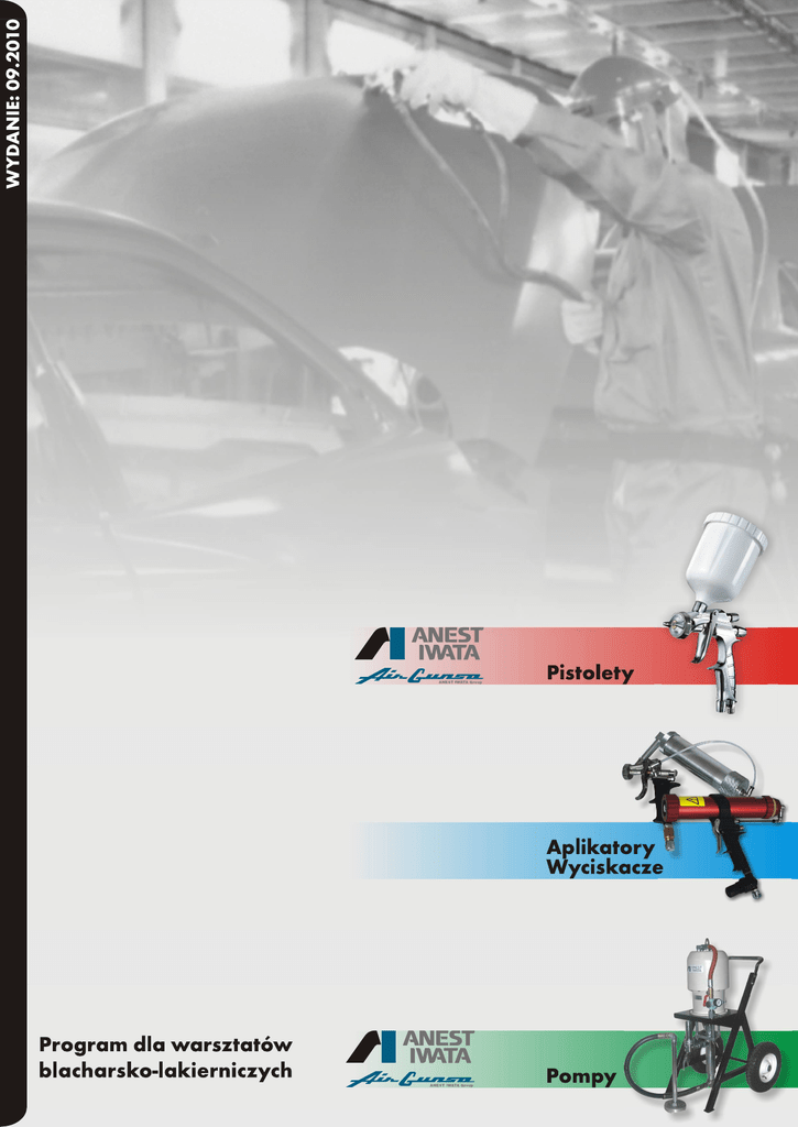 Pistolety lakiernicze ANEST IWATA serii WS400 Po trwaj¹cych ponad 2 lata pracach nad nowym modelem pistoletu lakierniczego, firma ANESTIWATA, lider w bran¿y urz¹dzeñ do lakierowania na mokro, wprowadzi³a zupe³nie nowy pistolet WS400 Supernova. 1 JAKOŒÆ WYK£ADANIA Podczas prac nad pistoletem szczególny nacisk po³o¿ono na zapewnienie jak najlepszego rozk³adu i atomizacji lakierów bazowych WB oraz bezbarwnych HS. In¿ynierowie IWATY po przeprowadzeniu tysiêcy prób uzyskali najlepsz¹ kombinacjê dyszy z systemem preatomizacji oraz zmodyfikowanej g³owicy. Rezultatem jest bardzo p³aski strumieñ równomiernie rozk³adaj¹cy siê na ca³ej powierzchni „miot³y”, co znacz¹co poprawia wyk³adanie lakierów bazowych. Po przeprowadzeniu setek prób laboratoryjnych oraz w rzeczywistych warunkach pracy, okaza³o siê i¿ nie da siê pogodziæ idealnego wyk³adania lakierów bezbarwnych i bazowych na tej samej dyszy i g³owicy. Dlatego zdecydowano o wprowadzeniu dwóch ró¿nych dysz i iglic w zale¿noœci od rodzaju lakieru. Wraz z pistoletem zosta³ opracowany nowy typ manometru z regulatorem ciœnienia, zapewniaj¹cy bardzo stabilne warunki pracy pistoletu, co ma zasadniczy wp³yw na jakoœæ wykonywanych pow³ok. 2 Pistolety lakiernicze ANEST IWATA serii WS400 2 ERGONOMIA Wspólnie z Uniwersytetem w Pavi oraz biurem projektowym Pininfarina zosta³ zaprojektowany nowy kszta³t korpusu tak, aby w maksymalny sposób odci¹¿yæ nadgarstek lakiernika u³atwiaj¹c mu tym samym dok³adniejsz¹ i swobodniejsz¹ pracê. Z drugiej strony poprawiono uchwyt pistoletu tak, aby lakiernik móg³ pewniej trzymaæ sam pistolet, a co za tym idzie wk³adaæ mniej si³y i uwagi w samo trzymanie pistoletu 3 STYL Rewolucyjnym dla produktów Anest-Iwata elementem towarzysz¹cym powstawaniu pistoletu, by³o po³o¿enie nacisku na stronê wizualn¹. In¿ynierowie IWATA zwrócili siê o pomoc do uznanego biura projektowego bêd¹cego miêdzy innymi twórc¹ takich projektów jak nadwozia Ferrari. Efektem wspó³pracy z biurem Pininfarina jest kszta³t, który z jednej strony zapewnia znakomit¹ ergonomiê pistoletu a z drugiej bardzo nowoczesny wygl¹d pod¹¿aj¹cy za najnowszymi trendami wzorniczymi. Pistolet WS400 oferowany jest w porêcznej walizce. Model Indeks NTS WS400-1201 WS400-1301B WS400-1301C WS400-1401 3300414 3300416 3300418 3300420 Przy³bica z podawaniem sprê¿onego powietrza IWATA AIRFED 2100 Indeks NTS 3441260 130 mm od wylotu farby 200 mm od wylotu farby 1.2 1.3 Baza 1.3 Bezbarwny 1.4 2 2 2 2 120 140 170 190 356 356 356 356 250 260 260 260 WS-400-01 WS-400-01 WS-400-01 WS-400-01 423 423 423 423 W akcesoriach do pistoletu znajduje siê z³¹czka adaptacyjna do systemu 3M PPS. 3 Pistolety lakiernicze ANEST IWATA Zestawy pistoletów IWATA + Air Gunsa Zestawy dwóch pistoletów ANEST IWATA i AIR GUNSA, umo¿liwiaj¹cych wykonanie wszystkich aplikacji koniecznych przy naprawie karoserii samochodowych. Obydwa pistolety zosta³y umieszczone w praktycznej walizce, a do zestawu producent do³¹czy³ klucz do wykrêcania dyszy oraz komplet szczotek umo¿liwiaj¹cych dok³adne umycie pistoletów. Zestawy zosta³y tak skonfigurowane, aby umo¿liwiæ dobranie pistoletów do wymagañ ka¿dego warsztatu. Rodzaj Test zosta³ przeprowad g³owicy. Atomizacja la siê tylko za pomoc¹ dy Indeks NTS Zestaw W400 d1,4 + AZ3 HTE d1,8 Zestaw W400WB d1,4 + AZ3 HTE d1,8 Zestaw W400WBX d1,3 + AZ3 HTE d1,8 3300000 3300003 3300005 Przy³bica z podawaniem sprê¿onego powietrza IWATA AIRFED 2100 Chroni drogi oddechowe przed py³ami, odkurzem i oparami. Doskonale nadaje siê do pracy w warunkach bardzo du¿ego zapylenia oraz podczas prac lakierniczych. Typ LV2 Indeks NTS AIRFED 2100 3441260 Brak atomizacji 0 bar Brak atomizacji 0,05 bar Brak atomizacji 0,1 bar Brak atomizacji 0,2 bar Brak atomizacji 0,3 bar IWATA HIGH T.E.C. W400 WBX Pistolet ANEST-IWATA W400WBX jest przeznaczony do natryskowego nanoszenia wodorozcieñczalnych lakierów bazowych oraz bezbarwnych lakierów nawierzchniowych klasy HS. G³owica WBX daje szeroki i cienki strumieñ o bardzo du¿ej, dwukrotnej atomizacji. Pozwala na idealne odwzorowanie koloru oraz pe³n¹ powtarzalnoœæ podczas malowania du¿ych powierzchni. Model Indeks NTS W400WBX-134G W400WBX-144G 3300409 3300410 1.3 1.4 1.8 1.8 195 200 370 370 390 390 WBX WBX 380 380 IWATA HIGH T.E.C. W400 WB Pistolet natryskowy zaprojektowany do malowania lakierami bazowymi wodorozcieñczalnymi i konwencjonalnymi. Opatentowany przez ANEST-IWATA nowatorski system natrysku ze wstêpn¹ atomizacj¹ powoduje bardzo równe i jednorodne wymieszanie farby z powietrzem. Pistolet W400 wyposa¿ony w nowego typu dyszê WB i g³owicê WB wspomaga maluj¹cego podczas nak³adania farb metalicznych i per³owych. Naniesiona pow³oka pozbawiona jest smug, cieni i chmurek, których tak trudno jest unikn¹æ przy skomplikowanych kolorach. Model Indeks NTS W400WB-101G W400WB-121G W400WB-131G W400WB-141G W400WB-132G W400WB-162G 3300398 3300399 3300400 3300401 3300402 3300403 1.0 1.2 1.3 1.4 1.3 1.6 1.8 1.8 1.8 1.8 1.8 1.8 90 120 140 160 140 210 230 230 230 260 390 390 230 260 280 290 300 340 WB1 WB1 WB1 WB1 WB2 WB2 380 380 380 380 380 380 IWATA HIGH T.E.C. W400 LV2 Zaawansowany pistolet natryskowy przeznaczony do pracy z lakierami bazowymi i bezbarwnymi typu HS. System High TEC zapewnia bardzo wysoki transfer przy jednoczeœnie bardzo niskim zu¿yciu powietrza. Rekomendowany do nanoszenia lakierów bezbarwnych. 4 Model Indeks NTS W400-122G W400-132G W400-142G W400-162G W400-182G W400-251G 3300101 3300102 3300103 3300104 3300105 3300106 1.2 1.3 1.4 1.6 1.8 2.5 2.0 2.0 2.0 2.0 2.0 3.0 140 160 210 240 320 580 280 280 280 280 290 360 175 225 225 270 260 340 LV2 LV2 LV2 LV2 LV1 W1 440 440 440 440 440 440 Prezentowane na zdjêciach pistolety z serii W400 wyposa¿one s¹ w ró¿ne systemy zbiorników opadowych. Pe³na oferta pistoletów i ich wyposa¿enia znajduje siê w cenniku. Pistolety lakiernicze ANEST IWATA - MINI 
