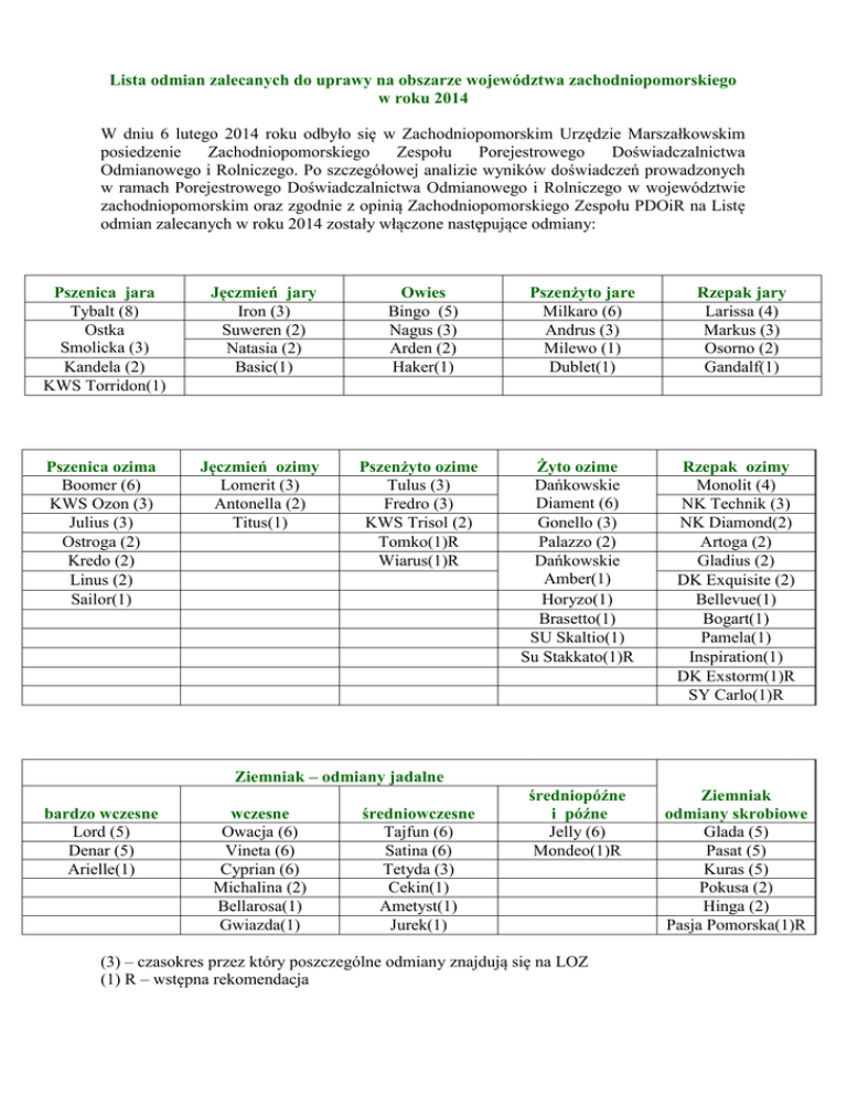 LISTA ZALECANYCH DO UPRAWY ODMIAN (LZO)