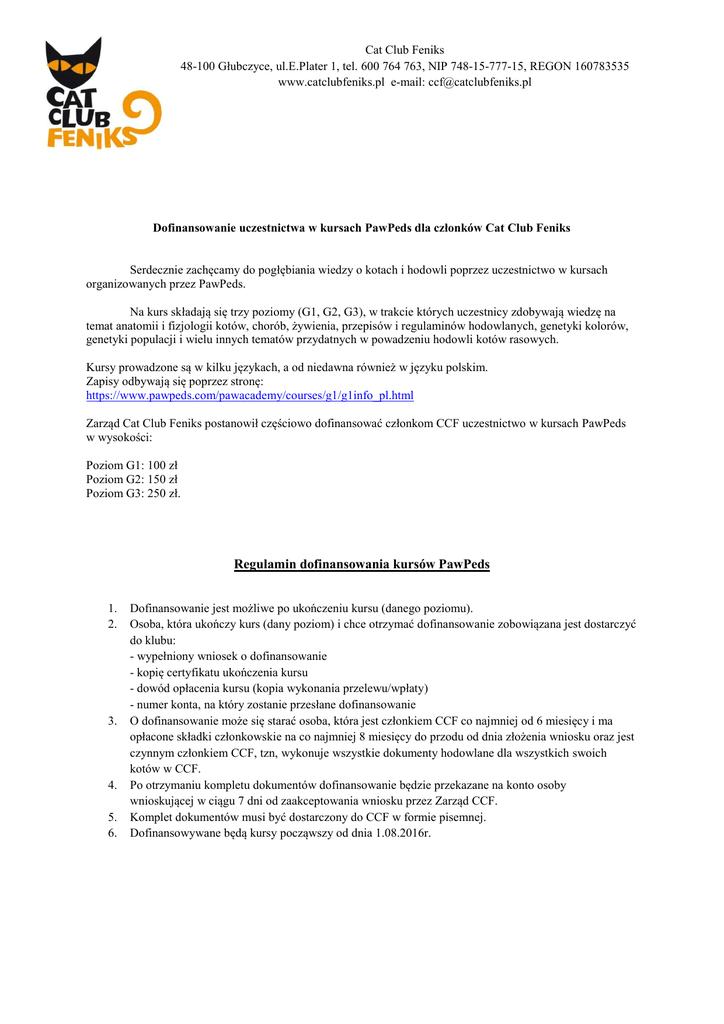 Cat Club Feniks 48-100 Głubczyce, ul.E.Plater 1, tel. 600 764 763, NIP 748-15-777-15, REGON 160783535 www.catclubfeniks.pl e-mail: [email protected] Dofinansowanie uczestnictwa w kursach PawPeds dla członków Cat Club Feniks Serdecznie zachęcamy do pogłębiania wiedzy o kotach i hodowli poprzez uczestnictwo w kursach organizowanych przez PawPeds. Na kurs składają się trzy poziomy (G1, G2, G3), w trakcie których uczestnicy zdobywają wiedzę na temat anatomii i fizjologii kotów, chorób, żywienia, przepisów i regulaminów hodowlanych, genetyki kolorów, genetyki populacji i wielu innych tematów przydatnych w powadzeniu hodowli kotów rasowych. Kursy prowadzone są w kilku językach, a od niedawna również w języku polskim. Zapisy odbywają się poprzez stronę: https://www.pawpeds.com/pawacademy/courses/g1/g1info_pl.html Zarząd Cat Club Feniks postanowił częściowo dofinansować członkom CCF uczestnictwo w kursach PawPeds w wysokości: Poziom G1: 100 zł Poziom G2: 150 zł Poziom G3: 250 zł. Regulamin dofinansowania kursów PawPeds 1. 2. 3. 4. 5. 6. Dofinansowanie jest możliwe po ukończeniu kursu (danego poziomu). Osoba, która ukończy kurs (dany poziom) i chce otrzymać dofinansowanie zobowiązana jest dostarczyć do klubu: - wypełniony wniosek o dofinansowanie - kopię certyfikatu ukończenia kursu - dowód opłacenia kursu (kopia wykonania przelewu/wpłaty) - numer konta, na który zostanie przesłane dofinansowanie O dofinansowanie może się starać osoba, która jest członkiem CCF co najmniej od 6 miesięcy i ma opłacone składki członkowskie na co najmniej 8 miesięcy do przodu od dnia złożenia wniosku oraz jest czynnym członkiem CCF, tzn, wykonuje wszystkie dokumenty hodowlane dla wszystkich swoich kotów w CCF. Po otrzymaniu kompletu dokumentów dofinansowanie będzie przekazane na konto osoby wnioskującej w ciągu 7 dni od zaakceptowania wniosku przez Zarząd CCF. Komplet dokumentów musi być dostarczony do CCF w formie pisemnej. Dofinansowywane będą kursy począwszy od dnia 1.08.2016r.