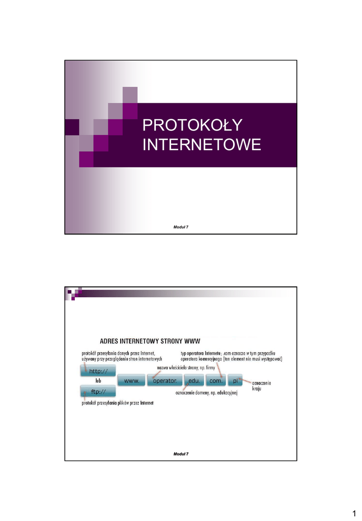 PROTOKOŁY INTERNETOWE Moduł 7 Moduł 7 1 HTTP-Hypertext Transfer Protocol HTTP (protokół internetowy przesyłania dokumentów hipertekstowych) to protokół sieci WWW. Zadaniem stron WWW jest publikowanie informacji – natomiast protokół HTTP właśnie to umożliwia. Protokół HTTP umożliwia komunikowanie się komputerów ze sobą. Moduł 7 Pytanko z testu….. http://www.pti.org.pl to adres witryny internetowej Polskiego Towarzystwa Informatycznego. Jak nazywamy elementy http:// oraz pti.org.pl? a. Protokół i nazwa domeny. b. Serwer i adres. c. Zasób i wskaźnik. d. Nazwa domeny i serwer. Moduł 7 2 FTP- File Transfer Protocol Protokół Transferu Plików – protokół internetowy typu klient-serwer, czyli jedna z usług, które oferuje sieć. Program FTP umożliwia połączenie się z serwerem i przesłanie (najczęściej skopiowanie) na niego danych (np. plików stron internetowych). Moduł 7 Moduł 7 3 Pytanko z testu….. Co oznacza skrót FTP? a. Fast Transfer Provision (zapewnienie szybkiej transmisji). b. False Transmission Prevention (metoda zapobiegania błędom transmisji). c. File Transfer Protocol (protokół przesyłania plików). d. File Transfer Procedure (procedura przesyłania plików). Moduł 7 HTTPS-HyperText Transfer Protocol Secure To szyfrowana wersja protokołu HTTP. Zamiast używać w komunikacji klientserwer niezaszyfrowanego tekstu, szyfruje go za pomocą protokołu SSL. Zapobiega to przechwytywaniu i zmienianiu przesyłanych danych. Moduł 7 4 Moduł 7 Moduł 7 5 Poczta internetowa Moduł 7 Poczta elektroniczna e-poczta (ang. electronic mail, e-mail) to jedna z największych usług internetowych, w prawie zwanych: „usługami świadczonymi drogą elektroniczną”, służąca do przesyłania wiadomości tekstowych (listów elektronicznych). Moduł 7 6 Pytanko z testu….. Z jakich elementów zbudowany jest typowy adres poczty elektronicznej postaci: [email protected]? a. konto_uż[email protected] b. serwer@konto_użytkownika.domena c. [email protected] d. [email protected]_użytkownika Moduł 7 Klient poczty elektronicznej (ang. Mail User Agent MUA) – program pocztowy służący użytkownikowi do odbioru i wysyłania poczty elektronicznej. Moduł 7 7 Programy klient poczty Przykładami programów MUA są: Mozilla Suite Thunderbird Microsoft Outlook Express Pine Mutt The Bat KMail Hellcore Mailer Moduł 7 Moduł 7 8 Moduł 7 Pytanko z testu….. Do czego służą serwery: POP3 i SMTP? a. Serwer SMTP to serwer poczty przychodzącej, a POP3 to serwer poczty wychodzącej. b. Serwer POP3 to serwer poczty przychodzącej, a SMTP to serwer poczty wychodzącej. c. Serwer POP3 to inaczej serwer WWW, a SMTP jest serwerem pocztowym. d. Serwer SMTP to inaczej serwer WWW, a POP3 jest serwerem pocztowym. Moduł 7 9 Pytanko z testu….. Które z poniższych zdań jest całkowicie prawdziwe w odniesieniu do poczty elektronicznej? a. Poczta elektroniczna wyeliminowała potrzebę korzystania z poczty konwencjonalnej. b. Przesyłanie poufnej korespondencji pocztą elektroniczną jest zawsze w pełni bezpieczne. c. Poczta elektroniczna jest tanim medium komunikacyjnym dla przesyłania dokumentów elektronicznych. d. Usługa poczty elektronicznej jest dostępna z każdego miejsca na Ziemi. Moduł 7 Pytanko z testu….. Jakie dane zapisuje się w polach DO, DW i UDW (ang. TO, CC & BCC) podczas redagowania korespondencji elektronicznej? a. Pole DO (ang. TO) – adresat główny, pole DW (ang. CC) – temat listu. b. Pole DO (ang. TO) – adresy głównych odbiorców wiadomości, UDW (ang. BCC) – adresy ukrytych odbiorców. c. Pole DW (ang. CC) – załączane pliki, UDW (ang. BCC) - adresat główny. d. Pole DO (ang. TO) – priorytet wiadomości, UDW (ang. BCC) – załączane pliki. Moduł 7 10 Wyszukiwarka internetowa Moduł 7 Wyszukiwarka internetowa Wyszukiwarka internetowa (ang. search engine) to program lub strona internetowa, której zadaniem jest ułatwienie użytkownikom znalezienie informacji w sieci. Gromadzą w sposób automatyczny informacje o dokumentach tekstowych oraz plikach zgromadzonych w sieci. Moduł 7 11 Moduł 7 Moduł 7 12 Pytanko z testu….. Które z niżej wymienionych serwisów WWW są wyszukiwarkami internetowymi? a.www.altavista.com b. www.pti.org.pl c. www.lublin.pl d. www.ecdl.com. Moduł 7 Pytanko z testu….. Które z niżej wymienionych serwisów WWW są wyszukiwarkami internetowymi? a. www.pti.org.pl oraz www.altavista.com b. www.google.com oraz www.pti.org.pl c. www.netsprint.pl oraz www.google.com d. www.ecdl.com oraz www.plikoskop.pl Moduł 7 13 Netykieta Moduł 7 Netykieta Tym terminem określa się Kulturę Internetową, swojego rodzaju savoir-vivre, który określa specyficzne zasady „bycia” w Sieci. Netykieta (ang. netiquette - net + etiquette, sieć + etyka) obejmuje zbiór zachowań etycznych obowiązujących w sieci Internet. Należy mieć świadomość, że Internet w zasadzie wymyka się wszelkim ograniczeniom i nakazom prawnym, zatem także stosowanie się do zasad Netykiety nie jest przymusem, a jedynie świadomym wyborem. Właściwy sposób zachowania się pozwala na współistnienie wielu różnych grup narodowościowych i ludzi z różnych kręgów kulturowych. Warto zapoznać się z podstawowymi zwyczajami, ukształtowanymi przez samych użytkowników Sieci. Moduł 7 14 Poczta elektroniczna (email) zasady podstawowe: Nigdy nie umieszczaj w listach wiadomości, których nie umieściłbyś na kartce pocztowej, chyba że używasz programów kodujących, które zapewniają odpowiedni poziom bezpieczeństwa Twoim listom. Załóż, że poczta internetowa nie jest całkowicie bezpieczna. Nigdy nie przesyłaj „łańcuszków szczęścia” przy użyciu poczty elektronicznej. Jest to piętnowane w Internecie. Jeśli uznasz, że znaczenie i waga listu usprawiedliwi to, natychmiast wyślij krótkie potwierdzenie otrzymania wiadomości, nawet jeśli później masz zamiar udzielić wyczerpującej odpowiedzi. Staraj si
