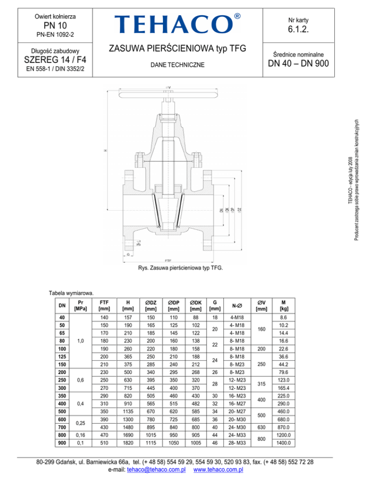Owiert kołnierza Nr karty PN 10 6.1.2. PN-EN 1092-2 ZASUWA PIERŚCIENIOWA typ TFG Długość zabudowy SZEREG 14 / F4 Średnice nominalne DN 40 – DN 900 DANE TECHNICZNE TEHACO - edycja luty 2008 Producent zastrzega sobie prawo wprowadzania zmian konstrukcyjnych EN 558-1 / DIN 3352/2 Rys. Zasuwa pierścieniowa typ TFG. Tabela wymiarowa. FTF [mm] H [mm] ∅DZ [mm] ∅DP [mm] ∅DK [mm] G [mm] N-∅ ∅ 40 140 157 150 110 88 18 4-M18 50 150 190 165 125 102 65 170 210 185 145 122 180 230 200 160 138 100 125 190 200 260 365 220 250 180 210 158 188 150 210 375 285 240 212 200 230 500 340 295 268 250 630 395 350 320 300 270 715 445 400 370 350 290 820 505 460 430 30 16- M23 310 910 565 515 482 32 16- M27 350 1135 670 620 585 34 20- M27 390 1300 780 725 685 36 20- M30 DN 80 250 400 Pr [MPa] 1,0 0,6 0,4 500 600 0,25 20 22 24 26 28 4- M18 4- M18 M [kg] 8.6 160 8- M18 10.2 14.4 16.6 8- M18 8- M18 200 22.6 36.6 8- M23 250 44.2 8- M23 79.6 12- M23 123.0 12- M23 430 1480 895 840 800 40 24- M30 800 0,16 470 1690 1015 950 905 44 24- M33 900 0,1 510 1820 1115 1050 1005 46 28- M33 700 ∅V [mm] 315 400 500 630 800 165.4 225.0 290.0 460.0 680.0 870.0 1200.0 1400.0 80-299 Gdańsk, ul. Barniewicka 66a, tel. (+ 48 58) 554 59 29, 554 59 30, 520 93 83, fax. (+ 48 58) 552 72 28 e-mail: [email protected] www.tehaco.com.pl