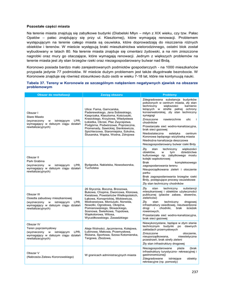 Pozostałe części miasta Na terenie miasta znajdują się zabytkowe budynki (Diabelski Młyn – młyn z XIX wieku, czy tzw. Pałac Opatów – pałac znajdujący się przy ul. Klasztornej), które wymagają renowacji. Problemem występującym na terenie całego miasta są osuwiska, które doprowadzają do niszczenia różnych obiektów i terenów. W mieście występują braki mieszkalnictwa wielorodzinnego, ostatni blok został wybudowany w latach 80. Na terenie miasta znajduje się cmentarz żydowski, a na nim zniszczone nagrobki oraz mury go otaczające, które wymagają renowacji. Jednym z większych problemów na terenie miasta jest zły stan brzegów rzeki oraz niezagospodarowany bulwar nad Brdą. Koronowo posiada bardzo mało zarejestrowanych podmiotów gospodarczych - na 1000 mieszkańców przypada jedynie 77 podmiotów. W mieście dużym problemem jest także długotrwałe bezrobocie. W Koronowie znajduje się również stosunkowo dużo osób w wieku 7-18 lat, które nie kontynuują nauki. Tabela 37. Tereny w Koronowie ze szczególnym natężeniem negatywnych zjawisk na obszarze problemowym Obszar do rewitalizacji Obszar I Stare Miasto (wyznaczony w istniejącym LPR, wymagający w dalszym ciągu działań rewitalizacyjnych) Obszar II Park Grabina (wyznaczony w istniejącym LPR, wymagający w dalszym ciągu działań rewitalizacyjnych) Obszar III Osiedla zabudowy mieszkaniowej (wyznaczony w istniejącym LPR, wymagający w dalszym ciągu działań rewitalizacyjnych) Obszar IV Teren poprzemysłowy (wyznaczony w istniejącym LPR, wymagający w dalszym ciągu działań rewitalizacyjnych) Obszar V (Nabrzeża Zalewu Koronowskiego) Zasięg obszaru Problemy Ulice: Farna, Garncarska, Paderewskiego, Jana Sobieskiego, Kasprzaka, Klasztorna, Kościuszki, Krasickiego, Krzyżowa, Władysława Łokietka, Okrzei, Plac Zwycięstwa, Podgórna, Podwórzowa, Poprzeczna, Promenady, Sawickiej, Sienkiewicza, Spichlerzowa, Staromiejska, Szkolna, Ślusarska, Wąska, Wodna, Zdrojowa Zdegradowana substancja budynków położonych w centrum miasta, zły stan techniczny większości kamienic leżących w strefie pełnej ochrony konserwatorskiej, zły stan techniczny synagogi Zniszczone nawierzchnie ulic i chodników Przestarzała sieć wodno-kanalizacyjna, brak sieci gazowej Niedostateczna estetyka centrum Koronowa będącego wizytówką miasta Niedrożna kanalizacja deszczowa Niezagospodarowany bulwar rzeki Brdy Bydgoska, Nakielska, Nowodworska, Tucholska Zły stan techniczny większości obiektów, w tym dziedzictwa kulturowego np. zabytkowego mostu kolejki wąskotorowej Brak kompleksowego zagospodarowania terenu Nieuporządkowana zieleń i otoczenie parku Brak zagospodarowania brzegów rzeki Brdy, postępujące procesy osuwiskowe Zły stan techniczny chodników 26 Stycznia, Boczna, Brzozowa, Bukowa, Chopina, Dworcowa, Klonowa, Kwiatowa, Powstańców Wielkopolskich, Łąkowa, Konopnickiej, Mickiewicza, Modrzewiowa, Moniuszki, Norwida, Nowotki, Ogrodowa, Okrężna, Pomianowskiego, Słowackiego, Sosnowa, Świerkowa, Topolowa, Wąskotorowa, Witosa, Wyczółkowskiego, Zawadzkiego Zły stan techniczny substancji mieszkaniowej i obiektów użyteczności publicznej (placów zabaw, skwerów, zieleńców) Zły stan techniczny drogowej infrastruktury osiedlowej, nieutwardzone drogi i chodniki, brak ścieżek rowerowych, Przestarzała sieć wodno-kanalizacyjna, brak sieci gazowej Aleje Wolności, Jęczmienna, Kolejowa, Łubinowa, Makowa, Przemysłowa, Różana, Sportowa, Szosa Kotomierska, Targowa, Zbożowa, Niewykorzystane, będące w złym stanie technicznym budynki po dawnych zakładach przemysłowych Zniszczone otoczenie, nieuporządkowana, nieestetyczna przestrzeń, brak strefy zieleni Zły stan infrastruktury drogowej W granicach administracyjnych miasta Niezagospodarowane plaże (brak infrastruktury turystyczno- rekreacyjnej i gastronomicznej) Zdegradowane istniejące obiekty rekreacyjne (np. pomosty) 237