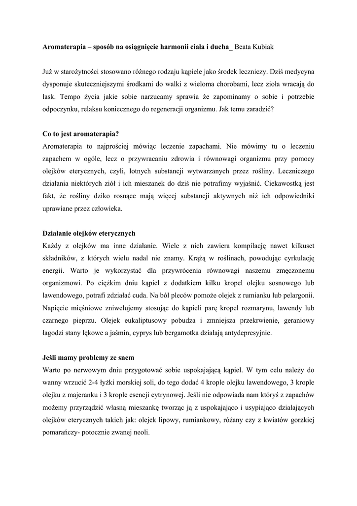 Aromaterapia – sposób na osiągnięcie harmonii ciała i ducha_ Beata Kubiak Już w starożytności stosowano różnego rodzaju kąpiele jako środek leczniczy. Dziś medycyna dysponuje skuteczniejszymi środkami do walki z wieloma chorobami, lecz zioła wracają do łask. Tempo życia jakie sobie narzucamy sprawia że zapominamy o sobie i potrzebie odpoczynku, relaksu koniecznego do regeneracji organizmu. Jak temu zaradzić? Co to jest aromaterapia? Aromaterapia to najprościej mówiąc leczenie zapachami. Nie mówimy tu o leczeniu zapachem w ogóle, lecz o przywracaniu zdrowia i równowagi organizmu przy pomocy olejków eterycznych, czyli, lotnych substancji wytwarzanych przez rośliny. Leczniczego działania niektórych ziół i ich mieszanek do dziś nie potrafimy wyjaśnić. Ciekawostką jest fakt, że rośliny dziko rosnące mają więcej substancji aktywnych niż ich odpowiedniki uprawiane przez człowieka. Działanie olejków eterycznych Każdy z olejków ma inne działanie. Wiele z nich zawiera kompilację nawet kilkuset składników, z których wielu nadal nie znamy. Krążą w roślinach, powodując cyrkulację energii. Warto je wykorzystać dla przywrócenia równowagi naszemu zmęczonemu organizmowi. Po ciężkim dniu kąpiel z dodatkiem kilku kropel olejku sosnowego lub lawendowego, potrafi zdziałać cuda. Na ból pleców pomoże olejek z rumianku lub pelargonii. Napięcie mięśniowe zniwelujemy stosując do kąpieli parę kropel rozmarynu, lawendy lub czarnego pieprzu. Olejek eukaliptusowy pobudza i zmniejsza przekrwienie, geraniowy łagodzi stany lękowe a jaśmin, cyprys lub bergamotka działają antydepresyjnie. Jeśli mamy problemy ze snem Warto po nerwowym dniu przygotować sobie uspokajającą kąpiel. W tym celu należy do wanny wrzucić 2-4 łyżki morskiej soli, do tego dodać 4 krople olejku lawendowego, 3 krople olejku z majeranku i 3 krople esencji cytrynowej. Jeśli nie odpowiada nam któryś z zapachów możemy przyrządzić własną mieszankę tworząc ją z uspokajająco i usypiająco działających olejków eterycznych takich jak: olejek lipowy, rumiankowy, różany czy z kwiatów gorzkiej pomarańczy- potocznie zwanej neoli. Olejki eteryczne wspomagają też terapię konwencjonalną. Gdy czujemy pierwsze objawy nadciągającego przeziębienia możemy wesprzeć organizm w walce z chorobą, przygotowując sobie kąpielą aromatyczną z dodatkiem mieszanki olejków aromatycznych, takich jak cytrynowy, anyżowy, rozmarynowy, eukaliptusowy czy olejek z drzewa herbacianego. Aromaterapii nie należy stosować bez konsultacji z lekarzem, w przypadku występowania alergii skórnych czy oddechowych. Jeśli chcemy stosować częściej aromaterapię, warto zasięgnąć rady praktykującego zielarza.