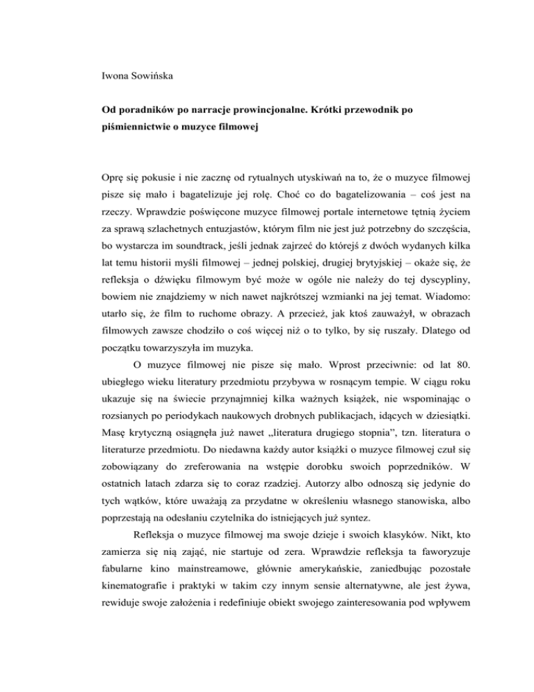 Iwona Sowińska Od poradników po narracje prowincjonalne. Krótki przewodnik po piśmiennictwie o muzyce filmowej Oprę się pokusie i nie zacznę od rytualnych utyskiwań na to, że o muzyce filmowej pisze się mało i bagatelizuje jej rolę. Choć co do bagatelizowania – coś jest na rzeczy. Wprawdzie poświęcone muzyce filmowej portale internetowe tętnią życiem za sprawą szlachetnych entuzjastów, którym film nie jest już potrzebny do szczęścia, bo wystarcza im soundtrack, jeśli jednak zajrzeć do którejś z dwóch wydanych kilka lat temu historii myśli filmowej – jednej polskiej, drugiej brytyjskiej – okaże się, że refleksja o dźwięku filmowym być może w ogóle nie należy do tej dyscypliny, bowiem nie znajdziemy w nich nawet najkrótszej wzmianki na jej temat. Wiadomo: utarło się, że film to ruchome obrazy. A przecież, jak ktoś zauważył, w obrazach filmowych zawsze chodziło o coś więcej niż o to tylko, by się ruszały. Dlatego od początku towarzyszyła im muzyka. O muzyce filmowej nie pisze się mało. Wprost przeciwnie: od lat 80. ubiegłego wieku literatury przedmiotu przybywa w rosnącym tempie. W ciągu roku ukazuje się na świecie przynajmniej kilka ważnych książek, nie wspominając o rozsianych po periodykach naukowych drobnych publikacjach, idących w dziesiątki. Masę krytyczną osiągnęła już nawet „literatura drugiego stopnia”, tzn. literatura o literaturze przedmiotu. Do niedawna każdy autor książki o muzyce filmowej czuł się zobowiązany do zreferowania na wstępie dorobku swoich poprzedników. W ostatnich latach zdarza się to coraz rzadziej. Autorzy albo odnoszą się jedynie do tych wątków, które uważają za przydatne w określeniu własnego stanowiska, albo poprzestają na odesłaniu czytelnika do istniejących już syntez. Refleksja o muzyce filmowej ma swoje dzieje i swoich klasyków. Nikt, kto zamierza się nią zająć, nie startuje od zera. Wprawdzie refleksja ta faworyzuje fabularne kino mainstreamowe, głównie amerykańskie, zaniedbując pozostałe kinematografie i praktyki w takim czy innym sensie alternatywne, ale jest żywa, rewiduje swoje założenia i redefiniuje obiekt swojego zainteresowania pod wpływem impulsów płynących zewsząd: ze strony praktyki filmowej i muzycznej, teorii i historii filmu, muzykologii, zmian w pejzażu medialnym, ogólnych przemian kultury i nauk o niej. Dlatego nie da się jej ani wyczerpująco scharakteryzować, ani sporządzić kompletnej listy podejmowanych przez nią tematów, ani nawet wyliczyć „dyspozytywów”, które obecnie wykorzystuje. Wybieram więc to tylko, co o muzyce filmowej napisano, z tego zaś – teksty niedoraźne, takie, które inspirowały następców i rezonowały w ich pracach. 1895–1925: Epoka poradników Najwcześniejsze teksty o muzyce w kinie – nikt nie nazywał jej wtedy filmową – były odpowiedzią na potrzeby praktyczne. Praktycy – kompozytorzy, akompaniatorzy, autorzy kompilacji – instruowali muzyków, co i jak należy grać podczas projekcji niemych filmów („Nie za głośno – ostrzegał autor jednego z takich poradników – ale na wszelki wypadek ciągle trzymaj nogę na pedale”). Piśmiennictwo dotyczące styku muzyki i kina zaczęło się od specjalnych rubryk w prasie branżowej, adresowanych do kiniarzy i zatrudnionych w kinach muzyków, i od antologii utworów stosownych w różnych filmowych sytuacjach. Można z tych źródeł wywnioskować, jaką muzykę w pierwszych trzech dekadach XX wieku uważano za prawidłową, czyli funkcjonalną, a także jak ten ideał ewoluował z czasem. Miała ona uatrakcyjniać nie tyle sam film, ile okoliczności, w jakich go oglądano. Do jej związku z fabułą (trzeba zresztą pamiętać, że we wczesnych filmach nie było fabuły w dzisiejszym sensie) nie przywiązywano wagi, gdyż muzyka stanowiła aspekt projekcji, a nie produkcji filmu. Długo służyła nie poszczególnym filmom, lecz całemu seansowi. 1926–1957: Kanon i opór W okresie przełomu dźwiękowego, obejmującego lata 1926–1930 (poza USA proces przechodzenia na dźwięk trwał dłużej), sposoby pisania o muzyce filmowej znacząco się różnicują. Rejestracja i użycie muzyki w filmach dźwiękowych nastręczało problemy tyleż estetyczne, co techniczne. Jedne i drugie stały się tematem wypowiedzi krytyków, muzyków i dźwiękowców, reprezentujących nową profesję w branży filmowej. Wyłomem w dotychczasowej, zmonopolizowanej przez zawodowców tradycji było słynne oświadczenie z 1928 roku Przyszłość filmu dźwiękowego. Innowacja, podpisane przez trzech radzieckich reżyserów – Siergieja Eisensteina, Wsiewołoda Pudowkina i Grigorija Aleksandrowa, którzy w chwili jego ogłoszenia nie mieli doświadczeń z dźwiękiem, a okazja, by je zdobyć, nieprędko im się nadarzyła. Mieli za to pomysł. Potraktowali dźwięk filmowy jako całość (o muzyce, a właściwie tylko o musicalach, napomknęli jedynie w przypisie), postulując konsekwentne przeciwstawianie warstwy dźwiękowej obrazowi. Z tego radykalizmu, intrygującego wyłącznie jako czysta spekulacja, w swej późniejszej twórczości wszyscy trzej się wycofali; inna rzecz, że czasy przestały mu sprzyjać. W pierwszej połowie lat 30. krystalizują się i krzepną konwencje hollywoodzkiej muzyki filmowej, które obowiązywały aż do połowy lat 50. W przyszłości nazwie się ją „klasyczną”. Zaskakująco wcześnie, bo już w połowie lat 30., ukazały się w przekładzie na angielski dwie ambitne prace: w 1935 roku książka Music for the Films Leonida Sabaniejewa, rosyjskiego kompozytora mieszkającego na Zachodzie, natomiast w 1936 roku Film Music Kurta Londona, niemieckiego kompozytora i publicysty. Mimo dzielących je różnic – Sabaniejew napisał podręcznik dla kompozytorów i dyrygentów, London pokusił się o naszkicowanie historii muzyki filmowej i sformułowanie prognoz na przyszłość – wspólna 