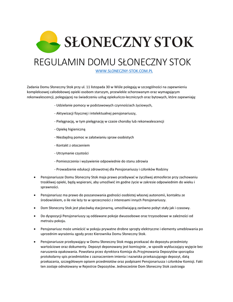 REGULAMIN DOMU SŁONECZNY STOK WWW.SLONECZNY-STOK.COM.PL Zadania Domu Słoneczny Stok przy ul. 11 listopada 30 w Wiśle polegają w szczególności na zapewnieniu kompleksowej całodobowej opieki osobom starszym, przewlekle schorowanym oraz wymagającym rekonwalescencji, polegającej na świadczeniu usług opiekuńczo-leczniczych oraz bytowych, które zapewniają: - Udzielanie pomocy w podstawowych czynnościach życiowych, - Aktywizacji fizycznej i intelektualnej pensjonariuszy, - Pielęgnację, w tym pielęgnację w czasie choroby lub rekonwalescencji - Opiekę higieniczną - Niezbędną pomoc w załatwianiu spraw osobistych - Kontakt z otoczeniem - Utrzymanie czystości - Pomieszczenia i wyżywienie odpowiednie do stanu zdrowia - Prowadzenie edukacji zdrowotnej dla Pensjonariuszy i członków Rodziny • Pensjonariusze Domu Słoneczny Stok maja prawo przebywać w życzliwej atmosferze przy zachowaniu troskliwej opieki, będą wspierani, aby umożliwić im godne życie w zakresie odpowiednim do wieku i sprawności. • Pensjonariusz ma prawo do poszanowania godności osobistej własnej autonomii, kontaktu ze środowiskiem, o ile nie leży to w sprzeczności z interesami innych Pensjonariuszy. • Dom Słoneczny Stok jest placówką stacjonarną, umożliwiającą zarówno pobyt stały jak i czasowy. • Do dyspozycji Pensjonariuszy są oddawane pokoje dwuosobowe oraz trzyosobowe w zależności od metrażu pokoju. • Pensjonariusz może umieścić w pokoju prywatne drobne sprzęty elektryczne i elementy umeblowania po uprzednim wyrażeniu zgody przez Kierownika Domu Słoneczny Stok. • Pensjonariusze przebywający w Domu Słoneczny Stok mogą przekazać do depozytu przedmioty wartościowe oraz dokumenty. Depozyt deponowany jest komisyjnie , w sposób wykluczający wyjęcie bez naruszenia opakowania. Powołana przez dyrektora Komisja ds.Przyjmowania Depozytów sporządza protokolarny spis przedmiotów z zaznaczeniem imienia i nazwiska przekazującego depozyt, datą przekazania, szczegółowym opisem przedmiotów oraz podpisami Pensjonariusza i członków Komisji. Fakt ten zostaje odnotowany w Rejestrze Depozytów. Jednocześnie Dom Słoneczny Stok zastrzega przyjmowanie przedmiotów do łącznej wartości 10 000zł. W przypadku kiedy wartość depozytu jest większa , Pensjonariusz jest zobowiązany do wykupienia kosztem własnym osobnego ubezpieczenia. • Oprócz pokoi do dyspozycji Pensjonariusza są oddane części wspólne: - Sala aktywności dziennej - Sala rehabilitacyjna - Pokój terapii zajęciowej - Kącik czytelniczy - Aneksy kuchenne - Taras i balkon widokowy -Ogródek letni z namiotem całorocznym -Parking • Usługi związane z pobytem w Domu Słoneczny Stok w odnośniku pierwszym udzielane są na zasadzie pełnej odpłatności na podstawie umowy cywilno-prawnej zawartej pomiędzy Domem Słoneczny-Stok a Pensjonariuszem lub jego opiekunem prawnym w przypadku osób częściowo lub całkowicie ubezwłasnowolnionych. • Szczegółowy wykaz usług zawiera załącznik nr 1 do umowy o świadczenie usług. • Wszelkie inne usługi, które nie zostały zawarte w wykazie świadczeń dodatkowych pozostają przedmiotem indywidualnego zamówienia oraz wyceny. • Pracą w Domu Opieki Słoneczny Stok kieruje Dyrektor. • Osoba ubiegająca się o przyjęcie do Domu Opieki Słoneczny Stok jest zobowiązana do wypełnienia kwestionariusza określającego preferencje Pensjonariusza oraz dostarczenia pełnej dokumentacji medycznej i innych dokumentów mogących określić stan zdrowotny (karty informacyjne leczenia szpitalnego, wyniki badan oraz konsultacji, informacja o stanie zdrowia od lekarza POZ, zalecenia odnośnie farmakoterapii). • Decyzja o przyjęciu do ośrodka podejmowana jest przez zespół terapeutyczny: Lekarza Głównego oraz Pielęgniarkę Główną. • W dniu przyjęcia do Domu Opieki pensjonariusz jest zapoznawany z personelem, topografią obiektu, obowiązującym regulaminem, w szczególności z harmonogramem dnia, wizyt .Dokumentacja Pensjonariusza jest weryfikowana i analizowana przez zespół lekarsko-pielęgniarsko-terapeutyczny. W trakcie pierwszego tygodnia pobytu, który jest traktowany jako okres adaptacyjny, dobierany zostaje indywidualny plan opieki i zakresu rehabilitacji (rehabilitacja ogólnoustrojowa, neuropsychologiczna) oraz terapii zajęciowej. • W skład Zespołu Terapeutycznego wchodzą: - Lekarze - Pielęgniarki - Opiekunowie medyczni - Terapeuta/psycholog zajęciowy - Fizjoterapeuta • Do zadań lekarza należy w szczególności: - ocena stanu zdrowia Pensjonariusza poprzez badanie przedmiotowe i podmiotowe - wykonanie testów lub zlecanie wykonania badań dodatkowych, a w szczególności laboratoryjnych i obrazowych - wystawianie zlecenia na konsultacje specjalistyczne w celu dalszej diagnostyki i leczenia , w przypadku gdy uzna to za konieczne - kierowanie Pensjonariusza do jednostek lecznictwa zamkniętego w celu dalszej diagnostyki i leczenia, w przypadku gdy uzna to za konieczne - dokonywanie interpretacji wyników badań i konsultacji - planowanie i uzgadnianie z Zespołem Terapeutycznym planu postępowania terapeutycznego stosownie do stanu fizyczno-psychicznego Pensjonariusza - zlecanie i monitorowanie leczenia farmakologicznego • Do zadań pielęgniarki/pielęgniarza należy w szczególności : 1. Ponoszenie odpowiedzialności za bezpośrednią opiekę nad Pensjonariuszami w zakresie procesu pielęgnowania, rozpoznania problemów pielęgnacyjnych, planowania działań na rzecz podopiecznych i ich środowiska 2. Realizowanie zadań w oparciu o standardy obowiązujące w Domy z całodobową opieką medyczną, dotyczące: - przyjęcia Pensjonariusza do Domu z całodobową opieką medyczną i ułatwienie adaptacji do nowego środowiska - wykonywania czynności związanych z utrzymaniem higieny Pensjonariuszy - wykonywania czynności wspierających funkcję oddychania - pomagania podopiecznym w żywieniu i wydalaniu - zapewnienia wygo
