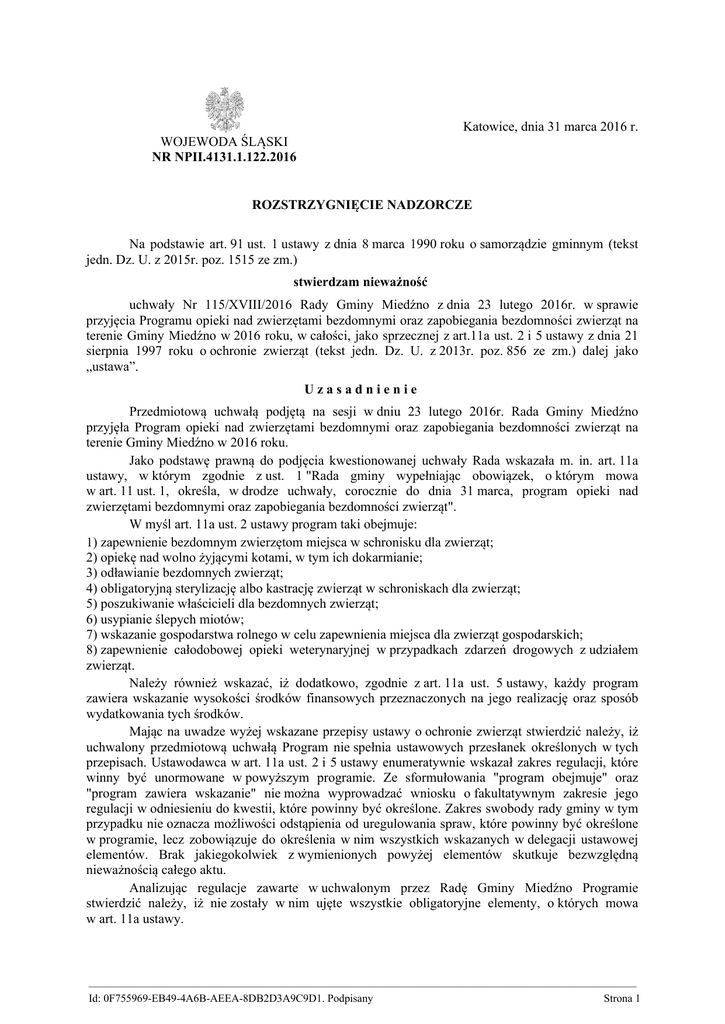 Katowice, dnia 31 marca 2016 r. WOJEWODA ŚLĄSKI NR NPII.4131.1.122.2016 ROZSTRZYGNIĘCIE NADZORCZE Na podstawie art. 91 ust. 1 ustawy z dnia 8 marca 1990 roku o samorządzie gminnym (tekst jedn. Dz. U. z 2015r. poz. 1515 ze zm.) stwierdzam nieważność uchwały Nr 115/XVIII/2016 Rady Gminy Miedźno z dnia 23 lutego 2016r. w sprawie przyjęcia Programu opieki nad zwierzętami bezdomnymi oraz zapobiegania bezdomności zwierząt na terenie Gminy Miedźno w 2016 roku, w całości, jako sprzecznej z art.11a ust. 2 i 5 ustawy z dnia 21 sierpnia 1997 roku o ochronie zwierząt (tekst jedn. Dz. U. z 2013r. poz. 856 ze zm.) dalej jako „ustawa”. Uzasadnienie Przedmiotową uchwałą podjętą na sesji w dniu 23 lutego 2016r. Rada Gminy Miedźno przyjęła Program opieki nad zwierzętami bezdomnymi oraz zapobiegania bezdomności zwierząt na terenie Gminy Miedźno w 2016 roku. Jako podstawę prawną do podjęcia kwestionowanej uchwały Rada wskazała m. in. art. 11a ustawy, w którym zgodnie z ust. 1 "Rada gminy wypełniając obowiązek, o którym mowa w art. 11 ust. 1, określa, w drodze uchwały, corocznie do dnia 31 marca, program opieki nad zwierzętami bezdomnymi oraz zapobiegania bezdomności zwierząt". W myśl art. 11a ust. 2 ustawy program taki obejmuje: 1) zapewnienie bezdomnym zwierzętom miejsca w schronisku dla zwierząt; 2) opiekę nad wolno żyjącymi kotami, w tym ich dokarmianie; 3) odławianie bezdomnych zwierząt; 4) obligatoryjną sterylizację albo kastrację zwierząt w schroniskach dla zwierząt; 5) poszukiwanie właścicieli dla bezdomnych zwierząt; 6) usypianie ślepych miotów; 7) wskazanie gospodarstwa rolnego w celu zapewnienia miejsca dla zwierząt gospodarskich; 8) zapewnienie całodobowej opieki weterynaryjnej w przypadkach zdarzeń drogowych z udziałem zwierząt. Należy również wskazać, iż dodatkowo, zgodnie z art. 11a ust. 5 ustawy, każdy program zawiera wskazanie wysokości środków finansowych przeznaczonych na jego realizację oraz sposób wydatkowania tych środków. Mając na uwadze wyżej wskazane przepisy ustawy o ochronie zwierząt stwierdzić należy, iż uchwalony przedmiotową uchwałą Program nie spełnia ustawowych przesłanek określonych w tych przepisach. Ustawodawca w art. 11a ust. 2 i 5 ustawy enumeratywnie wskazał zakres regulacji, które winny być unormowane w powyższym programie. Ze sformułowania "program obejmuje" oraz "program zawiera wskazanie" nie można wyprowadzać wniosku o fakultatywnym zakresie jego regulacji w odniesieniu do kwestii, które powinny być określone. Zakres swobody rady gminy w tym przypadku nie oznacza możliwości odstąpienia od uregulowania spraw, które powinny być określone w programie, lecz zobowiązuje do określenia w nim wszystkich wskazanych w delegacji ustawowej elementów. Brak jakiegokolwiek z wymienionych powyżej elementów skutkuje bezwzględną nieważnością całego aktu. Analizując regulacje zawarte w uchwalonym przez Radę Gminy Miedźno Programie stwierdzić należy, iż nie zostały w nim ujęte wszystkie obligatoryjne elementy, o których mowa w art. 11a ustawy. —————————————————————————————————————————————————— Id: 0F755969-EB49-4A6B-AEEA-8DB2D3A9C9D1. Podpisany Strona 1 Zdaniem organu nadzoru w niniejszym Programie brak jest konkretnych regulacji związanych z odławianiem bezdomnych zwierząt (art. 11a ust. 2 pkt 3 ustawy). W § 9 ust. 1 Programu Rada postanowiła, iż odławianie bezdomnych zwierząt z terenu gminy Miedźno realizuje uprawniony podmiot, z którym gmina ma podpisaną stosowną umowę. Bezdomne zwierzęta domowe – zgodnie z § 9 ust. 2 Programu - są przewożone do Schroniska, a w przypadku zwierząt rannych również do gabinetu leczniczego. Natomiast, w myśl § 9 ust. 3 Programu bezdomne zwierzęta gospodarskie przewożone są do gospodarstwa. Brak jest natomiast w Programie istotnych kwestii związanych z odławianiem zwierząt bezdomnych w gminie, a mianowicie określenia – stosownie do wymogu § 2 rozporządzenia Ministra Spraw Wewnętrznych i Administracji z dnia 26 sierpnia 1998r. w sprawie zasad i warunków wyłapywania bezdomnych zwierząt (Dz. U. Nr 116 poz. 753) - czy wyłapywanie bezdomnych zwierząt ma charakter stały, czy też okresowy, wskazania sposobu przeprowadzania odławiania itp. Zatem obowiązek wnikający z art. 11a ust. 2 pkt 3 ustawy nie został w pełni zrealizowany (por. wyrok Wojewódzkiego Sądu Administracyjnego we Wrocławiu z dnia 17 grudnia 2013r. sygn. akt II SA/Wr 774/13, publ. Centralna Baza Orzeczeń Sądów Administracyjnych). Na marginesie należy zaznaczyć, iż odławianie ma dotyczyć – zgodnie z art. 11a ust. 2 pkt 3 ustawy – wszystkich zwierząt bezdomnych, a nie jak uregulowała to Rada w § 9 ust. 2 Programu włącznie bezdomnych zwierząt domowych. W niniejszym Programie brak jest również konkretnych regulacji związanych z poszukiwaniem właścicieli dla bezdomnych zwierząt (art. 11a ust. 2 pkt 5 ustawy). Realizacja obowiązku nałożonego tym przepisem musi opierać się na wskazaniu konkretnych działań podejmowanych przez Gminę w celu pozyskiwania nowych właścicieli dla bezdomnych zwierząt. Tymczasem, w § 11 Programu Rada Gminy wskazała jedynie podmioty realizujące wskazane zadanie. Rada Gminy nie wskazała natomiast jakie konkretnie działania będą podejmowane przez wymienione podmioty, w celu pozyskania nowych właścicieli. Nadto, z art. 11a ust. 5 ustawy wynika, że przyjęty przez Radę Gminy program opieki nad zwierzętami bezdomnymi oraz zapobiegania bezdomności zwierząt winien zawierać wskazanie wysokości środków finansowych przeznaczonych na jego realizację oraz sposób wydatkowania tych środków. W ocenie organu nadzoru Rada powyższego obowiązku w całości nie wypełniła; nie wskazała bowiem sposobu wydatkowania środków finansowych przeznaczonych na realizację