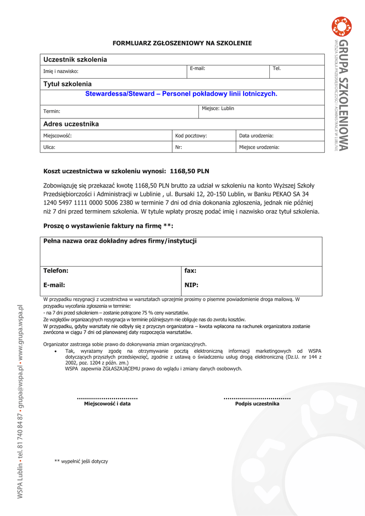 FORMLUARZ ZGŁOSZENIOWY NA SZKOLENIE Uczestnik szkolenia E-mail: Imię i nazwisko: Tel. Tytuł szkolenia Stewardessa/Steward – Personel pokładowy linii lotniczych. Miejsce: Lublin Termin: Adres uczestnika Miejscowość: Kod pocztowy: Data urodzenia: Ulica: Nr: Miejsce urodzenia: Koszt uczestnictwa w szkoleniu wynosi: 1168,50 PLN Zobowiązuję się przekazać kwotę 1168,50 PLN brutto za udział w szkoleniu na konto Wyższej Szkoły Przedsiębiorczości i Administracji w Lublinie , ul. Bursaki 12, 20-150 Lublin, w Banku PEKAO SA 34 1240 5497 1111 0000 5006 2380 w terminie 7 dni od dnia dokonania zgłoszenia, jednak nie później niż 7 dni przed terminem szkolenia. W tytule wpłaty proszę podać imię i nazwisko oraz tytuł szkolenia. Proszę o wystawienie faktury na firmę **: Pełna nazwa oraz dokładny adres firmy/instytucji Telefon: fax: E-mail: NIP: W przypadku rezygnacji z uczestnictwa w warsztatach uprzejmie prosimy o pisemne powiadomienie droga mailową. W przypadku wycofania zgłoszenia w terminie: - na 7 dni przed szkoleniem – zostanie potrącone 75 % ceny warsztatów. Ze względów organizacyjnych rezygnacja w terminie późniejszym nie obliguje nas do zwrotu kosztów. W przypadku, gdyby warsztaty nie odbyły się z przyczyn organizatora – kwota wpłacona na rachunek organizatora zostanie zwrócona w ciągu 7 dni od planowanej daty rozpoczęcia warsztatów. Organizator zastrzega sobie prawo do dokonywania zmian organizacyjnych.  Tak, wyrażamy zgodę na otrzymywanie pocztą elektroniczną informacji marketingowych od WSPA dotyczących przyszłych przedsięwzięć, zgodnie z ustawą o świadczeniu usług drogą elektroniczną (Dz.U. nr 144 z 2002, poz. 1204 z późn. zm.) WSPA zapewnia ZGŁASZAJĄCEMU prawo do wglądu i zmiany danych osobowych. ………………………… Miejscowość i data ** wypełnić jeśli dotyczy …………………………… Podpis uczestnika