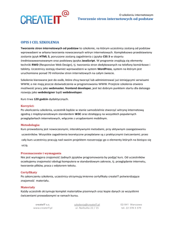 O szkoleniu internetowym Tworzenie stron internetowych od podstaw OPIS I CEL SZKOLENIA Tworzenie stron internetowych od podstaw to szkolenie, na którym uczestnicy zostaną od podstaw wprowadzeni w arkana tworzenia nowoczesnych witryn internetowych. Kompleksowo przedstawiony zostanie język HTML 5, poruszone zostaną zagadnienia z języka CSS 3 w stopniu średniozaawansowanym oraz podstawy języka JavaScript. W programie znajdują się elementy techniki RWD (Responsive Web Design), tj. tworzenia stron dedykowanych na telefony komórkowe i tablety. Uczestnicy zostają również wprowadzeni w system WordPress, system na którym jest uruchomione ponad 70 milionów stron internetowych na całym świecie. Szkolenie kierowane jest do osób, które chcą tworzyć lub administrować już istniejącymi serwisami WWW, a nie mają jeszcze doświadczenia w programowaniu WWW. Przejście szkolenia otwiera możliwość pracy jako webmaster, frontend developer, jest też dobrym punktem startu dla dalszego rozwoju jako webdesigner bądź webdeveloper. Kurs trwa 120 godzin dydaktycznych. Korzyści: Po ukończeniu szkolenia, uczestnik będzie w stanie samodzielnie stworzyć witrynę internetową zgodną z międzynarodowym standardem W3C oraz działającą na wszystkich popularnych przeglądarkach internetowych, włącznie z urządzeniami mobilnym. Metodologia: Kurs prowadzony jest nowoczesnymi, interaktywnymi metodami, przy aktywnym zaangażowaniu uczestników. Wszystkie zagadnienia teoretyczne przeplatane są z praktycznymi ćwiczeniami; przez cały kurs uczestnicy pracują nad swoim projektem rozszerzając go o elementy których na bieżąco się uczą. Przeznaczenie i wymagania Nie jest wymagana znajomość żadnych języków programowania by podjąć kurs. Od uczestników oczekujemy znajomości obsługi komputera w standardowym zakresie, tj. przeglądanie internetu, tworzenie plików, praca z edytorem tekstu. Certyfikaty Po zakonczeniu szkolenia, uczestnicy otrzymują imienne certyfikaty createIT potwierdzające znajomość materiału. Materiały Każdy uczestnik otrzymuje komplet materiałów pisemnych oraz kopie danych ze wszystkimi ćwiczeniami prowadzonymi w ramach kursu. createIT s.c. www.createIT.pl [email protected] ul. Narbutta 22 / 15 02-541 Warszawa tel. 22 378 3 379 O szkoleniu internetowym Tworzenie stron internetowych od podstaw PROGRAM SZKOLENIA 1. Zasada działania stron internetowych o Architektura klient - serwer o Protokół HTTP o Formularze o Rodzaje stron internetowych o Ogólne wprowadzenie do technologii wykorzystywanych do tworzenia stron internetowych o Przeglądarki stron internetowych o Edytory stron internetowych o Przydatne wtyczki do stron internetowych o Zasada działania domen internetowych, rejestracja domeny o Zakładanie konta na serwerze hostingowym 2. Język HTML 5 o Podstawowa składnia o Wprowadzenie do frameworku Bootstrap o Struktura strony WWW o Podstawowe znaczniki o Formatowanie czcionek o Wstawianie list wypunktowanych i numerowanych o Paragrafy o Linki (odsyłacze) o Elementy graficzne – osadzanie, najpopularniejsze formaty createIT s.c. www.createIT.pl [email protected] ul. Narbutta 22 / 15 02-541 Warszawa tel. 22 378 3 379 O szkoleniu internetowym Tworzenie stron internetowych od podstaw o Nagłówki o Tabela, komórki o Walidacja kodu HTML zgodnie ze standardami W3C 3. Język CSS 3 - kaskadowych arkuszy stylów o Osadzanie stylów w kodzie, osadzanie stylów w zewnętrznych plikach o Podstawowe selektory CSS na przykładzie sterowania wyglądem paragrafów o Zaawansowane selektory CSS o Sterowanie wyglądem list, tabel za pomocą CSS o Różnice pomiędzy przeglądarkami WWW, pułapki i zachowania nieoczywiste o Pozycjonowanie warstw za pomocą CSS o Box-model 4. Podstawy Responsive Web Design o Instrukcja CSS media query o Zastosowanie o Najczęściej stosowane techniki RWD 5. Język JavaScript o Opis możliwości języka o Podstawowe instrukcje (pętle, instrukcje warunkowe, funkcje) o Sposoby osadzania skryptów JavaScript w kodzie strony o Wprowadzenie do jQuery 6. WordPress – najpopularniejszy system zarządzania treścią o Wprowadzenie – możliwości systemu, o Instalacja, createIT s.c. www.createIT.pl [email protected] ul. Narbutta 22 / 15 02-541 Warszawa tel. 22 378 3 379 O szkoleniu internetowym Tworzenie stron internetowych od podstaw o Obsługa panelu administracyjnego, o Konfiguracja systemu, o Podstawowe narzędzia, o Co to jest theme i jak go uruchomić, o Podstawowe znaczniki, o Shortcodes – czym są i jak ich używać, o Widgety, o Pluginy, o Czym są media i jak ich używać, o Tworzenie nowego posta, o Tworzenie nowej strony, o Jak stworzyć menu, o Tworzenie galerii, o WordPress a zastosowanie HTML5 CSS3, 7. Implementacja własnego projektu – praktyki pod okiem instruktora o Zasada działania Systemów Zarządzania Treścią (CMS) o Instalacja WordPress o Wypełnienie systemu treścią o Korzystanie z szablonów i rozszerzeń createIT s.c. www.createIT.pl [email protected] ul. Narbutta 22 / 15 02-541 Warszawa tel. 22 378 3 379