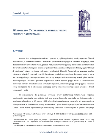 Dawid Lipski WŁADYSŁAWA TATARKIEWICZA ANALIZA SYSTEMU FILOZOFII ARYSTOTELESA 1. Wstęp Artykuł jest próbą przedstawienia i pewnej krytyki oryginalnej analizy systemu filozofii Arystotelesa, a dokładnie układu i znaczenia podstawowych pojęć w systemie Stagiryty, jakiej dokonał Władysław Tatarkiewicz, przede wszystkim w swojej pracy doktorskiej Die Disposition der aristotelischen Prinzipien, znanej w polskim tłumaczeniu pod tytułem: Układ pojęć w filozofii Arystotelesa 1 . Autor próbując uchwycić całokształt filozofii Arystotelesa, poprzez analizę głównych jej pojęć, postawił tezę, iż filozoficzne poglądy Arystotelesa dotyczące nauki o bycie nie tworzą jednego zwartego systemu, ale raczej mnogi i wielowarstwowy model, gdzie każda z poszczególnych "warstw" posiada odpowiedni sobie system pojęć. Choć ta różnorodność powoduje pewien pluralizm zasad wewnątrz systemu, albowiem grupy tych pojęć są luźno ze sobą powiązane, to i tak zasadą scalającą cały porządek pozostaje jeden punkt o dwóch wymiarach – νοῦς. W przedmowie do polskiego wydania pracy doktorskiej Tatarkiewicz wyjaśnia okoliczności powstania tego dzieła. Jest ono pracą doktorską powstałą na Uniwersytecie w Marburgu, obronioną w 16 marca 1909 roku2. Dużą oryginalność stanowiło już samo podjęcie takiego tematu w środowisku „szkoły marburskiej”, gdzie dwóch słynnych profesorów Hermann Cohen i Paul Natop wyznaczało jej dominujący charakter - neokantyzm w postaci skrajnego Pierwodruk: Filo-sofija, rok XI Numer 13-14 (2011/2-3) ISSN 1642-3267 (Bydgoszcz 2011), ss.521-534. © Dawid Lipski 1 Tatarkiewicz W., Układ pojęć w filozofii Arystotelesa, tłum. Izydora Dąmbska, PWN 1978. Org. Tatarkiewicz W., Die Disposition der aristotelischen Prinzipien, Giessen 1910 (promotorzy: H.Cohen, P. Natorp). 2 Por. Książek A., Tatarkiewicz, Wiedza Powszechna, Warszawa 2010, s.77. www.katedra.uksw.edu.pl 2 idealizmu. W tym hermetycznym środowisku z brakiem dostępu do szerszej literatury tematu, oprócz nabytego obszernego wydania Akademii Pruskiej tekstów Stagiryty w języku greckim i łacińskim, indeksu Bonitza oraz trzech opracowań przedmiotowych, Tatarkiewicz był właściwie skazany na samego siebie. Jak pisze autor, po prawie 70 latach w przedmowie do polskiego wydania książki: „Co wziąłem od mych marburskich mistrzów, a czego nie wziąłem? Nie wziąłem zasadniczej tezy o pluralizmie Arystotelesa, była im obca. Ani nie zawdzięczałem im życzliwego stosunku do Stagiryty. Natomiast, jak to teraz wyraźnie widzę, wziąłem od nich ogólne ramy filozoficzne, a także sposób wyrażania się. Na wpływy z góry forma okazała się podatniejsza niż treść, język bardziej niż myśl. Co więcej: zawdzięczam mym marburskim profesorom temat pracy, odwagę analizowania wielkich myślicieli, odszukania istoty ich poglądów”3. 2. Historia filozofii jako analiza rozwoju pojęć Uzasadnienie tematu podjętego przez Tatarkiewicza można byłoby zamknąć w zdaniu: „Historia filozofii jest historią odkrywania pojęć”4, a dokładniej badania pojęć w obrębie danego - „zamkniętego” - systemu filozoficznego. Często posługujemy się „finalnym produktem” gotowych pojęć, szczególnie w metafizyce Arystotelesa, który starał się je dopracowywać do perfekcji. Zapominamy natomiast o całym trudzie ich powstawania. Co więcej - jak powie w innym miejscu Tatarkiewicz – „ważne co filozof myślał o swoich tezach, ale jeszcze ważniejsze co te tezy zawierają, a mógł nie wypowiedzieć ich jasno, nie wyciągnąć wszystkich konsekwencji”5. Arystoteles był wszechstronnym uczonym, który podejmując wiele wątków, przestaje być dla Tatarkiewicza podobny do swoich poprzedników w „pierwotności i jedności wyrazu”, Filozof był spadkobiercą dwóch dziedzictw: Platona oraz szkół lekarskich, tym ostatnim zawdzięcza cały aparat empirycznego i realistycznego trybu myślenia6. Toteż „zdarza się, że nieraz ma on wiele znaczeń dla jednego terminu lub wiele terminów dla jednego pojęcia”7. Jest to spowodowane następstwem systematycznego rozwoju pojęciowego. Niezależny od czasu, ale raczej od pogłębiania analizy danego zagadnienia. Pojęcie jest czymś dynamicznym, stale się 3 Tatarkiewicz W., Układ pojęć…, ss.10-12; Jak po latach w swoich wspomnieniach pisał: „nie zastanawiałem się nad tym, czy dobra(rozprawa); myślałem o tym, by mieć dyplom, a nie o tym, by robić odkrycia filozoficzne; przedstawiłem profesorom, nic nie poradzili ani nie skrytykowali, zaaprobowali” (Tatarkiewicz, Teresa i Władysław, Wspomnienia, PIW, Warszawa 1979, s.125). 4 Tatarkiewicz W., Układ pojęć…, s.15. 5 Tatarkiewicz W., Droga do filozofii i inne rozprawy filozoficzne, t.I, PWN, Warszawa 1971, s. 70. 6 Por. Tatarkiewicz W., Historia Filozofii, t.1, Warszawa 2003, s.107. 7 Tatarkiewicz W., Układ pojęć…, s.17. www.katedra.uksw.edu.pl 3 konstytuującym, jedno z nich staje się tylko pojęciem problemowym, które staje się środkiem dla pojęcia rozstrzygającego. Właśnie ta złożoność powstawania pojęć oraz skala ich uogólniania wskazuje na wielowarstwowość systemu Arystotelesa w nauce o bycie jako bycie. Analiza wybranych pojęć i terminów Arystotelesa jest potwierdzeniem owej tezy8. 3. Kategorie jako pierwsza warstwa systemu Podstawowym problem, jaki jawi się w uprawianiu pierwszej filozofii, czyli nauki o bycie samym w sobie, jest precyzyjne określenie dziedziny problematyki. „Cokolwiek dane jest zmysłom i myśleniu – to już jest zagadnieniem bytu”9. Dlatego pierwszym krokiem Arystotelesa była ogólna klasyfikacja wszystkich rzeczy wedle sposobu ich bytowania i orzekania – mianowicie ujęcie ich w kategorie. Są to naczelne cechy danego bytu, które tworzą potoczny obraz rzeczy w świadomości10. Jest to pewne naturalne poznanie, którego niewątpliwym nośnikiem jest uprzedni dorobek f