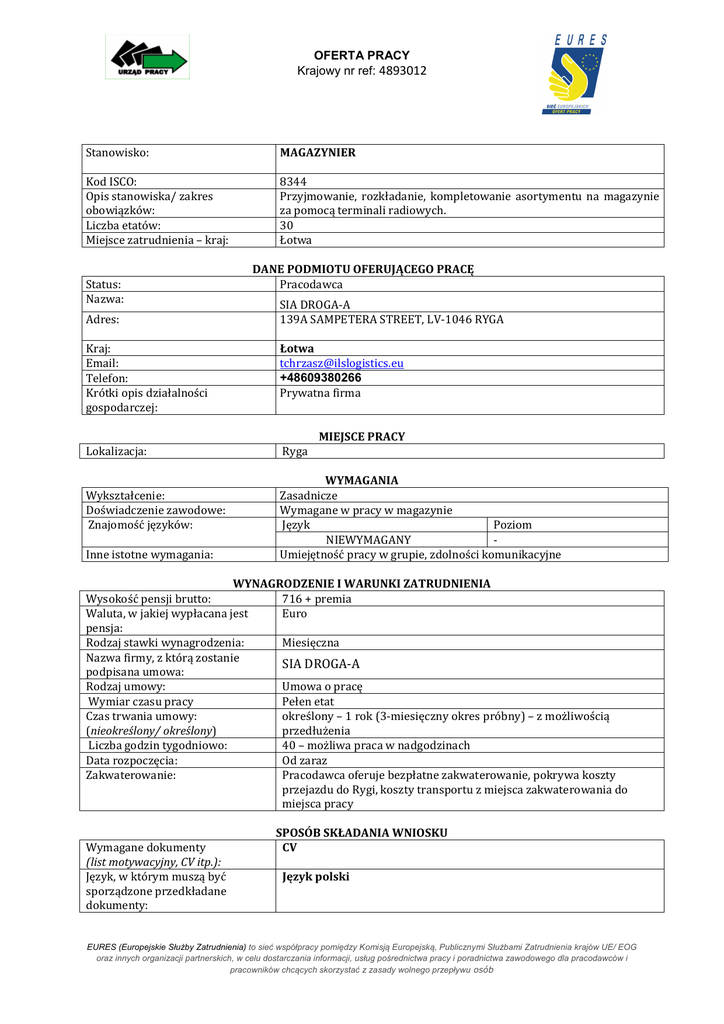 OFERTA PRACY Krajowy nr ref: 4893012 Stanowisko: MAGAZYNIER Kod ISCO: Opis stanowiska/ zakres obowiązków: Liczba etatów: Miejsce zatrudnienia – kraj: 8344 Przyjmowanie, rozkładanie, kompletowanie asortymentu na magazynie za pomocą terminali radiowych. 30 Łotwa Status: Nazwa: Adres: DANE PODMIOTU OFERUJĄCEGO PRACĘ Pracodawca SIA DROGA-A 139A SAMPETERA STREET, LV-1046 RYGA Kraj: Email: Telefon: Krótki opis działalności gospodarczej: Łotwa [email protected] +48609380266 Prywatna firma Lokalizacja: Ryga MIEJSCE PRACY Wykształcenie: Doświadczenie zawodowe: Znajomość języków: Inne istotne wymagania: WYMAGANIA Zasadnicze Wymagane w pracy w magazynie Język Poziom NIEWYMAGANY Umiejętność pracy w grupie, zdolności komunikacyjne WYNAGRODZENIE I WARUNKI ZATRUDNIENIA Wysokość pensji brutto: 716 + premia Waluta, w jakiej wypłacana jest Euro pensja: Rodzaj stawki wynagrodzenia: Miesięczna Nazwa firmy, z którą zostanie SIA DROGA-A podpisana umowa: Rodzaj umowy: Umowa o pracę Wymiar czasu pracy Pełen etat Czas trwania umowy: określony – 1 rok (3-miesięczny okres próbny) – z możliwością (nieokreślony/ określony) przedłużenia Liczba godzin tygodniowo: 40 – możliwa praca w nadgodzinach Data rozpoczęcia: Od zaraz Zakwaterowanie: Pracodawca oferuje bezpłatne zakwaterowanie, pokrywa koszty przejazdu do Rygi, koszty transportu z miejsca zakwaterowania do miejsca pracy Wymagane dokumenty (list motywacyjny, CV itp.): Język, w którym muszą być sporządzone przedkładane dokumenty: SPOSÓB SKŁADANIA WNIOSKU CV Język polski EURES (Europejskie Służby Zatrudnienia) to sieć współpracy pomiędzy Komisją Europejską, Publicznymi Służbami Zatrudnienia krajów UE/ EOG oraz innych organizacji partnerskich, w celu dostarczania informacji, usług pośrednictwa pracy i poradnictwa zawodowego dla pracodawców i pracowników chcących skorzystać z zasady wolnego przepływu osób Do kogo należy wysłać dokumenty: (do pracodawcy/ doradcy EURES) Kandydaci proszeni są o przesłanie CV do doradcy EURES z Wojewódzkiego Urzędu Pracy w Białymstoku Gdzie należy wysłać dokumenty: (adres, adres e-mail, nr faksu z kodem kraju itp.) email: [email protected] – w tytule emaila proszę wpisać - Łotwa – magazynier Tel. 85 74 97 235 WUP w Białymstoku, ul. Pogodna 22 15-354 Białystok Kontakt do pracodawcy: Tomasz Chrząszczewski, email: [email protected] Dane teleadresowe doradcy EURES lub przedstawiciela pracodawcy: WAŻNOŚĆ Data publikacji: Termin przedkładania podań o pracę / zakończenia ważności oferty: 21.05.2015 Do odwołania Uprzejmie informujemy, że skontaktujemy się wyłącznie z wybranymi kandydatami. UWAGA: 1. Umowa z zagranicznym pracodawcą zostanie zawarta zgodnie z prawem kraju zatrudnienia. Oznacza to, że wszystkie roszczenia odnośnie do warunków, które obejmuje umowa, można kierować wyłącznie do odpowiedniego sądu w kraju zatrudnienia. Publiczne służby zatrudnienia (EURES) nie mogą pośredniczyć ani reprezentować pracownika w sądzie kraju zatrudnienia w przypadku sporu z pracodawcą. 2. Publiczne służby zatrudnienia (EURES) dokładają wszelkich starań, aby zapewnić rzetelność i wiarygodność ofert pracy zgłoszonych w lokalnym urzędzie pracy. Należy wyjaśnić, że oferta pracy została zgłoszona przez stronę trzecią i EURES nie odpowiada za ewentualne rozbieżności między warunkami pracy określonymi w ofercie pracy i warunkami oferowanymi przez potencjalnego pracodawcę. 3. Publiczne służby zatrudnienia (EURES) informują, że będą zbierać, przetwarzać i przekazywać potencjalnym pracodawcom zgodnie z przepisami dotyczącymi ochrony danych osobowych wszystkie dane osobowe dostarczone przez osoby poszukujące pracy. EURES (Europejskie Służby Zatrudnienia) to sieć współpracy pomiędzy Komisją Europejską, Publicznymi Służbami Zatrudnienia krajów UE/ EOG oraz innych organizacji partnerskich, w celu dostarczania informacji, usług pośrednictwa pracy i poradnictwa zawodowego dla pracodawców i pracowników chcących skorzystać z zasady wolnego przepływu osób