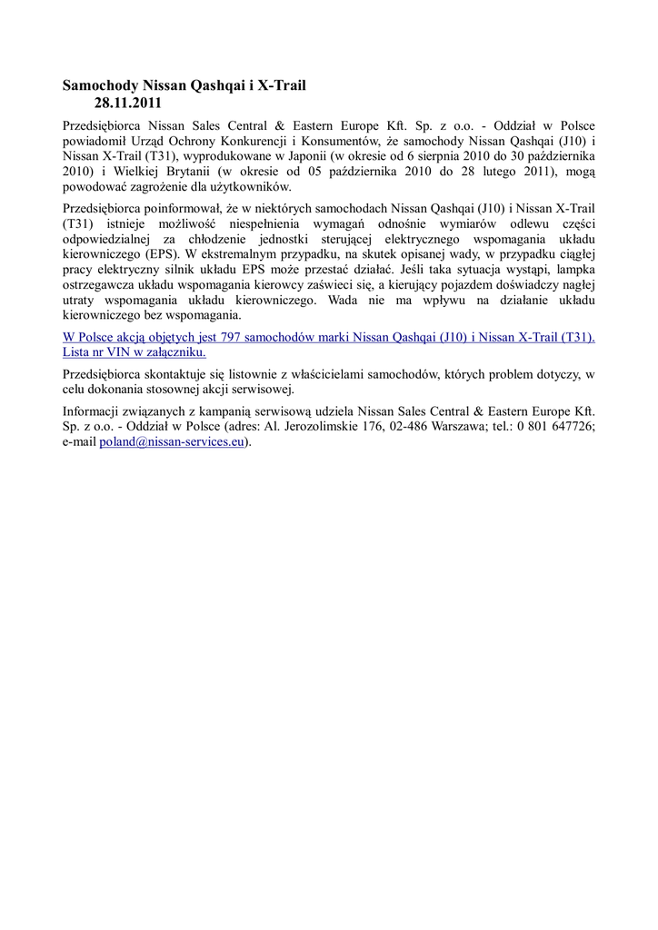 Samochody Nissan Qashqai i X-Trail 28.11.2011 Przedsiębiorca Nissan Sales Central & Eastern Europe Kft. Sp. z o.o. - Oddział w Polsce powiadomił Urząd Ochrony Konkurencji i Konsumentów, Ŝe samochody Nissan Qashqai (J10) i Nissan X-Trail (T31), wyprodukowane w Japonii (w okresie od 6 sierpnia 2010 do 30 października 2010) i Wielkiej Brytanii (w okresie od 05 października 2010 do 28 lutego 2011), mogą powodować zagroŜenie dla uŜytkowników. Przedsiębiorca poinformował, Ŝe w niektórych samochodach Nissan Qashqai (J10) i Nissan X-Trail (T31) istnieje moŜliwość niespełnienia wymagań odnośnie wymiarów odlewu części odpowiedzialnej za chłodzenie jednostki sterującej elektrycznego wspomagania układu kierowniczego (EPS). W ekstremalnym przypadku, na skutek opisanej wady, w przypadku ciągłej pracy elektryczny silnik układu EPS moŜe przestać działać. Jeśli taka sytuacja wystąpi, lampka ostrzegawcza układu wspomagania kierowcy zaświeci się, a kierujący pojazdem doświadczy nagłej utraty wspomagania układu kierowniczego. Wada nie ma wpływu na działanie układu kierowniczego bez wspomagania. W Polsce akcją objętych jest 797 samochodów marki Nissan Qashqai (J10) i Nissan X-Trail (T31). Lista nr VIN w załączniku. Przedsiębiorca skontaktuje się listownie z właścicielami samochodów, których problem dotyczy, w celu dokonania stosownej akcji serwisowej. Informacji związanych z kampanią serwisową udziela Nissan Sales Central & Eastern Europe Kft. Sp. z o.o. - Oddział w Polsce (adres: Al. Jerozolimskie 176, 02-486 Warszawa; tel.: 0 801 647726; e-mail [email protected]).