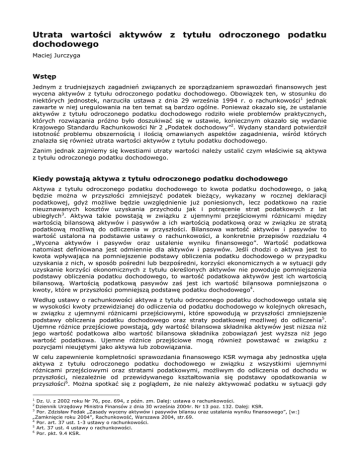 Utrata wartości aktywów z tytułu odroczonego podatku dochodowego Maciej Jurczyga Wstęp Jednym z trudniejszych zagadnień związanych ze sporządzaniem sprawozdań finansowych jest wycena aktywów z tytułu odroczonego podatku dochodowego. Obowiązek ten, w stosunku do niektórych jednostek, narzuciła ustawa z dnia 29 września 1994 r. o rachunkowości1 jednak zawarte w niej uregulowania na ten temat są bardzo ogólne. PoniewaŜ okazało się, Ŝe ustalanie aktywów z tytułu odroczonego podatku dochodowego rodziło wiele problemów praktycznych, których rozwiązania próŜno było doszukiwać się w ustawie, koniecznym okazało się wydanie Krajowego Standardu Rachunkowości Nr 2 „Podatek dochodowy”2. Wydany standard potwierdził istotność problemu obszernością i ilością omawianych aspektów zagadnienia, wśród których znalazła się równieŜ utrata wartości aktywów z tytułu podatku dochodowego. Zanim jednak zajmiemy się kwestiami utraty wartości naleŜy ustalić czym właściwie są aktywa z tytułu odroczonego podatku dochodowego. Kiedy powstają aktywa z tytułu odroczonego podatku dochodowego Aktywa z tytułu odroczonego podatku dochodowego to kwota podatku dochodowego, o jaką będzie moŜna w przyszłości zmniejszyć podatek bieŜący, wykazany w rocznej deklaracji podatkowej, gdyŜ moŜliwe będzie uwzględnienie juŜ poniesionych, lecz podatkowo na razie nieuznawanych kosztów uzyskania przychodu jak i potrącenie strat podatkowych z lat ubiegłych3. Aktywa takie powstają w związku z ujemnymi przejściowymi róŜnicami między wartością bilansową aktywów i pasywów a ich wartością podatkową oraz w związku ze stratą podatkową moŜliwą do odliczenia w przyszłości. Bilansowa wartość aktywów i pasywów to wartość ustalona na podstawie ustawy o rachunkowości, a konkretnie przepisów rozdziału 4 „Wycena aktywów i pasywów oraz ustalenie wyniku finansowego”. Wartość podatkowa natomiast definiowana jest odmiennie dla aktywów i pasywów. Jeśli chodzi o aktywa jest to kwota wpływająca na pomniejszenie podstawy obliczenia podatku dochodowego w przypadku uzyskania z nich, w sposób pośredni lub bezpośredni, korzyści ekonomicznych a w sytuacji gdy uzyskanie korzyści ekonomicznych z tytułu określonych aktywów nie powoduje pomniejszenia podstawy obliczenia podatku dochodowego, to wartość podatkowa aktywów jest ich wartością bilansową. Wartością podatkową pasywów zaś jest ich wartość bilansowa pomniejszona o kwoty, które w przyszłości pomniejszą podstawę podatku dochodowego4. Według ustawy o rachunkowości aktywa z tytułu odroczonego podatku dochodowego ustala się w wysokości kwoty przewidzianej do odliczenia od podatku dochodowego w kolejnych okresach, w związku z ujemnymi róŜnicami przejściowymi, które spowodują w przyszłości zmniejszenie podstawy obliczenia podatku dochodowego oraz straty podatkowej moŜliwej do odliczenia5. Ujemne róŜnice przejściowe powstają, gdy wartość bilansowa składnika aktywów jest niŜsza niŜ jego wartość podatkowa albo wartość bilansowa składnika zobowiązań jest wyŜsza niŜ jego wartość podatkowa. Ujemne róŜnice przejściowe mogą równieŜ powstawać w związku z pozycjami nieujętymi jako aktywa lub zobowiązania. W celu zapewnienie kompletności sprawozdania finansowego KSR wymaga aby jednostka ujęła aktywa z tytułu odroczonego podatku dochodowego w związku z wszystkimi ujemnymi róŜnicami przejściowymi oraz stratami podatkowymi, moŜliwym do odliczenia od dochodu w przyszłości, niezaleŜnie od przewidywanego kształtowania się podstawy opodatkowania w przyszłości6. MoŜna spotkać się z poglądem, Ŝe nie naleŜy aktywować podatku w sytuacji gdy 1 Dz. U. z 2002 roku Nr 76, poz. 694, z późn. zm. Dalej: ustawa o rachunkowości. Dziennik Urzędowy Ministra Finansów z dnia 30 września 2004r. Nr 13 poz. 132. Dalej: KSR. Por. Zdzisław Fedak „Zasady wyceny aktywów i pasywów bilansu oraz ustalania wyniku finansowego”, [w:] „Zamknięcie roku 2004”, Rachunkowość, Warszawa 2004, str.69. 4 Por. art. 37 ust. 1-3 ustawy o rachunkowości. 5 Art. 37 ust. 4 ustawy o rachunkowości. 6 Por. pkt. 9.4 KSR. 2 3 nie jest prawdopodobne odliczenie róŜnic i strat7. Nie moŜna go jednak uznać za poprawny w związku z postanowieniami KSR, który powinien być stosowany w przypadku braku szczegółowych regulacji ustawowych8. Przykład 1 Jednostka posiada naleŜność u odbiorcy zagranicznego w kwocie 100 000 USD wycenione po kursie z dnia powstania naleŜności 4.35 PLN/USD (435 000 PLN). Jednocześnie posiada zobowiązania wobec dostawcy zagranicznego w kwocie 50 000 EURO wycenione po kursie z dnia powstania naleŜności 3.78 PLN/EURO (189 000 PLN). Na dzień bilansowy kursy, według których wycenia się naleŜność i zobowiązanie, kształtują się następująco: 4.17 PLN/USD i 4.03 PLN/EURO w związku z czym wartość bilansowa naleŜności wynosi 417 000 PLN a zobowiązania 201 500 PLN. Wartością podatkową naleŜności i zobowiązania jest wartość z dnia ujęcia w księgach jednostki natomiast wartością bilansową jest wartość na dzień bilansowy. Wycena na dzień bilansowy spowodowała powstanie róŜnic przejściowych. RóŜnice te mają charakter ujemny poniewaŜ wartość bilansowa naleŜności jest niŜsza a zobowiązania wyŜsza od ich wartości podatkowych. Jak ustalać wartość aktywów z tytułu odroczonego podatku dochodowego? Wartość aktywów z tytułu odroczonego podatku dochodowego ustala się jako iloczyn stawki podatku dochodowego i sumy kwot ujemnych róŜnic przejściowych oraz strat podatkowych. Przy dokonywaniu wyliczeń naleŜy zastosować stawkę podatku dochodowego obowiązującą w momencie odwracania się róŜnic przejściowych. Wynika to z faktu, Ŝe właśnie wtedy dojdzie do zmniejszenia podstawy opodatkowania a przez to do zmniejszenia zobowiązań z tytułu podatku dochodowego9. KSR zaleca aby p