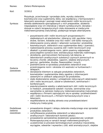 Nazwa: Zielarz-fitoterapeuta Kod: 323012 Synteza: Pozyskuje, przechowuje i sprzedaje zioła, wyroby zielarskie, kosmetyczne oraz suplementy diety; we współpracy z farmaceutami i lekarzami poszukuje i poznaje nowe właściwości roślin leczniczych; określa dawkowanie sporządzanych z nich preparatów, działania niepożądane oraz ich interakcje z lekami syntetycznymi; doradza i stosuje w celach terapeutycznych zioła stosowane w medycynie niekonwencjonalnej (naturalnej); podejmuje terapie alternatywne. Zadania zawodowe: Dodatkowe zadania zawodowe: • pozyskiwanie ziół i roślin leczniczych przyprawowych i olejkodajnych od plantatorów i zbieraczy ziół: pączków i kory drzew, korzeni, kwiatów oraz liści roślin i ziół dziko rosnących; • dokonywanie oceny jakości i własności surowców i produktów kosmetycznych, zielarskich oraz suplementów diety i żywności; • nadzorowanie procesu suszenia ziół i roślin leczniczych oraz dbałość o przestrzeganie norm, jakim powinny odpowiadać poszczególne surowce (tzw. standaryzacja materiału roślinnego); • określanie, pod kierunkiem farmaceuty lub lekarza, w laboratoriach analitycznych substancji czynnych pomocnych w leczeniu chorób: alkaloidów, saponin, olejków eterycznych, gorczyc, garbników, śluzów, flawonoidów i innych; • pośredniczenie w sprzedaży produktów zielarskich oraz przestrzeganie norm i okresów ich ważności w hurtowniach i sklepach; • doradzanie klientom w zakupie produktów zielarskich, kosmetyków i suplementów diety zgodnie z informacjami zawartymi w ulotkach załączonych do produktów; • stałe doskonalenie wiedzy i umiejętności dotyczących właściwości ziół i roślin leczniczych, udział w szkoleniach, seminariach i konferencjach; • popularyzowanie wiedzy o właściwościach ziół i roślin leczniczych w mediach, prowadzenie szkoleń i kursów, seminariów oraz warsztatów w zakresie medycyny niekonwencjonalnej (naturalnej); • współpraca z firmami zajmującymi się w uprawą i przetwórstwem ziół i roślin leczniczych, z firmami farmaceutycznymi oraz z lekarzami; • współdziałanie ze służbą zdrowia oraz przedstawicielami medycyny tradycyjnej. • prowadzenie drogerii i sklepu zielarsko-medycznego oraz sprzedaż produktów zielarskich; • certyfikowanie produktów zielarskich w laboratoriach analitycznych i laboratoriach kontroli jakości; • prowadzenie samodzielnej działalności gospodarczej i praktyki fitoterapeutycznej w ramach terapii niekonwencjonalnych; • uczestnictwo w procesie technologicznym produkcji maceratów, wyciągów, odwarów i wywarów z ziół, wód aromatycznych, olejków leczniczych, nalewek itp.; • określanie dawkowania sporządzanych preparatów, działań niepożądanych oraz ich interakcji z lekami syntetycznymi.