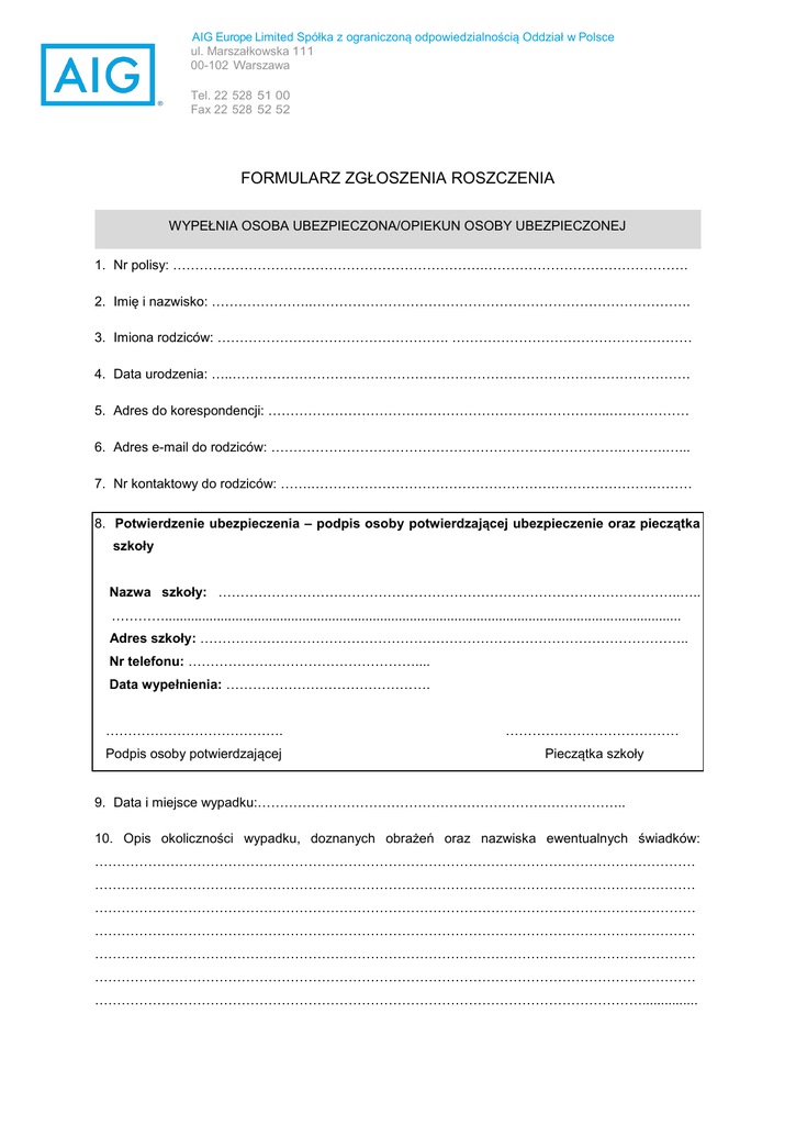 AIG Europe Limited Spółka z ograniczoną odpowiedzialnością Oddział w Polsce ul. Marszałkowska 111 00-102 Warszawa Tel. 22 528 51 00 Fax 22 528 52 52 FORMULARZ ZGŁOSZENIA ROSZCZENIA WYPEŁNIA OSOBA UBEZPIECZONA/OPIEKUN OSOBY UBEZPIECZONEJ 1. Nr polisy: …………………………………………………………….………………………………………. 2. Imię i nazwisko: …………………..…………………………………………………………………………. 3. Imiona rodziców: ……………………………………………. ……………………………………………… 4. Data urodzenia: …..…………………………………………………………………………………………. 5. Adres do korespondencji: …………………………………………………………………..……………… 6. Adres e-mail do rodziców: …………………………………………………………………….……….…... 7. Nr kontaktowy do rodziców: …….……………………………………………….………………….……… 8. Potwierdzenie ubezpieczenia – podpis osoby potwierdzającej ubezpieczenie oraz pieczątka szkoły Nazwa szkoły: …………………………………………………………………………………………..….. …………........................................................................................................................................... Adres szkoły: ……………………………………………………………………………………………….. Nr telefonu: …………………………………………….... Data wypełnienia: ………………………………………. …………………………………. ………………………………… Podpis osoby potwierdzającej Pieczątka szkoły 9. Data i miejsce wypadku:……………………………………………………………………….. 10. Opis okoliczności wypadku, doznanych obrażeń oraz nazwiska ewentualnych świadków: ……………………………………………………………………………………………………………………… ……………………………………………………………………………………………………………………… ……………………………………………………………………………………………………………………… ……………………………………………………………………………………………………………………… ……………………………………………………………………………………………………………………… ……………………………………………………………………………………………………………………… ……………………………………………………………………………………………………………............... Okres leczenia szpitalnego (prosimy dołączyć kopię karty informacyjnej leczenia szpitalnego): od ……………… do ……………… Nazwa i adres ośrodka: …………………………………………………………………………………..……… WYPEŁNIA LEKARZ PROWADZĄCY (jeżeli Osoba Ubezpieczona posiada dokumenty medyczne zawierające diagnozę oraz opis przebiegu leczenia, wypełnienie pkt. 11 przez lekarza nie jest wymagane) 11. Data wypadku, diagnoza, opis przebiegu leczenia, data zakończenia leczenia .……………………………………………………………………………………………………………………… ………………………………………………………………………………………………………………………. ……………………………………………………………………………………………………………………… ……………………………………………………………………………………………………………………… ……………………………………………………………………………………………………………………… Podpis i pieczątka lekarza:……..……………………………. Data:……………… 12. Czy leczenie zostało zakończone? TAK NIE 13. Zgodnie z artykułem 815 § 3 Kodeksu Cywilnego zatajenie prawdy lub złożenie oświadczeń niezgodnych z prawdą, a istotnych i wymaganych przez Ubezpieczyciela, spowoduje unieważnienie roszczenia. 14. Do niniejszego formularza należy dołączyć: kopię pełnej dokumentacji medycznej związanej z wypadkiem (w tym kopii karty informacyjnej leczenia szpitalnego); kopię raportów z Policji/Prokuratury/Sądu zawierających opis okoliczności wypadku oraz wynik badania na zawartość alkoholu we krwi Osoby Ubezpieczonej (jeżeli zostały sporządzone); oryginały rachunków za powypadkowe leczenie (jedynie w przypadku wybrania wariantu ubezpieczenia obejmującego zwrot kosztów powypadkowego leczenia). 15. Przyznane świadczenie proszę przekazać: na rachunek bankowy nr: _ _ ____ ____ ____ ____ ____ ____ nazwa banku: ……………………………………………………………………………………………………... właściciel rachunku: ………………………………………..…………………………………………………….. albo przekazem pocztowym na adres: …….………………….…………………………………………………………………………………………….. UPOWAŻNIENIE Niniejszym upoważniam szpital, przychodnię, lekarzy prowadzących leczenie, pracodawcę oraz każdą inną osobę fizyczną lub osobę prawną do dostarczenia Towarzystwu wszystkich niezbędnych informacji dotyczących okoliczności oraz następstw wypadku będącego przyczyną zgłoszenia ros