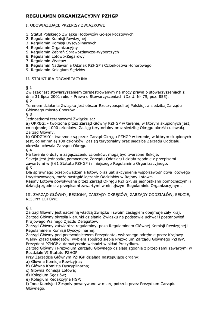 REGULAMIN ORGANIZACYJNY PZHGP I. OBOWIĄZUJĄCE PRZEPISY ZWIĄZKOWE 1. 2. 3. 4. 5. 6. 7. 8. 9. Statut Polskiego Związku Hodowców Gołębi Pocztowych Regulamin Komisji Rewizyjnej Regulamin Komisji Dyscyplinarnych Regulamin Organizacyjny Regulamin Zebrań Sprawozdawczo-Wyborczych Regulamin Lotowo-Zegarowy Regulamin Wystaw Regulamin Nadawania Odznak PZHGP i Członkostwa Honorowego Regulamin Kolegium Sędziów II. STRUKTURA ORGANIZACYJNA §1 Związek jest stowarzyszeniem zarejestrowanym na mocy prawa o stowarzyszeniach z dnia 31 lipca 2001 roku - Prawo o Stowarzyszeniach (Dz.U. Nr 79, poz. 855). §2 Terenem działania Związku jest obszar Rzeczypospolitej Polskiej, a siedzibą Zarządu Głównego miasto Chorzów. §3 Jednostkami terenowymi Związku są: a) OKRĘGI - tworzone przez Zarząd Główny PZHGP w terenie, w którym skupionych jest, co najmniej 1000 członków. Zasięg terytorialny oraz siedzibę Okręgu określa uchwałą Zarząd Główny. b) ODDZIAŁY - tworzone są przez Zarząd Okręgu PZHGP w terenie, w którym skupionych jest, co najmniej 100 członków. Zasięg terytorialny oraz siedzibę Zarządu Oddziału, określa uchwała Zarządu Okręgu. §4 Na terenie o dużym zagęszczeniu członków, mogą być tworzone Sekcje. Sekcja jest jednostką pomocniczą Zarządu Oddziału i działa zgodnie z przepisami zawartymi w § 61 Statutu PZHGP i niniejszego Regulaminu Organizacyjnego. §5 Dla sprawnego przeprowadzenia lotów, oraz uatrakcyjnienia współzawodnictwa lotowego i wystawowego, może nastąpić łączenie Oddziałów w Rejony Lotowe. Rejony Lotowe powoływane przez Zarząd Okręgu PZHGP, są jednostkami pomocniczymi i działają zgodnie z przepisami zawartymi w niniejszym Regulaminie Organizacyjnym. III. ZARZĄD GŁÓWNY, REGIONY, ZARZĄDY OKRĘGÓW, ZARZĄDY ODDZIAŁÓW, SEKCJE, REJONY LOTOWE §1 Zarząd Główny jest naczelną władzą Związku i swoim zasięgiem obejmuje cały kraj. Zarząd Główny określa kierunki działania Związku na podstawie uchwał i postanowień Krajowego Walnego Zjazdu Delegatów. Zarząd Główny zatwierdza regulaminy, poza Regulaminem Głównej Komisji Rewizyjnej i Regulaminem Komisji Dyscyplinarnej. Zarząd Główny pod przewodnictwem Prezydenta, wybranego odrębnie przez Krajowy Walny Zjazd Delegatów, wybiera spośród siebie Prezydium Zarządu Głównego PZHGP. Prezydent PZHGP automatycznie wchodzi w skład Prezydium. Zarząd Główny i Prezydium Zarządu Głównego działają zgodnie z przepisami zawartymi w Rozdziale VI Statutu PZHGP. Przy Zarządzie Głównym PZHGP działają następujące organy: a) Główna Komisja Rewizyjna; b) Główna Komisja Dyscyplinarna; c) Główna Komisja Lotowa; d) Kolegium Sędziów; e) Kolegium Redakcyjne HGP; f) Inne Komisje i Zespoły powoływane w miarę potrzeb przez Prezydium Zarządu Głównego. §2 Okręg powoływany jest przez Zarząd Główny PZHGP w terenie, w którym skupionych jest, co najmniej 1000 członków. Zasięg terytorialny oraz siedzibę Zarządu Okręgu, określa uchwałą Zarząd Główny. Zarząd Okręgu posiada osobowość prawną, na zasadach zawartych w Rozdz. I § 3 Statutu PZHGP. W przypadku, jeżeli stan liczbowy zarejestrowanych członków w Okręgu zmniejszy się poniżej 350 członków, a stan taki trwa dłużej niż połowa kadencji (2 lata), Zarząd Główny zobowiązany jest z mocy niniejszego Regulaminu Organizacyjnego rozwiązać taki Okręg. Rozwiązanie Okręgu może nastąpić również z mocy Uchwały Zarządu Głównego podjętej w oparciu o § 27 pkt11 Statutu PZHGP, względnie Uchwały o samorozwiązaniu poprzez: a) zwołanie na podstawie § 41 lub § 42 ust. 1 Statutu PZHGP Okręgowego Walnego Zebrania Delegatów; b) podjęcia Uchwały Okręgowego Walnego Zebrania Delegatów przy kwalifikowanej większości 2/3 głosów i przy obecności połowy delegatów w głosowaniu jawnym; c) łączenie Okręgu z innymi Okręgami w jeden duży Okręg następuje na podstawie uchwały Okręgowego Walnego Zebrania Delegatów przy kwalifikowanej większości 2/3 głosów i obecności połowy delegatów podjętej w głosowaniu jawnym. Zarząd Okręgu określa kierunki działania Okręgu w oparciu o uchwały i postanowienia Okręgowego Walnego Zjazdu Delegatów. Zarząd Okręgu pod przewodnictwem Prezesa wybranego odrębnie przez Okręgowy Walny Zjazd Delegatów, wybiera z pośród siebie Prezydium Zarządu Okręgu. Prezes Zarządu automatycznie wchodzi w skład Prezydium. Zarząd Okręgu i Prezydium Zarządu Okręgu działają zgodnie z przepisami zawartymi w Rozdziale X Statutu PZHGP. Przy Zarządzie Okręgu działają następujące organy: a) Okręgowa Komisja Rewizyjna; b) Okręgowa Komisja Dyscyplinarna; c) Inne Komisje i Zespoły powołane przez Prezydium Zarządu Okręgu. §3 Oddział tworzony jest przez Zarząd Okręgu PZHGP w terenie, którym skupionych jest, co najmniej 100 członków. Zasięg terytorialny oraz siedzibę Zarządu Oddziału określa uchwała Zarządu Okręgu. Zarząd Okręgu może w trakcie kadencji, w szczególnie uzasadnionych przypadkach, zmieniać zasięg terytorialny poszczególnych Oddziałów, uwzględniając wolę większości członków z tego terenu. W przypadku, gdy Oddział skupia ponad 200 członków, wówczas może być powołany drugi Oddział. Oddział ten musi liczyć, co najmniej 100 członków, jak również w istniejącym Oddziale pozostać musi ponad 100 członków. Uchwałę o podziale podejmuje Walne Zebranie Oddziału kwalifikowaną większością 2/3 głosów w głosowaniu jawnym. W przypadku, jeżeli stan liczbowy zarejestrowanych członków w Oddziale zmniejszy się poniżej 50 członków, a stan taki trwa dłużej niż połowę kadencji (2 lata), Zarząd Okręgu zobowiązany jest z mocy niniejszego Regulaminu Organizacyjnego rozwiązać taki Oddział. Rozwiązanie Oddziału może nastąpić również z mocy § 43 ust. 2 Statutu PZHGP, względnie podjęcie Uchwały o samorozwiązaniu poprzez: a) zwołanie na podstawie § 54 