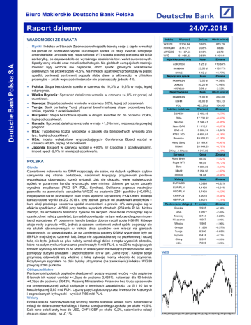 Biuro Maklerskie Deutsche Bank Polska Raport dzienny 24.07.2015 WIADOMOŚCI ZE ŚWIATA Deutsche Bank Polska S.A. Rynki Indeksy w Stanach Zjednoczonych spadły trzecią sesję z rzędu w reakcji na gorsze od oczekiwań wyniki kluczowych spółek za drugi kwartał. Obligacje amerykańskie umocniły się, ropa naftowa WTI spadła poniżej poziomu 49 USD za baryłkę, co doprowadziło do wyraźnego osłabienia tzw. walut surowcowych. Spadły ceny miedzi oraz metali szlachetnych. Na giełdach europejskich nastroje również były wczoraj nie najlepsze, choć spadki głównych wskaźników giełdowych nie przekraczały -0,5%. Na rynkach azjatyckich przeważały w piątek spadki, ponieważ sentyment popsuły słabe dane o aktywności w chińskim przemyśle – zniżki większości indeksów nie przekraczały jednak -1%. Indeks Wartość Zmiana Obrót (m ln zł) WIG20 mWIG40 sWIG80 WIG 2 200,84 0,69% 879,79 3 714,11 0,35% 88,86 13 187,53 0,45% 23,79 51 986,22 Największe wzrosty 0,56% Kurs 1 001,41 Zmiana AGROTON 1,25 zł +13.64% RAINBOW 23,50 zł +10.17% HAWE Największe spadki 1,42 zł Kurs +6.77% Zmiana PKNORLEN 75,00 zł -4.58% DOMDEV 50,20 zł -3.46% INTERBUD Najaktywniejsi 2,95 zł Kurs Obrót (m ln zł) PKNORLEN 75,00 zł 258,89 KGHM 89,00 zł 133,13 PZU 422,20 zł Wartość 106,06 Zmiana S&P500 2 102,15 -0,57% DJIA 17 731,92 -0,67% Nasdaq 5 146,41 -0,49% Xetra DAX 11 512,11 -0,07% CAC 40 5 086,74 +0,08% FTSE 100 6 655,01 -0,18% Bovespa 49 806,63 -2,18% Hang Seng 25 164,47 -0,90% Nikkei 20 544,53 -0,70% Chiny_ A-Shares 4 317,89 -0,10% Surowce Cena Zmiana Ropa Brent 55,50 -1,02% Ropa WTI 48,85 -0,73% Złoto 1 089,30 -0,34% Miedź 5 256,50 -1,87% Srebro 14,68 -0,88% Waluty Kurs Zmiana EUR/USD 1,0985 +0,52% EUR/PLN 4,1130 +0,01% USD/PLN 3,7433 -0,52% CHF/PLN 3,9018 -0,48% GBP/PLN 5,8074 -1,15% Rentowności obligacji 10-letnich Zmiana Polska: Stopa bezrobocia spadła w czerwcu do 10,3% z 10,8% w maju, lepiej od prognoz. Wielka Brytania: Sprzedaż detaliczna wzrosła w czerwcu +4,0% r/r gorzej od oczekiwań. Szwecja: Stopa bezrobocia wyniosła w czerwcu 8,5%, lepiej od oczekiwań. Turcja: Bank centralny Turcji utrzymał benchmarkową stopę procentową bez zmian, zgodnie z oczekiwaniami. Hiszpania: Stopa bezrobocia spadła w drugim kwartale br. do poziomu 22,4%, lepiej od oczekiwań. Kanada: Sprzedaż detaliczna wzrosła w maju +1,0% m/m, nieznacznie powyżej prognoz. USA: Tygodniowa liczba wniosków o zasiłek dla bezrobotnych wyniosła 255 tys., lepiej od oczekiwań. USA: Indeks wskaźników wyprzedzających- Conference Board wzrósł w czerwcu +0,6%, lepiej od oczekiwań. Japonia: Eksport w czerwcu wzrósł o +9,5% r/r (zgodnie z oczekiwaniami), a import spadł -2,9% r/r (mniej od oczekiwań). Indeksy światowe POLSKA Giełda Czwartkowe notowania na GPW rozpoczęły się słabo, na dużych spółkach szybko uaktywniła się strona podażowa, natomiast kupujący przyjmowali postawę wyczekującą obserwując rozwój sytuacji. Jak się okazało, wiele największych spółek w porannym handlu wyznaczyło swe minima dzienne po czym zaczęły wyraźnie zwyżkować (PKO BP, PZU, Synthos). Delikatna poprawa nastrojów pozwoliła na zamknięciu wskaźnika WIG20 na poziomie 2201 punktów (+0,69%). Negatywnie na tle pozostałych blue chips wyróżnił się wczoraj PKN Orlen, którego bardzo dobre wyniki za 2Q 2015 r. były jednak gorsze od oczekiwań analityków – kurs akcji płockiego koncernu spadał momentami o prawie -8% zamykajac się w efekcie spadkiem o -4,58% przy bardzo wysokich obrotach (259 mln PLN). Można założyć, że wczorajsza realizacja zysków na akcjach PKN może rozciągnąć się w czasie, choć należy pamiętać, że nadal obowiązuje na tym walorze długoterminowy trend wzrostowy. W porannym handlu bardzo dobrze radził sobie KGHM, którego akcje rosły o prawie +4%, jednak z czasem sentyment wokół spółki pogorszył się na skutek obserwowanych w trakcie dnia spadków cen miedzi na giełdach towarowych, co spowodowało, że na zamknięciu papiery KGHM wyceniane były po 89 PLN (najniżej od czterech lat). Sesja nie zapowiadała się na przełomową i raczej taką nie była, jednak na plus należy uznać drugi dzień z rzędu wysokich obrotów, które na całym rynku nieznacznie przekroczyły 1 mld PLN, a na 20-tu największych firmach wyniosły 880 mln PLN. Może to wskazywać na trwające przejmowanie akcji pomiędzy dużymi graczami i przechodzenie ich w tzw. „silne ręce”. Kolejne sesje przyniosą odpowiedź czy właśnie z taką sytuacją mamy obecnie do czynienia. Pozytywnym sygnałem na dziś byłoby utrzymanie (na zamknięciu) indeksu WIG20 powyżej 2200 punktów. Obligacje/Makro Rentowności polskich papierów skarbowych poszły wczoraj w górę – dla papierów 5-letnich ich wzrost wyniósł +4,2bps do poziomu 2,431%, natomiast dla 10-letnich +4,3bps do poziomu 2,942%. Wczoraj Ministerstwo Finansów bez trudu uplasowało na przeprowadzonej aukcji obligacje o terminach zapadalności za 5 i 10 lat w kwocie łącznej 5,85 mld PLN. Łączny popyt zgłoszony przez inwestorów krajowych i zagranicznych był wysoki - wyniósł 7,56 mld PLN. Waluty Polska waluta zachowywała się wczoraj bardzo stabilnie wobec euro, natomiast w relacji do dolara amerykańskiego i franka szwajcarskiego zyskała po około +0,5%. Dziś rano polski złoty traci do USD, CHF i GBP po około -0,2%, natomiast w relacji do euro nieco mniej, bo -0,1%. -2.32% Polska 2.935 USA 2.2677 -2.40% Niemcy 0.744 -0.28% Hiszpania 1.957 -2.00% Włochy 1.905 -1.96% Grecja 11.858 -0.37% +1.38% Turcja 9.390 -0.65% Japonia 0.418 -0.71% Chiny 3.537 -0.20% Indie 7.805 -0.29% WIG WIG (51,899.91, 52,682.08, 51,899.91, 52,588.42, +929.711) 58000 57500 57000 56500 56000 55500 55000 54500 54000 53500 53000 52500 52000 51500 51000 50500 50000 49500 49000 7 14 21 28 4 11 18 August 25 1 8 15 September 22 29 6 13 October 20 27 3 10 17 November 24 1 8 15 December 22 5 12 2015 19 26 2 9 February 16 23 2 9 March 16 23 3