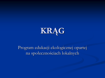 KRĄG Program edukacji ekologicznej opartej na społecznościach lokalnych Początki programu „Krąg” Rok 1994 – przedstawiciele amerykańskiej pozarządowej organizacji Institute for Sustainable Communities z Montpellier w stanie Vermont USA wybierają Regionalne Centrum Edukacji Ekologicznej w Płocku do prowadzenia przykładowego projektu prowadzenia edukacji ekologicznej opartej na społeczności lokalnej. Projekt przewidziany na 18 miesięcy, uwzględniający uwarunkowania przyrodnicze, kulturowe i ekonomiczne istniejące w danej społeczności. Dlaczego nazwa „Krąg”? Nazwa programu zapożyczona od krajów, gdzie ISC prowadziło taki program już wcześniej: Węgry, Bułgaria, Rosja, Łotwa, Litwa. ISC – co to za organizacja? Institute for Sustainable Communities (ISC) – Instytut na Rzecz Społeczności Zrównoważonych (Montpellier, Vermont, USA) – organizacja pozarządowa, utworzona w roku 1990 w celu promowania ochrony środowiska i zrównoważonego rozwoju na poziomie społeczności lokalnych, głównie w Europie wschodniej i centralnej oraz Eurazji. ISC realizuje swoje założenia poprzez organizację warsztatów, pomoc techniczną i prezentację projektów. Źródła finansowania programu „Krąg” Strona amerykańska: Environmental Protection Agency (EPA) Strona polska: WFOŚ i GW; potem również NFOŚ i GW. Główne cele projektu 1. Pomoc społeczności lokalnej i szkołom w identyfikacji głównych, lokalnych problemów związanych z zagrożeniem środowiska. 2. Opracowanie metod i materiałów do prowadzenia edukacji ekologicznej sprzyjających sprawnym działaniom w kierunku rozwiązywania tych problemów. 3. Integracja środowiska lokalnego na rzecz zrównoważonego rozwoju. Pierwsze warsztaty 5 – 7 październik 1994 23 – 25 luty 1995 2 – 4 kwiecień 1995 Murzynowo, siedziba stacji badawczej Wydziału Geografii Uniwersytetu Warszawskiego. Pierwsi trenerzy – Amerykanie. Uczestnicy – ok. 60 osób. - Nauczyciele z Płocka, Kutna, Gostynina, Żychlina. - Przedstawiciele instytucji oświatowych – ODN, Kuratorium Oświaty. - Przedstawiciele organizacji pozarządowych: LOP, harcerze, RCEE, KCEE. - Przedstawiciele Urzędów – Miejskiego i Wojewódzkiego, parków krajobrazowych, przemysłu lokalnego. - Przedstawiciele innych województw po 1 uczestniku: Gdańsk, Olsztyn, Zamość, Radom, Ełk, Włocławek, Ciechanów. Główne cele warsztatów 1. Wzajemne poznanie się uczestników i przedstawienie im zagadnień związanych z edukacją ekologiczną. 2. Zademonstrowanie różnych technik i aktywnych metod nauczania oraz przedstawienie uczestnikom różnych modeli edukacji ekologicznej. 3. Umożliwienie uczestnikom zastosowania w praktyce podstawowych zasad i procesów edukacji ekologicznej. 4. Udostępnienie uczestnikom scenariuszy międzyprzedmiotowych zajęć, bezpośrednio angażujących ucznia, które mogą być przeprowadzane zarówno w szkołach jak i poza nimi. 5. Zachęcenie uczestników do wprowadzania treści i metod e.e. na zajęciach, przekonanie uczestników o skuteczniejszym działaniu interdyscyplinarnego modelu nauczania e.e. w szkołach opartym na współpracy nauczycieli. 6. Zachęcenie uczestników do wzajemnego wspierania się w realizacji projektu (integracja, działanie w zespole, „razem możemy więcej”). Sukces „Kręgu” Duży sukces programu pilotażowego – dodatkowe fundusze na powielenie programu w kolejnych województwach: suwalskie, sieradzkie, skierniewickie, chełmskie. Druga edycja warsztatów – liderzy, uczestnicy I edycji „Kręgu” przekazali zdobyte doświadczenie następnej grupie nauczycieli, a oni przenieśli idee programu do środowiska lokalnego. W ciągu lat „Krąg” zatacza coraz szersze kręgi na inne województwa: kujawsko - pomorskie, pomorskie, śląskie, zachodniopomorskie, mazowieckie, łódzkie, warmińsko – mazurskie, dolnośląskie, lubelskie. Lokalni koordynatorzy ciągle pracują nad rozwojem programu, wzbogacaniem go o nowe treści. Adaptacja i rozwinięcie przewodnika „Kręgu” – ISC otrzymało środki od General Electric. Rezultaty „Kręgu” 1. Nowe programy edukacji ekologicznej dla szkół i przedszkoli, scenariusze lekcji z zastosowaniem ścieżek międzyprzedmiotowych. 2. Tworzenie aktywnych grup, zawiązywanie koalicji aktywnie działających na rzecz środowiska lokalnego i rozwoju zrównoważonego. 3. Nawiązanie współpracy pomiędzy lokalnymi partnerami: samorządem, organizacjami pozarządowymi, ośrodkami kultury, kościołem, rodzicami i szkołą itp. – dialog, wymiana doświadczeń, pozytywny wpływ na rozwiązywanie problemów związanych z ochroną środowiska. 4. Działania w zakresie e.e. obejmujące całą lokalną społeczność. GALERIA
