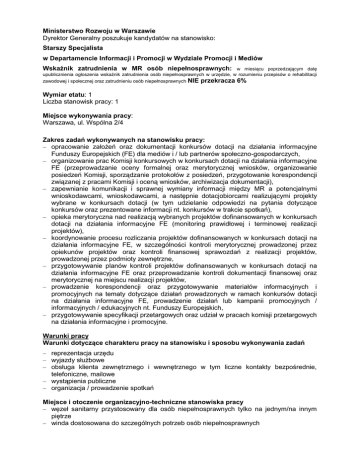 Ministerstwo Rozwoju w Warszawie Dyrektor Generalny poszukuje kandydatów na stanowisko: Starszy Specjalista w Departamencie Informacji i Promocji w Wydziale Promocji i Mediów Wskaźnik zatrudnienia w MR osób niepełnosprawnych: w miesiącu poprzedzającym datę upublicznienia ogłoszenia wskaźnik zatrudnienia osób niepełnosprawnych w urzędzie, w rozumieniu przepisów o rehabilitacji zawodowej i społecznej oraz zatrudnieniu osób niepełnosprawnych NIE przekracza 6% Wymiar etatu: 1 Liczba stanowisk pracy: 1 Miejsce wykonywania pracy: Warszawa, ul. Wspólna 2/4 Zakres zadań wykonywanych na stanowisku pracy: – opracowanie założeń oraz dokumentacji konkursów dotacji na działania informacyjne Funduszy Europejskich (FE) dla mediów i / lub partnerów społeczno-gospodarczych, – organizowanie prac Komisji konkursowych w konkursach dotacji na działania informacyjne FE (przeprowadzanie oceny formalnej oraz merytorycznej wniosków, organizowanie posiedzeń Komisji, sporządzanie protokołów z posiedzeń, przygotowanie korespondencji związanej z pracami Komisji i oceną wniosków, archiwizacja dokumentacji), – zapewnianie komunikacji i sprawnej wymiany informacji między MR a potencjalnymi wnioskodawcami, wnioskodawcami, a następnie dotacjobiorcami realizującymi projekty wybrane w konkursach dotacji (w tym udzielanie odpowiedzi na pytania dotyczące konkursów oraz prezentowane informacji nt. konkursów w trakcie spotkań), – opieka merytoryczna nad realizacją wybranych projektów dofinansowanych w konkursach dotacji na działania informacyjne FE (monitoring prawidłowej i terminowej realizacji projektów), – koordynowanie procesu rozliczania projektów dofinansowanych w konkursach dotacji na działania informacyjne FE, w szczególności kontroli merytorycznej prowadzonej przez opiekunów projektów oraz kontroli finansowej sprawozdań z realizacji projektów, prowadzonej przez podmioty zewnętrzne, – przygotowywanie planów kontroli projektów dofinansowanych w konkursach dotacji na działania informacyjne FE oraz przeprowadzanie kontroli dokumentacji finansowej oraz merytorycznej na miejscu realizacji projektów, – prowadzenie korespondencji oraz przygotowywanie materiałów informacyjnych i promocyjnych na tematy dotyczące działań prowadzonych w ramach konkursów dotacji na działania informacyjne FE, prowadzenie działań lub kampanii promocyjnych / informacyjnych / edukacyjnych nt. Funduszy Europejskich, – przygotowywanie specyfikacji przetargowych oraz udział w pracach komisji przetargowych na działania informacyjne i promocyjne. Warunki pracy Warunki dotyczące charakteru pracy na stanowisku i sposobu wykonywania zadań – reprezentacja urzędu – wyjazdy służbowe – obsługa klienta zewnętrznego i wewnętrznego w tym liczne kontakty bezpośrednie, telefoniczne, mailowe – wystąpienia publiczne – organizacja / prowadzenie spotkań Miejsce i otoczenie organizacyjno-techniczne stanowiska pracy – węzeł sanitarny przystosowany dla osób niepełnosprawnych tylko na jednym/na innym piętrze – winda dostosowana do szczególnych potrzeb osób niepełnosprawnych – wejście główne od strony ul. Wspólnej przystosowane do potrzeb osób niepełnosprawnych – wejście do obiektu od strony ul. Żurawiej przystosowane za pomocą platformy przyschodowej – sale konferencyjne na V piętrze dostępne za pomocą schodołazu – ciągi komunikacyjne przystosowane do szczególnych potrzeb osób niepełnosprawnych Wymagania związane ze stanowiskiem pracy: niezbędne: wykształcenie: wyższe doświadczenie: 2 lata w realizacji projektów informacyjno-promocyjnych współfinansowanych ze środków UE pozostałe wymagania niezbędne: – znajomość języka angielskiego na poziomie B2 – znajomość założeń Umowy Partnerstwa oraz programów operacyjnych realizowanych w ramach niej – znajomość ustawy PZP w zakresie działań informacyjno-promocyjnych – znajomość ustawy o finansach publicznych w zakresie zlecania realizacji zadań publicznych – wiedza z zakresu kontroli lub audytu projektów dofinansowanych z Funduszy Europejskich – znajomość narzędzi promocji, reklamy oraz public relations, w tym wskaźników mediowych – organizacja pracy i orientacja na osiąganie celów – umiejętność współpracy – skuteczna komunikacja – myślenie analityczne – rzetelność – umiejętność obsługi MS Office: Word, Excel Wymagane dokumenty i oświadczenia: – kopia dokumentu potwierdzającego posiadanie polskiego obywatelstwa albo oświadczenia o posiadaniu obywatelstwa polskiego; – kopia dokumentów potwierdzających wykształcenie (dokumenty w języku polskim); – kopie dokumentów potwierdzających wymagane doświadczenie zawodowe – np. kopie świadectw pracy, zaświadczeń o zatrudnieniu, opisów stanowisk, zakresów czynności, referencji lub kopie innych zaświadczeń potwierdzających zamknięty okres oraz obszar zatrudnienia; – oświadczenia kandydata o korzystaniu z pełni praw publicznych, o nieskazaniu prawomocnym wyrokiem za umyślne przestępstwo oraz o nieskazaniu prawomocnym wyrokiem za umyślne przestępstwo skarbowe (podpisane własnoręcznie); – oświadczenia kandydata o wyrażeniu zgody na przetwarzanie danych osobowych do celów rekrutacji (podpisane własnoręcznie); – CV lub życiorys i list motywacyjny; – kopia dokumentu potwierdzającego niepełnosprawność – w przypadku kandydatów, którzy zamierzają skorzystać z pierwszeństwa w zatrudnieniu, gdy znajdą się w gronie pięciu najlepszych kandydatów. Termin składania dokumentów: 07.11.2016 Miejsce składania dokumentów: Ministerstwo Rozwoju Biuro Zarządzania Zasobami Ludzkimi Plac Trzech Krzyży 3/5 00-507 Warszawa (Kancelaria czynna w godz. 8¹⁵-16¹⁵) z dopiskiem w liście motywacyjnym: DIP_108_z Inne informacje: Do udziału w naborze zachęcamy również osoby niepełnosprawne, które spełniają wymagania określone w ogłosze