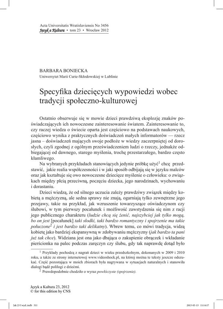 Acta Universitatis Wratislaviensis No 3456 Jêzyk a Kultura • tom 23 • Wrocław 2012 Specyfika dziecięcych wypowiedzi 311 BARBARA BONIECKA Uniwersytet Marii Curie-Skłodowskiej w Lublinie Specyfika dziecięcych wypowiedzi wobec tradycji społeczno-kulturowej Ostatnio obserwuje się w mowie dzieci prawdziwą eksplozję znaków poświadczających ich nowoczesne zainteresowanie światem. Zainteresowanie to, czy raczej wiedza o świecie oparta jest częściowo na podstawach naukowych, częściowo wynika z praktycznych doświadczeń małych informatorów — rzecz jasna – doświadczeń mających swoje podłoże w wiedzy zaczerpniętej od dorosłych, czyli zgodnej z ogólnym przeświadczeniem ludzi o rzeczy, jednakże odbiegającej od dawnego, starego myślenia, trochę przestarzałego, bardzo często kłamliwego. Na wybranych przykładach stanowiących jedynie próbkę użyć1 chcę przedstawić, jakie realia współczesności i w jaki sposób odbijają się w języku malców oraz jak kształtuje się owo nowoczesne dziecięce myślenie o człowieku: o związkach między płcią przeciwną, poczęciu dziecka, jego narodzinach, wychowaniu i dorastaniu. Dzieci wiedzą, że od silnego uczucia zależy prawdziwy związek między kobietą a mężczyzną, ale sedna sprawy nie znają, ogarniają tylko zewnętrzne jego przejawy, takie na przykład, jak wzruszenie towarzyszące oświadczynom czy ślubowi, w tym pierwszy pocałunek i możliwość zawstydzenia się nim z racji jego publicznego charakteru (ludzie chcą się żenić, najszybciej jak tylko mogą, bo on jest [pocałunek] taki słodki, taki bardzo romantyczny i spojrzenie ma takie połuczone2 i jest bardzo taki delikatny). Wbrew temu, co mówi tradycja, widzą kobietę jako bardziej ekspansywną w zdobywaniu mężczyzny (jak bardzo ta pani już tak chce). Widziana jest ona jako dbająca o zakupienie obrączek i wkładanie pierścionka na palec podczas zaręczyn czy ślubu, gdy tak naprawdę dotąd było 1 Przykłady pochodzą z nagrań dzieci w wieku przedszkolnym, dokonanych w 2009 i 2010 roku, a także ze strony internetowej www.videoshock.pl, na której można te teksty jeszcze odszukać. Część pozostająca w moich zbiorach była nagrywana w sytuacjach naturalnych i stanowiła dialogi bądź polilogi z dziećmi. 2 Prawdopodobnie chodziło o wyraz powłóczyste (spojrzenie). Język a Kultura 23, 2012 © for this edition by CNS Jak 23 I wyd..indb 311 2013-03-13 11:14:17 312 BARBARA BONIECKA to domeną mężczyzn (kupuje mu obrączkę, no i mówi „zaręczam się”, a on się buntuje). Na ogół dzieci nie posądzają też młodych o to, że się krępują tym, co do niedawna było intymną czynnością (Wcześniej próbowali, skoro się nie wstydzą, jakaś chwila była już. Zaproponowali sobie, że będą się próbować, dopóki nie zacznie się ich małżeństwo). Przede wszystkim przewidują stosunkowo szybki upadek związku po tym, co było takie romantyczne i co wiodło do trwałego związku (…akurat po ślubie to już oni się znają, co to ciekawego? A jak nie jest to ciekawe, to ludzie się tak dziwią „po co ja się ożeniłem!”. I wtedy dopiero jaka zaczyna się afera! Trudno, miłość musi odejść). Wyczuwalna jest dzisiejsza efemerydalność zarówno miłości, jak i samego małżeństwa, a także brak jakiegokolwiek żalu po tym, jak się związek rozpadnie. Dziennikarka: Co to jest miłość? Chłopczyk: Pan się oświadcza pani. Jak bardzo ta pani już tak chce, to wtedy on się godzi i idą do kościoła, będzie wesele. Dziennikarka: A co to są oświadczyny? Dziewczynka: Dziewczyna, jak już ma wybranego chłopaka, to kupuje mu obrączkę, no i mówi „zaręczam się”, a on się buntuje. Później idą do kościoła, zapraszają gości i wszyscy się usiadają, no i jest wzruszenie. Dziennikarka: A co to jest wzruszenie? Dziewczynka: Ja się wzruszyłam, kiedy moja siostra Paulina wybiła mi zęba krzesłem. Chłopczyk: A jak pan młody z panią młodą idą i się całują i wszyscy na to patrzą, lecą łzy. Dziennikarka: Oni się nie wstydzą tak całować? Chłopczyk: Wcześniej próbowali, skoro się nie wstydzą, jakaś chwila była już. Zaproponowali sobie, że będą się próbować, dopóki nie zacznie się ich małżeństwo. W takiej chwili, kiedy nikt jeszcze nie patrzy, pierwszy pocałunek sobie robią, a już drugi jak ktoś patrzy. Dziennikarka: A dlaczego tak jest? Chłopczyk: No bo może pierwszy może nie wyjść, a już drugi to jest łatwe już. Chłopczyk: Ale mali chłopcy i małe dziewczynki nie powinny patrzeć, to dla nich śmiech. Dziennikarka: Dlaczego? Chłopczyk: Bo one są jeszcze małe, nie rozumią, nie mają piersi, nie mają niczego dorosłego, zarostów i nie mają takiego gustu, nawet nie wiedzą, co to jest. Dziennikarka: A co to jest pocałunek? Dziewczynka: Jest taki bardzo miły i bardzo wtedy ludzie chcą się żenić, najszybciej jak tylko mogą, bo on jest taki słodki, taki bardzo romantyczny i spojrzenie ma takie połuczone i jest bardzo taki delikatny. Język a Kultura 23, 2012 © for this edition by CNS Jak 23 I wyd..indb 312 2013-03-13 11:14:17 Specyfika dziecięcych wypowiedzi 313 Dziennikarka: A czy miłość przed ślubem i tak po ślubie to jest taka sama? Dziewczynka: Nie, bo wtedy akurat po ślubie to już oni się znają, co to ciekawego? A jak nie jest to ciekawe, to ludzie się tak dziwią „po co ja się ożeniłem!” I wtedy dopiero jaka zaczyna się afera! Trudno, miłość musi odejść. Dzieci nie tylko opowiadają, jak wygląda ślubna ceremonia, ale także skupiają się na jej oprawie finansowej i moralnych konsekwencjach wesela. Przede wszystkim — zgodnie z duchem czasu — zaznaczają, że to bardzo kosztowna impreza, wymagająca zadłużenia się w banku (Trzeba się wystroić. No to jest pieniężnie trudne; Trzeba wziąć kredyt, żeby zapłacić za księdza, żeby na kucharki zapracować!). Nie wiążą z aktem zaślubin i ze