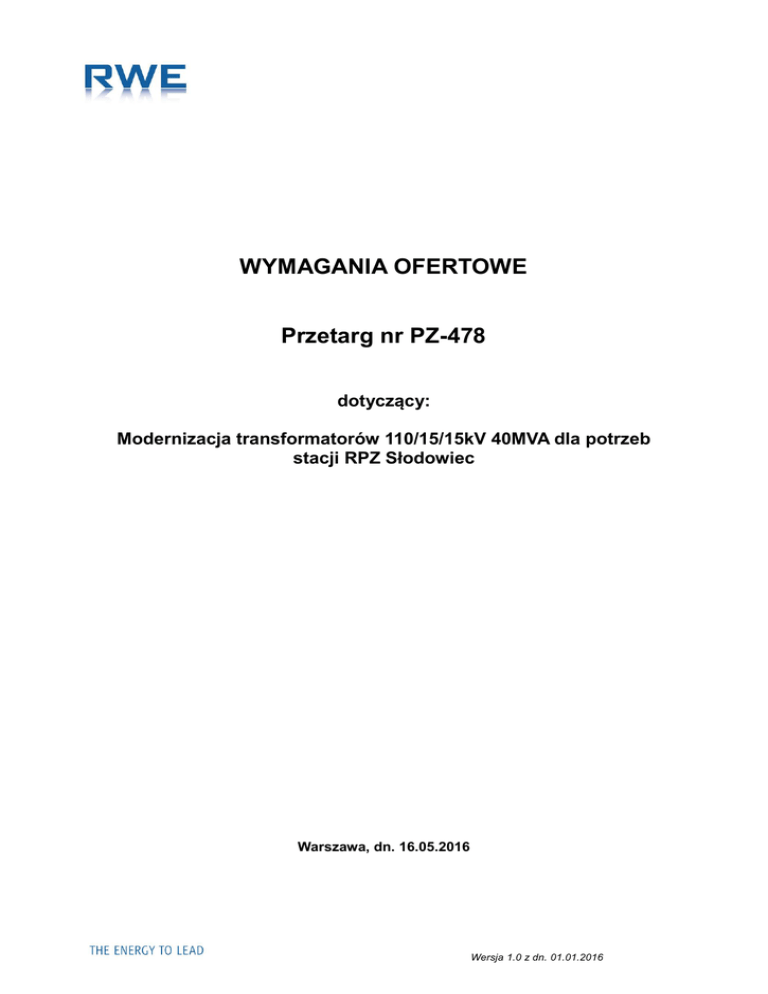WYMAGANIA OFERTOWE Przetarg nr PZ-478 dotyczący: Modernizacja transformatorów 110/15/15kV 40MVA dla potrzeb stacji RPZ Słodowiec Warszawa, dn. 16.05.2016 Wersja 1.0 z dn. 01.01.2016 Przetarg nr PZ-478 1. Dane Ogólne 1.1. RWE Stoen Operator Spółką z ograniczoną odpowiedzialnością z siedzibą przy ul. Pięknej 46, w Warszawie, zwana dalej „Zamawiającym” w imieniu i na rzecz, którego działa: RWE Polska Spółka Akcyjna z siedzibą przy ul. Wybrzeże Kościuszkowskie 41 w Warszawie zaprasza do wzięcia udziału w Przetargu na modernizację transformatorów 110/15/15kV 40MVA dla potrzeb stacji RPZ Słodowiec 1.2. Terminy realizacji przedmiotu przetargu: 1.2.1. Transformator z RPZ Stegny dla stacji RPZ Słodowiec (stanowisko nr 1) Termin zgłoszenia gotowości zmodernizowanej jednostki do odbioru technicznego u producenta nie później niż do 31.03.2017r. Zamawiający przystąpi do odbioru technicznego w terminie 14 dni od daty zgłoszenia gotowości danej jednostki do odbioru technicznego (nie wcześniej niż miesiąc od wymaganego terminu realizacji zamówienia). Planowany termin transportu jednostki do stacji RPZ Słodowiec lub innej wskazanej stacji energetycznej na terenie Warszawy nie później niż 8 miesięcy od daty odbioru technicznego u producenta. 1.2.2. Transformator z RPZ Słodowiec (stanowisko nr 1) dla stacji RPZ Słodowiec (stanowisko nr 2) Termin zgłoszenia gotowości zmodernizowanej jednostki do odbioru technicznego u producenta nie później niż 10 miesięcy od daty jej demontażu ze stacji RPZ Słodowiec lecz nie wcześniej niż 31.01.2018r. Zamawiający przystąpi do odbioru technicznego w terminie 14 dni od daty zgłoszenia gotowości danej jednostki do odbioru technicznego. Planowany termin transportu jednostki do stacji RPZ Słodowiec lub innej wskazanej stacji energetycznej na terenie Warszawy nie później niż 6 miesięcy od daty odbioru technicznego u producenta. 1.3. O udzielenie zamówienia ubiegać się mogą Oferenci spełniający następujące warunki: 1.3.1. posiadają niezbędne uprawnienia do występowania w obrocie prawym; 1.3.2. pracownicy Oferenta posiadają niezbędne doświadczenie oraz uprawnienia do wykonywania prac będących przedmiotem Przetargu; 1.3.3. wykaz ważniejszych prac/referencje z przynajmniej 2 zrealizowanych zadań w okresie ostatnich 5 lat o charakterze i złożoności porównywalnej z zakresem Przetargu. (Kontakt do osoby, która może je potwierdzić); Zamawiający uznaje potwierdzenie referencji wystawione przez firmy, które eksploatują transformatory w swoich zakładach; 1.3.4. w ostatnich 5 latach zrealizowali co najmniej 2 zadań o charakterze i złożoności porównywalnej z zakresem Przetargu; 1.3.5. nie zalegają z płatnościami wobec Urzędu Skarbowego i ZUS oraz znajdują się w sytuacji finansowej pozwalającej na wykonanie przedmiotu Przetargu. 1 Przetarg nr PZ-478 2. Procedura Przetargowa Przetarg składa się z dwóch etapów: Etap I – Zgłoszenie chęci udziału, Etap II – Złożenie ofert w za pośrednictwem Portalu Dostawcy RWE: https://supplier.rwe.com/irj/portal/ 2.1. ETAP I. Zgłoszenie chęci wzięcia udziału w Przetargu odbywa się na podstawie zeskanowanego wypełnionego i podpisanego Formularza Zgłoszenia (Załącznik 1), który należy wysłać mailem w terminie do 25.05.2016r. do godziny 12 00 na e-mail: [email protected] 2.1.1. Zamawiający udostępni Oferentom materiały szkoleniowe dot. obsługi Portalu Dostawcy RWE. Po weryfikacji danych Oferenta materiały szkoleniowe zostaną wysłane drogą elektroniczną na adres e-mail podany na Formularzu Zgłoszenia. 2.1.2. Dodatkowo, do formularza zgłoszenia, oferent załączy zeskanowane: 2.1.2.1. plik z danymi z KRS lub z Centralnej Ewidencji i Informacji o Działalności Gospodarczej Rzeczpospolitej Polskiej; 2.1.2.2. dowody posiadania przez pracowników doświadczenia: np. uprawnienia budowlane, Oferenta niezbędnego zaświadczenie o przynależności do IIB itp.; 2.1.2.3. wykaz ważniejszych prac/referencje z przynajmniej 2 zrealizowanych zadań w okresie ostatnich 5 lat o charakterze i złożoności porównywalnej z zakresem Przetargu. (Kontakt do osoby, która może je potwierdzić); Zamawiający uznaje potwierdzenie referencji wystawione przez firmy, które eksploatują transformatory w swoich zakładach. 2.2. ETAP II. Złożenie ofert za pośrednictwem Portalu Dostawcy RWE: https://supplier.rwe.com/irj/portal/. Oferta powinna zawierać: 2.2.1. Wypełniony załącznik Formularz Oferty Handlowo Technicznej do przetargu PZ - 478 – Załącznik nr 3. 2.2.2. Wysokość wynagrodzenia za realizację przedmiotu Przetargu. Wycena przedmiotu Przetargu polega na podaniu kwot bez VAT, obejmujących całość przedmiotu Przetargu. Wynagrodzenie musi pokrywać wartość kompletnej realizacji przedmiotu Przetargu, w tym koszty inwentaryzacji, koszty uzyskania wszelkich niezbędnych do rozpoczęcia realizacji przedmiotu Przetargu opinii, uzgodnień, materiałów, pozwoleń, decyzji, itp.; 2.2.3. Termin realizacji przedmiotu Przetargu. 2.2.4. Czas trwanie gwarancji: Producent udzieli gwarancji na okres 60-ciu miesięcy licząc od daty Protokołu Odbioru Końcowego lecz nie dłużej niż 78 miesięcy licząc od dnia 2 Przetarg nr PZ-478 odbioru technicznego w fabryce na: szczelność kadzi, szczelność innych elementów, pokrycia malarskie (antykorozyjne), poprawną pracę jednostki w sieci. 2.2.5. Oświadczenie o sytuacji finansowej – odpowiedź na pytania postawione na portalu. 2.3. Składanie oferty 2.3.1. Dokumenty wymienione w punkcie 2.2. należy złożyć w terminie do 20.06.2016r. do godziny 12 00 za pośrednictwem Portalu Dostawcy RWE: https://supplier.rwe.com/irj/portal/. 2.3.2. Oferta będzie wprowadzona do Portalu w języku polskim przez uprawnionego przedstawiciela Oferenta. 2.3.3. Wszystkie oferty otrzymane przez Zamawiającego w formie innej niż za pośrednictwem Portalu Dostawcy RWE lub po terminie podanym powyżej nie bę