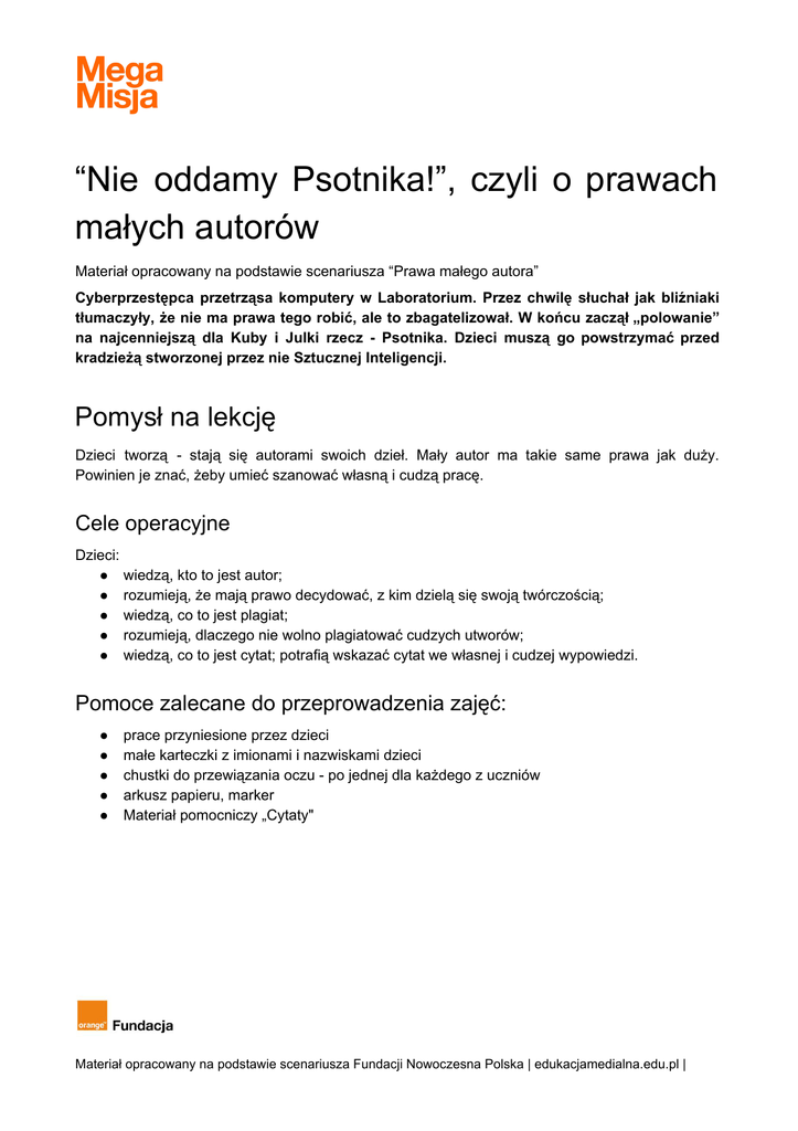 “Nie oddamy Psotnika!”, czyli o prawach małych autorów Materiał opracowany na podstawie scenariusza “Prawa małego autora” Cyberprzestępca przetrząsa komputery w Laboratorium. Przez chwilę słuchał jak bliźniaki tłumaczyły, że nie ma prawa tego robić, ale to zbagatelizował. W końcu zaczął „polowanie” na najcenniejszą dla Kuby i Julki rzecz Psotnika. Dzieci muszą go powstrzymać przed kradzieżą stworzonej przez nie Sztucznej Inteligencji. Pomysł na lekcję Dzieci tworzą stają się autorami swoich dzieł. Mały autor ma takie same prawa jak duży. Powinien je znać, żeby umieć szanować własną i cudzą pracę. Cele operacyjne Dzieci: ● wiedzą, kto to jest autor; ● rozumieją, że mają prawo decydować, z kim dzielą się swoją twórczością; ● wiedzą, co to jest plagiat; ● rozumieją, dlaczego nie wolno plagiatować cudzych utworów; ● wiedzą, co to jest cytat; potrafią wskazać cytat we własnej i cudzej wypowiedzi. Pomoce zalecane do przeprowadzenia zajęć: ● ● ● ● ● prace przyniesione przez dzieci małe karteczki z imionami i nazwiskami dzieci chustki do przewiązania oczu po jednej dla każdego z uczniów arkusz papieru, marker Materiał pomocniczy „Cytaty" Materiał opracowany na podstawie scenariusza Fundacji Nowoczesna Polska | edukacjamedialna.edu.pl | Przebieg zajęć Julka: Kuba, popatrz. Ten okropny przestępca w ogóle nie przejął się tym, co mówiliśmy o łamaniu naszych praw. Kuba: O nie, on cały czas szuka Psotnika! Julka: Twierdzi, że nie zabierze go, tylko skopiuje i sprzeda. Kuba: Ale przecież on jest nasz, to my go stworzyliśmy! Julka: Nikomu nie wolno zabrać Psotnika bez naszej zgody! Przed zajęciami poproś uczniów, żeby przynieśli na lekcję coś, co sami zrobili i chcieliby się tym pochwalić przed innymi. Mogą to być prace plastyczne, robótki ręczne, sklejone modele samolotów, napisany przez dziecko wiersz lub opowiadanie, wykonane zdjęcia, a nawet upieczone ciastka. Wytwory dzieci mogą być związane z zajęciami lekcyjnymi, ale lepiej, jeśli dzieci zaprezentują coś zrobionego w wolnym czasie. Jeśli wykonanego dzieła nie da się przynieść do szkoły, poproś o sfotografowanie go. Bardzo ważne dla zajęć jest, żeby dzieci przyniosły dzieła, z których są szczególnie dumne. Krok 1. Cyberwłamywacz zaczął szukać w sieci Laboratorium Psotnika. Zamierza sprzedać kod źródłowy Psotnika jako swój własny, jak tylko go znajdzie. Jednak Psotnika stworzyły dzieci swoją ciężką pracą i nikt inny nie ma do niego prawa. Julka: Psotnik jest nasz, łobuzie! Kuba: Poświęciliśmy mnóstwo czasu tworząc go! To nasza praca i nasz przyjaciel! Julka: I co z tego, że nie zabierzesz naszego Psotnika, tylko go skopiujesz. My się na to nie zgadzamy! Kuba: Nikt nie ma prawa przedstawiać pracy kogoś innego, jako własnej. Nawet, jeśli byłby to „tylko” rysunek czy wierszyk. Julka: Albo praca domowa! Ten spryciarz pewnie ściągał w szkole od innych dzieci! Kuba: Na pewno. Słuchajcie, musimy go czymś zająć zanim informatycy z Laboratorium zdołają go przepędzić. Tylko jak? Julka: Słuchaj, trzeba przynieść jak najwięcej rysunków, wierszyków i co tam tylko mamy. Skoro tak lubi cudze prace, to dajmy mu ich tyle, by mu się w głowie zakręciło. Dzieci na pewno mają jakieś swoje dzieła, które możemy mu podsunąć! Byle więcej! Pomożecie? Materiał opracowany na podstawie scenariusza Fundacji Nowoczesna Polska | edukacjamedialna.edu.pl | Dzieci siedzą w kręgu; układają przed sobą własne prace. Poproś, żeby opowiedziały po kolei w 23 zdaniach o swojej pracy (np. jaki ma tytuł lub o czym jest, w jakich okolicznościach powstała, dlaczego jest dla nich ważna). Powiedz, że każdy i każda z nich jest autorem lub autorką. Autor/autorka to osoba, która stworzyła coś samodzielnie, według własnego pomysłu. Podziękuj dzieciom, że jako autorki i autorzy zechcieli się podzielić swoją twórczością, czyli pokazać ją kolegom i koleżankom. Poproś, aby uczniowie ułożyli swoje dzieła na podłodze albo na ławkach zsuniętych w środku sali. Czas: 10 Metoda: rozmowa Pomoce: prace przyniesione przez dzieci Krok 2. Dzieci z zapałem przekonują włamywacza, że Psotnik to ich własność. On sobie z tego wiele nie robi, ale rozmowa z bliźniakami odwraca jego uwagę od tego, że informatycy z Laboratorium zastawiają na niego pułapkę. Cyberprzestępca nadal usiłuje schwytać Psotnika. Julka: Co? Kuba, on mówi, że Psotnik nie jest podpisany, więc nie należy do nikogo! Kuba: Okropność! Co z tego, że nie jest podpisany. A ma gdzieś napisane, że może sobie go zabrać ktokolwiek zechce? Julka: O nie... Powiedział, że zaraz wprowadzi zmiany do kodu Psotnika i napisze, że to on go stworzył! Kuba: Przecież to nieprawda! Szybko, musimy coś z tym zrobić! Może zmienimy wygląd Psotnika? To pozwoli go ukryć chociaż na chwilę. Julka: Dobrze, spróbuj „przebrać” Psotnika, a ja postaram się wkleić w kodzie informację, że to my go stworzyliśmy. Kuba: Super! Możecie nam w tym pomóc? Rozdaj uczniom wcześniej przygotowane karteczki z ich imionami i nazwiskami. Poproś, żeby każdy położył karteczkę przy swoim dziele, tak żeby było wiadomo, kto jest jego autorem/autorką. Poproś, by wszyscy usiedli na podłodze i zawiązali sobie oczy chustkami. W tym czasie zrób na stole szybkie przetasowanie: pomieszaj karteczki, niektóre w ogóle usuń, przy innych połóż więcej przedmiotów. Poproś uczniów, żeby podeszli do stołu. Zapytaj, jak się czują. Czy to miłe, że ich prace są nagle podpisane innym nazwiskiem? Co czują ci, których nazwiska w ogóle zniknęły? Co czują ci, którzy nagle zostali autorami cudzych prac? Powiedz, że takie działania są niezgodne z prawem. Nikomu nie wolno podpisać się pod cudzą pracą ani usunąć nazwiska autora. Przywróćcie na stole właściwy porządek. Czas: 10 
