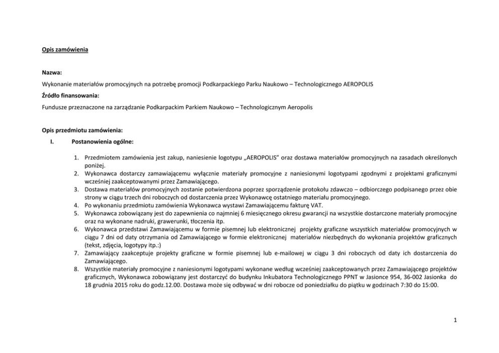 Opis zamówienia Nazwa: Wykonanie materiałów promocyjnych na potrzebę promocji Podkarpackiego Parku Naukowo – Technologicznego AEROPOLIS Źródło finansowania: Fundusze przeznaczone na zarządzanie Podkarpackim Parkiem Naukowo – Technologicznym Aeropolis Opis przedmiotu zamówienia: I. Postanowienia ogólne: 1. Przedmiotem zamówienia jest zakup, naniesienie logotypu „AEROPOLIS” oraz dostawa materiałów promocyjnych na zasadach określonych poniżej. 2. Wykonawca dostarczy zamawiającemu wyłącznie materiały promocyjne z naniesionymi logotypami zgodnymi z projektami graficznymi wcześniej zaakceptowanymi przez Zamawiającego. 3. Dostawa materiałów promocyjnych zostanie potwierdzona poprzez sporządzenie protokołu zdawczo – odbiorczego podpisanego przez obie strony w ciągu trzech dni roboczych od dostarczenia przez Wykonawcę ostatniego materiału promocyjnego. 4. Po wykonaniu przedmiotu zamówienia Wykonawca wystawi Zamawiającemu fakturę VAT. 5. Wykonawca zobowiązany jest do zapewnienia co najmniej 6 miesięcznego okresu gwarancji na wszystkie dostarczone materiały promocyjne oraz na wykonane nadruki, grawerunki, tłoczenia itp. 6. Wykonawca przedstawi Zamawiającemu w formie pisemnej lub elektronicznej projekty graficzne wszystkich materiałów promocyjnych w ciągu 7 dni od daty otrzymania od Zamawiającego w formie elektronicznej materiałów niezbędnych do wykonania projektów graficznych (tekst, zdjęcia, logotypy itp.:) 7. Zamawiający zaakceptuje projekty graficzne w formie pisemnej lub e-mailowej w ciągu 3 dni roboczych od daty ich dostarczenia do Zamawiającego. 8. Wszystkie materiały promocyjne z naniesionymi logotypami wykonane według wcześniej zaakceptowanych przez Zamawiającego projektów graficznych, Wykonawca zobowiązany jest dostarczyć do budynku Inkubatora Technologicznego PPNT w Jasionce 954, 36-002 Jasionka do 18 grudnia 2015 roku do godz.12.00. Dostawa może się odbywać w dni robocze od poniedziałku do piątku w godzinach 7:30 do 15:00. 1 II. Szczegółowy opis zamówienia Nazwa Ilość szt. Kolor Znakowanie Opis Format: A4 tygodniowe Rozmiar: ok. 210 x 297mm Surowiec: okładka Eko skóra w kolorze brązowym jasnym i brązowym ciemnym, kalendarium – papier offsetowy biały Kalendarz książkowy na rok 2016 50 sztuk jasny brąz, Rysunek poglądowy: 100 50 sztuk brąz ciemny Tłoczenie na okładce, logo Aeropolis w górnej części okładki, Zawartość: układ tygodniowy, imieniny i święta, atlas z mapami (pełen kolor), wstążka wewnętrzna kalendarza, część informacyjna zawierająca co najmniej: numery kierunkowe, międzynarodowe, odległości drogowe, notes teleadresowy, mapa Polski, mapa Europy. Bez stopki wydawniczej. Rodzaj druku: druk offsetowy wysokiej jakości 2 Format: A6 Kalendarz książkowy, kieszonkowy A6 na rok 2016 Rozmiar: ok. 87 x 150 mm Rysunek poglądowy: 50 50 sztuk różowy, Tłoczenie na okładce, logo Aeropolis w górnej części okładki, Surowiec: okładka Eko skóra w kolorze różowy, papier chamois 70g, druk szaro-bordowy Zawartość: układ tygodniowy, wstążka wewnętrzna, część informacyjna, mapy na wyklejkach, notes tele - adresowy III. Kody CPV : 30199792-8 – Kalendarze IV. Wymagania dodatkowe: a) Wykonawca jest zobowiązany do uwzględnienia przy wycenie wykonania projektów graficznych materiałów promocyjnych objętych przedmiotem zamówienia. b) Wykonawca jest zobowiązany do naniesienia na każdej sztuce dostarczonego materiału promocyjnego następującego logotypu: 3 c) W szczególnie uzasadnionym przypadku Zamawiający dopuszcza zmianę umiejscowienia logotypów po uprzednim uzyskaniu zgody Zamawiającego na przedmiotową zmianę. Powyższa zmiana objęta jest ceną zaoferowaną przez Wykonawcę. 4