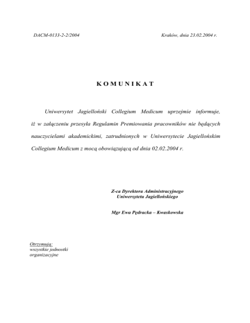 DACM-0133-2-2/2004 Kraków, dnia 23.02.2004 r. KOMUNIKAT Uniwersytet Jagielloński Collegium Medicum uprzejmie informuje, iż w załączeniu przesyła Regulamin Premiowania pracowników nie będących nauczycielami akademickimi, zatrudnionych w Uniwersytecie Jagiellońskim Collegium Medicum z mocą obowiązującą od dnia 02.02.2004 r. Z-ca Dyrektora Administracyjnego Uniwersytetu Jagiellońskiego Mgr Ewa Pędracka – Kwaskowska Otrzymują: wszystkie jednostki organizacyjne REGULAMIN PREMIOWANIA pracowników nie będących nauczycielami akademickimi, zatrudnionych w Uniwersytecie Jagiellońskim Collegium Medicum Na podstawie art. 75 ust. 4 ustawy z dnia 12.09.1990 r. o szkolnictwie wyższym (Dz.U. nr 65 poz. 385, z póź. zm.), § 37 ust. 1 i 2 rozporządzenia Ministra Edukacji Narodowej z dnia 26.09.2001 r. w sprawie warunków wynagradzania za pracę i przyznawania innych świadczeń związanych z pracą dla pracowników uczelni państwowych (Dz.U. nr 107 poz. 1182 z póź. zm.) oraz art. 41 i art. 42 ustawy z dnia 25.06.1999 r. o świadczeniach pieniężnych z ubezpieczenia społecznego w razie choroby i macierzyństwa (Dz.U. nr 60 poz. 636 z póź. zm.), wprowadza się regulamin premiowania. § 1. 1.W ramach posiadanych środków na w Uniwersytecie Jagiellońskim Collegium z przeznaczeniem na premie dla pracowników. wynagrodzenia tworzy się Medicum fundusz premiowy 2. Fundusz premiowy ustala się w wysokości do 40 % odpisu od wynagrodzeń zasadniczych pracowników. 3. Premia ma charakter złożony i składa się z premii regulaminowej i premii uznaniowej. 4. Wysokość premii regulaminowej ustala się w wymiarze: - 35 % wynagrodzenia zasadniczego pracownika dla kadry kierowniczej - 25 % wynagrodzenia zasadniczego pracownika dla pozostałych pracowników. 5. Premia regulaminowa i uznaniowa łącznie nie może przekroczyć 60 % wynagrodzenia zasadniczego pracownika. § 2. Regulamin dotyczy pracowników: 1. 2. 3. 4. naukowo-technicznych bibliotecznych oraz dokumentacji i informacji naukowej administracyjnych, ekonomicznych i obsługi zatrudnionych na stanowiskach robotniczych zwanych dalej „pracownikami”. § 3. 1. Premia regulaminowa nie przysługuje pracownikowi w części lub w całości w okresie, za który jest przyznawana, niezależnie od kar porządkowych wynikających z Kodeksu pracy i Regulaminu Pracy w przypadku: 1/ nie wywiązywania się z obowiązków pracowniczych oraz niskiej jakości pracy, 2/ nieusprawiedliwionej nieobecności w pracy, 3/ samowolnego opuszczenia stanowiska pracy, 4/ odmowy wykonania polecenia służbowego, 5/ stawienia się do pracy w stanie nietrzeźwym lub spożywania alkoholu na terenie zakładu pracy 6/ ponad 3 – krotnego w ciągu miesiąca nieusprawiedliwionego spóźnienia się do pracy, 7/ spowodowania strat materialnych Uczelni, 8/ zagarnięcia mienia społecznego, 9/ zagubienia lub zniszczenia przydzielonych narzędzi pracy, środków i odzieży ochronnej lub roboczej a także nie rozliczania się z przydziału tych rzeczy, 10/ nie przestrzegania obowiązujących przepisów bhp i ppoż. 11/ naruszenia innych postanowień Regulaminu Pracy lub przepisów Kodeksu pracy. 2. Decyzję o zmniejszeniu lub o nie przyznaniu premii regulaminowej podejmuje Prorektor UJ d/s Collegium Medicum lub odpowiednio z-ca Dyrektora Administracyjnego UJ w Collegium Medicum na wniosek: 1/ bezpośredniego przełożonego, 2/ Kierownika Działu Spraw Osobowych w sprawach określonych w § 3 ust. 1 pkt 2, 3, 4, 3/ Kwestora w sprawach określonych w w § 3 ust. 1 pkt 7, 8, 9, 10, 4/ Służby bhp i p.poż. w przypadku naruszenia przepisów bhp i p.poż. 3. Premia uznaniowa jest szczególnym wyróżnieniem i powinna być zróżnicowana zależnie od oceny wywiązywania się z obowiązków i wykonywania prac wykraczających poza obowiązkowy zakres czynności. 4. Premia uznaniowa może być przyznana pracownikowi, jeżeli bezpośredni przełożony złoży umotywowany wniosek. § 4. 1. Wnioski premiowe dla pracowników opracowują w ramach odpisu: - kierownicy pionów organizacyjnych dla kierowników komórek organizacyjnych i samodzielnych stanowisk pracy - kierownicy komórek organizacyjnych dla podległych pracowników. 2. Wnioski premiowe zatwierdza i premię przyznaje: - dla kierowników komórek organizacyjnych i samodzielnych stanowisk pracy – Prorektor UJ d/s Collegium Medicum lub z jego upoważnienia Zastępca Dyrektora Administracyjnego UJ w Collegium Medicum - dla pozostałych pracowników – Zastępca Dyrektora Administracyjnego UJ w Collegium Medicum. § 5. 1. Wnioski Premiowe składane są do Działu Spraw Osobowych Uniwersytetu Jagiellońskiego Collegium Medicum w terminie do 5-go dnia każdego miesiąca za miesiąc poprzedni. 2. Premia naliczana jest i wypłacana w okresach miesięcznych, w obowiązujących w Uniwersytecie Jagiellońskim Collegium Medicum terminach wypłat wynagrodzeń. 3. Pracownik w terminie 3-ch dni od otrzymania premii lub zawiadomienia o nie przyznaniu bądź zmniejszeniu premii może wnieść odwołanie do Prorektora UJ d/s Collegium Medicum lub Zastępcy Dyrektora UJ w Collegium Medicum. § 6. Pracownikom uprawnionym do premii w okresie pobierania zasiłku chorobowego premię wlicza się do podstawy wynagrodzenia na zasadach określonych w ustawie z dnia 25.06.1999 r. o świadczeniach pieniężnych z ubezpieczenia społecznego w razie choroby i macierzyństwa (Dz.U. nr 60 poz. 636 z póź. zm.). § 7. Z dniem wejścia w życie niniejszego regulaminu traci moc dotychczas obowiązujący regulamin premiowania z dnia 15.09.1995 r. (z póź. zm.). § 8. Niniejszy regulamin został uzgodniony z działającymi w Uniwersytecie Jagiellońskim Collegium Medicum organizacjami związkowymi i wchodzi w życie z dniem podpisania. Kraków, dnia 02.02.2004 r. PROREKTOR Uniwersytetu Jagiellońskiego d/s Collegium Medicum Prof. dr hab. med. Marek Zembala