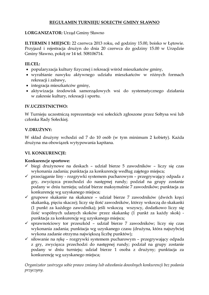 REGULAMIN TURNIEJU SOŁECTW GMINY SŁAWNO I.ORGANIZATOR: Urząd Gminy Sławno II.TERMIN I MIEJSCE: 22 czerwca 2013 roku, od godziny 15.00, boisko w Łętowie. Przyjazd i rejestracja drużyn do dnia 20 czerwca do godziny 15.00 w Urzędzie Gminy Sławno, pokój nr 14 tel. 508106714. III.CEL: • popularyzacja kultury fizycznej i rekreacji wśród mieszkańców gminy, • wyrabianie nawyku aktywnego udziału mieszkańców w różnych formach rekreacji i zabawy, • integracja mieszkańców gminy, • aktywizacja środowisk samorządowych wsi do systematycznego działania w zakresie kultury, rekreacji i sportu. IV.UCZESTNICTWO: W Turnieju uczestniczą reprezentacje wsi sołeckich zgłoszone przez Sołtysa wsi lub członka Rady Sołeckiej. V.DRUŻYNY: W skład drużyny wchodzi od 7 do 10 osób (w tym minimum 2 kobiety). Każda drużyna ma obowiązek wytypowania kapitana. VI. KONKURENCJE: Konkurencje sportowe: biegi drużynowe na deskach – udział bierze 5 zawodników – liczy się czas wykonania zadania; punktacja za konkurencję według zajętego miejsca; przeciąganie liny - rozgrywki systemem pucharowym – przegrywający odpada z gry, zwycięzca przechodzi do następnej rundy; podział na grupy zostanie podany w dniu turnieju; udział bierze maksymalnie 7 zawodników; punktacja za konkurencję wg uzyskanego miejsca; grupowe skakanie na skakance – udział bierze 7 zawodników (dwóch kręci skakanką, pięciu skacze); liczy się ilość zawodników, którzy wskoczą do skakanki (1 punkt za każdego zawodnika); jeśli wskoczą wszyscy, dodatkowo liczy się ilość wspólnych udanych skoków przez skakankę (1 punkt za każdy skok) punktacja za konkurencję wg uzyskanego miejsca; sprawnościowy tor przeszkód – udział bierze 7 zawodników; liczy się czas wykonania zadania; punktacja wg uzyskanego czasu (drużyna, która najszybciej wykona zadanie otrzyma największą liczbę punktów); siłowanie na rękę – rozgrywki systemem pucharowym – przegrywający odpada z gry, zwycięzca przechodzi do następnej rundy; podział na grupy zostanie podany w dniu turnieju; udział bierze 1 osoba z drużyny; punktacja za konkurencję wg uzyskanego miejsca; Organizator zastrzega sobie prawo zmiany lub odwołania dowolnych konkurencji bez podania przyczyny. Pozostałe konkurencje: Konkurs lepienia pierogów z truskawkami na czas w konkurencji biorą udział drużyny 2-osobowe, które w czasie 15 minut będą musiały przygotować jak największą liczbę pierogów z truskawkami z produktów dostarczonych przez organizatora; do dyspozycji każdej drużyny będzie 1 kg mąki, woda, sól, 0,5 kg truskawek; każde sołectwo we własnym zakresie przygotowuje narzędzia niezbędne do przygotowania pierogów, takich jak wałek czy stolnica; Sposób oceny Punkty przyznawane będą według ilości wykonanych pierogów; każdy pieróg musi być wypełniony truskawkami i nie może się rozklejać; punktacja jak w konkurencjach sportowych – sołectwo, którego drużyna wykona największą ilość dobrze zlepionych, wypełnionych truskawkami pierogów otrzyma największą liczbę punktów; Organizator zastrzega sobie prawo odwołania Konkursu bez podania przyczyn. Konkurs na najładniejsze stoisko oceniana będzie pomysłowość i estetyka stoiska; Sposób oceny punkty przyznawane będą w następujący sposób: za każde przygotowane stoisko 3 punkty, dodatkowe punkty za pierwsze 3 miejsca: za I miejsce 4 punkty, za II miejsce 3 punkty, za III miejsce 2 punkty; Organizator zastrzega sobie prawo odwołania Konkursu bez podania przyczyn. Konkurs „Łętowskie Wianki” konkurs poprzedzony zostanie warsztatami plecenia wianków, które przeprowadzą członkinie Koła Gospodyń Wiejskich z Kwasowa; dwuosobowe drużyny z każdego sołectwa będą miały 1,5 godziny na przygotowanie wianka; każda drużyna we własnym zakresie zabezpiecza materiały do wykonania wianka; ponadto każde sołectwo powinno wytypować pannę spośród swoich mieszkańców i odpowiednio ją przystroić do puszczenia wianka na wodę; w konkursie oceniane będą: ubiór panny oraz wianek wykonany podczas imprezy; Sposób oceny punkty przyznawane będą w następujący sposób: za przygotowanie panny 2 punkty, za wykonanie wianka 2 punkty; dodatkowe punkty za pierwsze 3 miejsca: za I miejsce 3 punkty, za II miejsce 2 punkty, za III miejsce 1 punkt. Organizator zastrzega sobie prawo odwołania Konkursu bez podania przyczyn. VII. PUNKTACJA W KONKURENCJACH SPORTOWYCH Konkurencje sportowe oceniane będą w następujący sposób: za I miejsce przyznaje się maksymalną ilość punktów odpowiadającą ilości drużyn biorących udział w turnieju sołectw, a za każde kolejne miejsca przyznaje się o 1 punkt mniej, aż do ostatniego miejsca, za które przysługuje 1 punkt, np. jeśli w turnieju bierze udział 12 sołectw to za I miejsce przyznaje się 12 punktów, za II miejsce 11 punktów, za III miejsce 10 punktów itd., a za XII (ostatnie) miejsce 1 punkt; w przypadku zajęcia równorzędnych miejsc przez dwa lub większą ilości sołectw uznaje się, że zajmują one to samo miejsce i otrzymują taka samą ilość punktów, a kolejne sołectwo otrzymuje o odpowiednią liczbę punktów mniej, np. jeśli udział w turnieju bierze 12 sołectw i w jednej konkurencji 3 sołectwa zajmą z takim samym wynikiem jednocześnie II miejsce, to przyznaje im się im po 11 punktów, ale kolejne sołectwo ma dopiero miejsce V i w związku z tym otrzymuje 8 punktów; VIII. POSTANOWIENIA KOŃCOWE każda drużyna biorąca udział w turnieju ma prawo zrezygnować z udziału w wybranych konkurencjach, zgodnie z deklaracją złożoną na formularzu zgłoszeniowym (w załączeniu), jednak w takim wypadku za konkurencję w której drużyna nie bierze udziału Sołectwo otrzymuje 0 punktów, zawodników obowiązuje strój sportowy, drużyny zobowiązane są do przygotowania tablic informacyjnych zawierających nazwę sołectwa (w dowolnej formie), organizator