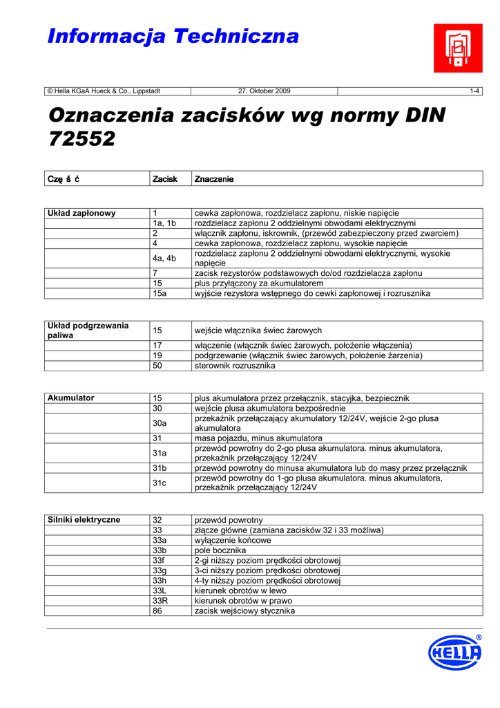1 Informacja Techniczna © Hella KGaA Hueck & Co., Lippstadt 27. Oktober 2009 Oznaczenia zacisków wg normy DIN 72552 Czę ś ć Zacisk Znaczenie Układ zapłonowy 1 1a, 1b 2 4 7 15 15a cewka zapłonowa, rozdzielacz zapłonu, niskie napięcie rozdzielacz zapłonu 2 oddzielnymi obwodami elektrycznymi włącznik zapłonu, iskrownik, (przewód zabezpieczony przed zwarciem) cewka zapłonowa, rozdzielacz zapłonu, wysokie napięcie rozdzielacz zapłonu 2 oddzielnymi obwodami elektrycznymi, wysokie napięcie zacisk rezystorów podstawowych do/od rozdzielacza zapłonu plus przyłączony za akumulatorem wyjście rezystora wstępnego do cewki zapłonowej i rozrusznika 15 wejście włącznika świec żarowych 17 19 50 włączenie (włącznik świec żarowych, położenie włączenia) podgrzewanie (włącznik świec żarowych, położenie żarzenia) sterownik rozrusznika 15 30 plus akumulatora przez przełącznik, stacyjka, bezpiecznik wejście plusa akumulatora bezpośrednie przekaźnik przełączający akumulatory 12/24V, wejście 2-go plusa akumulatora masa pojazdu, minus akumulatora przewód powrotny do 2-go plusa akumulatora. minus akumulatora, przekaźnik przełączający 12/24V przewód powrotny do minusa akumulatora lub do masy przez przełącznik przewód powrotny do 1-go plusa akumulatora. minus akumulatora, przekaźnik przełączający 12/24V 4a, 4b Układ podgrzewania paliwa Akumulator 30a 31 31a 31b 31c Silniki elektryczne 32 33 33a 33b 33f 33g 33h 33L 33R 86 przewód powrotny złącze główne (zamiana zacisków 32 i 33 możliwa) wyłączenie końcowe pole bocznika 2-gi niższy poziom prędkości obrotowej 3-ci niższy poziom prędkości obrotowej 4-ty niższy poziom prędkości obrotowej kierunek obrotów w lewo kierunek obrotów w prawo zacisk wejściowy stycznika 1-4 2 Informacja Techniczna © Hella KGaA Hueck & Co., Lippstadt Sygnalizatory kierunku jazdy wejście przerywacza 49a 49b 49c C C0 C2,C3 L R wyjście przerywacza, wejście (zestyk środkowy) włącznika kierunkowskazu wyjście przerywacza 2-go obwodu kierunkowskazu wyjście przerywacza 3-go obwodu kierunkowskazu 1-wsza kontrolka kierunkowskazu złącze główne oddzielnej kontrolki 2-ga i 3-cia kontrolka kierunkowskazu kierunkowskazy lewe kierunkowskazy prawe wyjście zespolonych lamp kierunkowskazu-światła hamowania w maszynach pociągowych i przyczepach, lewych wyjście zespolonych lamp kierunkowskazu-światła hamowania w maszynach pociągowych i przyczepach, prawych R54 45 50c 50d 50e 50f 50g oddzielny przekaźnik rozruchowy, wyjście, rozrusznik: wejście (prąd główny) tryb równoległy 2-rozrusznikowy, przekaźnik prądu włączenia rozrusznika, wyjście rozrusznika 1 tryb równoległy 2-rozrusznikowy, przekaźnik prądu włączenia rozrusznika, wyjście rozrusznika 2 zacisk rozrusznika i przekaźniku powtórnego rozruchu rozrusznik, bezpośrednie wysterowanie rozruchu przekaźnik przełączający akumulatory, wyjście do sterownika rozrusznika sterownik rozrusznika, tryb równoległej pracy 2 rozruszników ze sterownikiem wtórnym wejście w przekaźniku rozrusznika dla rozrusznika 1 wejście w przekaźniku rozrusznika dla rozrusznika 2 wejście przekaźnika blokady rozruchu wyjście przekaźnika blokady rozruchu wejście przekaźnika powtórnego rozruchu 51 napięcie stałe na prostowniku 51e 59 59a 59b 59c 63 63a 64 jak 51, ale z cewką dławikową dla jazdy dziennej wyjście napięcie zmiennego, wejście prostownika, włącznik świateł wyjście twornika ładującego wyjście twornika światła tylnego wyjście twornika światła hamowania zacisk regulator do zmiany napięcia regulatora zacisk regulator do zmiany wartości granicznej prądu przewód sterujący generatora 45a 45b 48 50 50a 50b Generator prądu zmiennego 2-4 49 L54 Rozrusznik 27. Oktober 2009 3 Informacja Techniczna © Hella KGaA Hueck & Co., Lippstadt Generator, regulator generatora 27. Oktober 2009 3-4 61 kontrola ładowania z generatora B+ BD+ DDF DF1 DF2 U, V, W plus akumulatora minus akumulatora plus prądnicy minus prądnicy pole prądnicy pole prądnicy 1 pole prądnicy 2 zaciski prądu trójfazowego Spryskiwacz szyb 53 53a 53b 53c 53e 53i wejście plus silniczka wycieraczek wyłączenie końcowe plus uzwojenie bocznikowe elektryczno myjąca pompa wycierająco-myjąca uzwojenie hamujące silniczek wycieraczek z magnesem stałym, trzecia szczotka wyższej szybkości Oświetlenie 54 55 56 56a 56b 56d 57 57a 57L 57R 58d światło hamowania przy lampie zespolonej i na złączu wtykowym przyczepy reflektor przeciwmgielny światło reflektora światło drogowe i lampka sygnalizacyjna światło mijania sygnał świetlny światłami drogowymi światło postojowe motocykla światło parkowania światło parkowania lewe Światło parkowania prawe światła konturowe, oświetlenie tablicy rejestracyjnej, podświetlenie wskaźników, tylne światła pozycyjne zacisk włącznika lewych świateł konturowych i lewego tylnego światła pozycyjnego, jeżeli możliwe jest oddzielne włączanie-wyłączanie zacisk włącznika prawych świateł konturowych i prawego tylnego światła pozycyjnego, jeżeli możliwe jest oddzielne włączanie-wyłączanie przełączenie tylnego światła pozycyjnego w ciągnikach jednoosiowych złącze wtykowe przyczepy, prowadzone jednożyłowo i zabezpieczone w przyczepie tylne światło pozycyjne regulowane podświetlenie wskaźników 71 wejście sterownika sekwencji dźwięków 71a 71b 72 85c wyjście do klaksonu 1 i 2 niskotonowego wyjście do klaksonu 1 i 2 wysokotonowego włącznik alarmowy obrotowej lampy ostrzegawczej włącznik alarmowy dźwięku 58 58L 58R 58b 58c Instalacja akustycznej sygnalizacji ostrzegawczej 4 Informacja Techniczna © Hella KGaA Hueck & Co., Lippstadt Zestyki rozwierne i przełączne Zestyk zwierny 27. Oktober 2009 81 wejście zestyku rozwiernego, przełącznego 81a 81b 1-wsze wyjście 2-gie wyjście 82 82a 82b 82z 82y wejście zestyku zwiernego 1-wsze wyjście 2-gie wyjście 1-wsze wejści