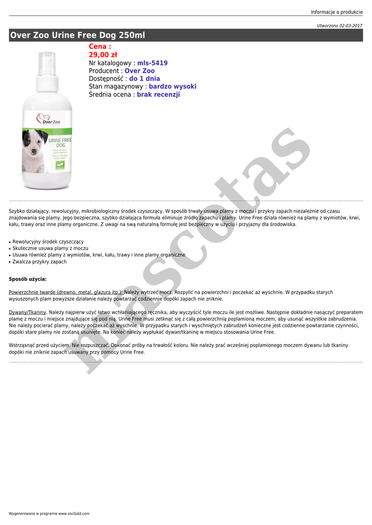 Informacje o produkcie Utworzono 02-03-2017 Over Zoo Urine Free Dog 250ml Cena : 29,00 zł co ta s Nr katalogowy : mls-5419 Producent : Over Zoo Dostępność : do 1 dnia Stan magazynowy : bardzo wysoki Średnia ocena : brak recenzji Szybko działający, rewolucyjny, mikrobiologiczny środek czyszczący. W sposób trwały usuwa plamy z moczu i przykry zapach niezależnie od czasu znajdowania się plamy. Jego bezpieczna, szybko działająca formuła eliminuje źródło zapachu i plamy. Urine Free działa również na plamy z wymiotów, krwi, kału, trawy oraz inne plamy organiczne. Z uwagi na swą naturalną formułę jest bezpieczny w użyciu i przyjazny dla środowiska. ● ● ● ● Rewolucyjny środek czyszczący Skutecznie usuwa plamy z moczu Usuwa również plamy z wymiotów, krwi, kału, trawy i inne plamy organiczne Zwalcza przykry zapach m as Sposób użycia: Powierzchnie twarde (drewno, metal, glazura itp.): Należy wytrzeć mocz. Rozpylić na powierzchni i poczekać aż wyschnie. W przypadku starych wysuszonych plam powyższe działanie należy powtarzać codziennie dopóki zapach nie zniknie. Dywany/Tkaniny. Należy najpierw użyć łatwo wchłaniającego ręcznika, aby wyczyścić tyle moczu ile jest możliwe. Następnie dokładnie nasączyć preparatem plamę z moczu i miejsce znajdujące się pod nią. Urine Free musi zetknąć się z całą powierzchnią poplamioną moczem, aby usunąć wszystkie zabrudzenia. Nie należy pocierać plamy, należy poczekać aż wyschnie. W przypadku starych i wyschniętych zabrudzeń konieczne jest codzienne powtarzanie czynności, dopóki stare plamy nie zostaną usunięte. Na koniec należy wypłukać dywan/tkaninę w miejscu stosowania Urine Free. Wstrząsnąć przed użyciem. Nie rozpuszczać. Dokonać próby na trwałość koloru. Nie należy prać wcześniej poplamionego moczem dywanu lub tkaniny dopóki nie zniknie zapach usuwany przy pomocy Urine Free. Wygenerowano w programie www.oscGold.com