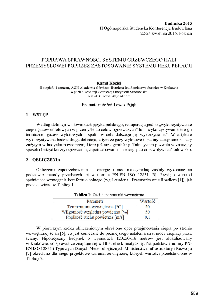 Budmika 2015 II Ogólnopolska Studencka Konferencja Budowlana 22-24 kwietnia 2Ńń5, Pozna POPRAWA SPRAWNO CI SYSTźMU żRZźWCZźżO HALI PRZźMYSŁOWźJ POPRZźZ ZASTOSOWANIź SYSTźMU RźKUPźRACJI Kamil Kozieł II stopie , ń semestr, AżH Akademia żórniczo-Hutnicza im. Stanisława Staszica w Krakowie Wydział żeodezji żórniczej i In ynierii rodowiska e-mail: [email protected] Promotor: dr in . Leszek Paj k 1 WST P Według definicji w słownikach j zyka polskiego, rekuperacja jest to „wykorzystywanie ciepła gazów odlotowych w przemy le do celów ogrzewczych” lub „wykorzystywanie energii termicznej gazów wylotowych i spalin w celu dalszego jej wykorzystania”. W artykule wykorzystywana b dzie druga definicja, z tym e gazy wylotowe i spaliny zast pione zostały zu ytym w budynku powietrzem, które ju raz ogrzali my. Taki system pozwala w znacz cy sposób obni yć koszty ogrzewania, zapotrzebowanie na energi do oraz wpływ na rodowisko. 2 OBLICZENIA Obliczenia zapotrzebowania na energi i moc maksymaln zostały wykonane na podstawie metody przedstawionej w normie PN-źN ISO ń283ń [3]. Przyj to warunki spełniaj ce wymagania komfortu cieplnego (wg Leusdena i Żreymarka oraz Roedlera [1]), jak przedstawiono w Tablicy 1. Tablica 1: Zakładane warunki wewn trzne W pierwszym kroku obliczeniowym okre lono opór przejmowania ciepła po stronie wewn trznej cian [6], co jest konieczne do pó niejszego ustalenia strat mocy cieplnej przez ciany. Hipotetyczny budynek o wymiarach ń2Ńx5Ńxń6 metrów jest zlokalizowany w Krakowie, co sprawia e znajduje si w III strefie klimatycznej. Na podstawie normy PNEN ISO 12831 i Typowych Danych Meteorologicznych Ministerstwa Infrastruktury i Rozwoju [7] okre lono dla niego projektowe warunki zewn trzne, których warto ci przedstawiono w Tablicy 2. 559 Tablica 2: Parametry powietrza zewn trznego W celu obliczenia mocy traconej przez ciany w wi kszo ci przypadków posłu ono si ogólnym wzorem przedstawionym poni ejμ Źo obliczenia współczynnika k dla cian i dachu przyj li my jednakow konstrukcj przegrody, której parametry okre lono w Tablicy 3μ Tabela 3: Konstrukcja ciany i dachu Źane materiałowe zostały zaczerpni te z katalogów producentów danych materiałów lub w razie niemo liwo ci okre lenia takowych – z normy PN-EN ISO 12524 [2]. W przypadku obliczenia strat mocy cieplnej przez stolark posłu ono si danymi dla okien warsztatowych, znajduj cymi si w normie PN-EN ISO 12831. Bardziej zło on metodologi zastosowano natomiast przy obliczaniu strat/zysków od gruntu. Ona tak e pochodzi z wy ej wspomnianej normy, jednak poza temperatur zewn trzn i wewn trzn uwzgl dnia ona tak e gł boko ć zalegania wód gruntowych pod budynkiem, redni roczn temperatur i współczynnik poprawkowy. Po obliczeniu całkowitego współczynnika przenikania ciepła wymagane jest okre lenie zast pczego współczynnika przenikania ze stosownych tabel znajduj cych si w normie PN-EN ISO 12831. Obliczenia zostały wykonane dla podpiwniczenia budynku w 25% i dla konstrukcji powierzchni stykaj cych si z gruntem scharakteryzowanych w Tablicy 4μ Tablica 4: Konstrukcja cian podpiwniczenia i podłóg 560 Straty ciepła przez wentylacj obliczono na podstawie wzoruμ W przypadku warsztatów mechanicznych minimalna krotno ć wymiany powietrza ze wzgl dów higienicznych ηmin to Ń,5 kubatury budynku na godzin (na podstawie normy PNEN ISO 12831). Krotno ć wymiany powietrza dotycz c całego budynku n50 przyj to na podstawie normy PN-źN ISO ń283ń dla budynków o redniej szczelno ci obudowy równej 3, co jest zbie ne z warto ci n50 podan w ksi ce „Wentylacja i klimatyzacja” A. Pełecha [4] podan dla warsztatów mechanicznych. Współczynnik osłoni cia e przyj to wg normy PN-źN ISO ń283ń dla budynków o rednim osłoni ciu i o przestrzeni ogrzewanej z jednym osłoni tym otworem, czyli Ń,Ń2. Współczynnik poprawkowy ze wzgl du na wysoko ć przyj to na podstawie normy PNźN ISO ń283ń dla budynków o wysoko ci z przedziału ńŃ-3Ń metrów, czyli ε = ń,2. Obliczony strumie powietrza infiltruj cego do budynku przez nieszczelno ci okazał si być zbyt małym, wzgl dem wymaga higienicznych, wobec czego konieczne było obliczenie ilo ci powietrza, która b dzie musiała zostać dostarczona systemem wentylacji mechanicznej. Przebieg procesu ogrzewania powietrza bez rekuperatora przedstawia Rys. 1, natomiast przebieg procesu ogrzewania z zastosowaniem rekuperatora jest przedstawiony na Rys. 2. Rysunek 1: Przebieg procesu ogrzewania przy braku rekuperacji 561 Rysunek 2: Przebieg procesu ogrzewania z rekuperacj Ostatnim etapem oblicze było okre lenie zysków ciepła od technologii i ludzi pracuj cych w budynku. Poniewa analizowany był okres grzewczy, pomini to zyski ciepła od sło ca, gdy przez wi kszo ć czasu albo nie wyst puj albo s znikome. Zyski od technologii zostały przyj te jako 5Ń W od ka dego metra kwadratowego powierzchni, natomiast zyski od ludzi pracuj cych w zakładzie przyj to jako ń3Ń W na osob (praca rednioci ka w temp. 2ѰC [2]). Wyniki oblicze przedstawiono w Tablicy 5μ Tablica 5: Zyski i straty mocy cieplnej w budynku Jak widać, zastosowanie rekuperacji w budynku o tych rozmiarach pozwala na ograniczenie mocy maksymalnej urz dze potrzebnych do ogrzewania budynku o ponad ńŃŃ kW (dokładnie ń2,6% mniej). Roczne zapotrzebowanie na energi i no niki energii obliczono przez obliczenie redniej temperatury zewn trznej w sezonie grzewczym. Nast pnie na podstawie Typowych Lat Meteorologicznych Ministerstwa Infrastruktury i Rozwoju dobrano pozostałe parametry zewn trzne – wilgotno ć powietrza oraz pr dko ć wiatru. Okre lone w ten sposób chwilowe straty ciepła pomno ono przez czas trwania sezonu grzewczego aby otrzymać interesuj c nas warto ć ilo ci energii cieplnej. Zało ono, e sezon grzewczy trwa od 25 wrze nia do 5 maja, tj. 5352 godziny. 562 Przy zało eniu, e kocioł w glowy stosowany do ogrzewania budynku b dzie miał sprawno ć 