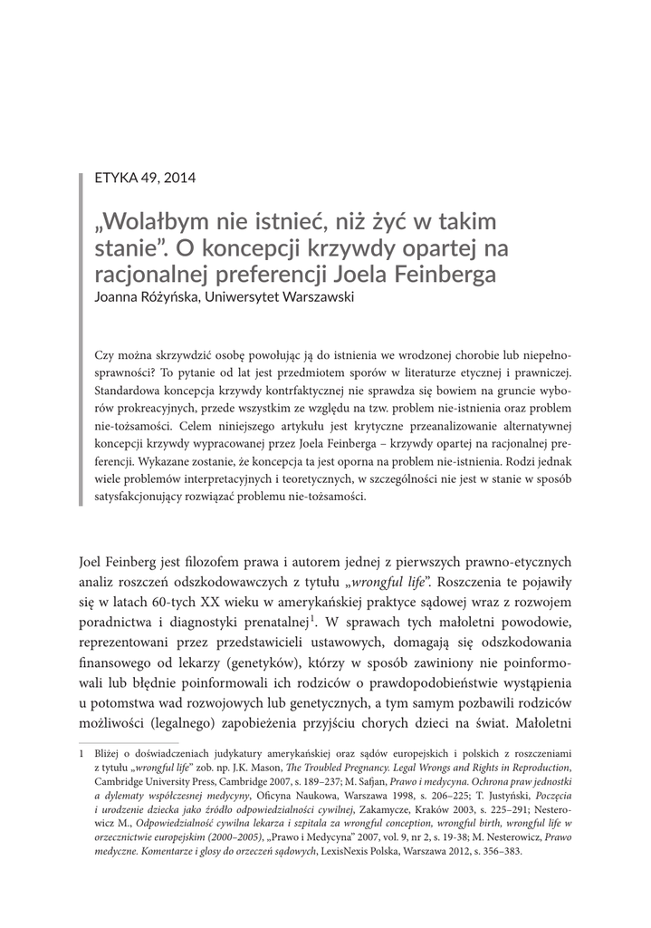 ETYKA 49, 2014 „Wolałbym nie istnieć, niż żyć w takim stanie”. O koncepcji krzywdy opartej na racjonalnej preferencji Joela Feinberga Joanna Różyńska, Uniwersytet Warszawski Czy można skrzywdzić osobę powołując ją do istnienia we wrodzonej chorobie lub niepełnosprawności? To pytanie od lat jest przedmiotem sporów w literaturze etycznej i prawniczej. Standardowa koncepcja krzywdy kontrfaktycznej nie sprawdza się bowiem na gruncie wyborów prokreacyjnych, przede wszystkim ze względu na tzw. problem nie-istnienia oraz problem nie-tożsamości. Celem niniejszego artykułu jest krytyczne przeanalizowanie alternatywnej koncepcji krzywdy wypracowanej przez Joela Feinberga – krzywdy opartej na racjonalnej preferencji. Wykazane zostanie, że koncepcja ta jest oporna na problem nie-istnienia. Rodzi jednak wiele problemów interpretacyjnych i teoretycznych, w szczególności nie jest w stanie w sposób satysfakcjonujący rozwiązać problemu nie-tożsamości. Joel Feinberg jest filozofem prawa i autorem jednej z pierwszych prawno-etycznych analiz roszczeń odszkodowawczych z tytułu „wrongful life”. Roszczenia te pojawiły się w latach 60-tych XX wieku w amerykańskiej praktyce sądowej wraz z rozwojem poradnictwa i diagnostyki prenatalnej 1. W sprawach tych małoletni powodowie, reprezentowani przez przedstawicieli ustawowych, domagają się odszkodowania finansowego od lekarzy (genetyków), którzy w sposób zawiniony nie poinformowali lub błędnie poinformowali ich rodziców o prawdopodobieństwie wystąpienia u potomstwa wad rozwojowych lub genetycznych, a tym samym pozbawili rodziców możliwości (legalnego) zapobieżenia przyjściu chorych dzieci na świat. Małoletni 1 Bliżej o doświadczeniach judykatury amerykańskiej oraz sądów europejskich i polskich z roszczeniami z tytułu „wrongful life” zob. np. J.K. Mason, The Troubled Pregnancy. Legal Wrongs and Rights in Reproduction, Cambridge University Press, Cambridge 2007, s. 189–237; M. Safjan, Prawo i medycyna. Ochrona praw jednostki a dylematy współczesnej medycyny, Oficyna Naukowa, Warszawa 1998, s. 206–225; T. Justyński, Poczęcia i urodzenie dziecka jako źródło odpowiedzialności cywilnej, Zakamycze, Kraków 2003, s. 225–291; Nesterowicz M., Odpowiedzialność cywilna lekarza i szpitala za wrongful conception, wrongful birth, wrongful life w orzecznictwie europejskim (2000–2005), „Prawo i Medycyna” 2007, vol. 9, nr 2, s. 19-38; M. Nesterowicz, Prawo medyczne. Komentarze i glosy do orzeczeń sądowych, LexisNexis Polska, Warszawa 2012, s. 356–383. 60 JOANNA RÓŻYŃSKA powodowie żądają rekompensaty za krzywdę istnienia 2 - za to, że zostali powołani do życia obarczonego wrodzoną chorobą lub niepełnosprawnością, naznaczonego bólem i cierpieniem, i wiążącego się ze szczególnymi potrzebami oraz kosztami. Choć rozważania Joela Feinberga na temat podstaw i zakresu odpowiedzialności osób, których działania lub zaniechania doprowadziły do narodzin ciężko chorych lub upośledzonych dzieci, są nierozerwalnie związane z zagadnieniami prawnymi, stanowią one punkt odniesienia niemal dla wszystkich współczesnych etyków zajmujących się problemem moralnej odpowiedzialności rodziców za jakość życia przyszłego potomstwa oraz rolą zasady niekrzywdzenia na gruncie etyki prokreacyjnej. W niniejszym artykule przyjrzę się bliżej ostatniej z wymienionych kwestii, koncentrując się na pytaniu czy można wyrządzić krzywdę osobie powołując ją do życia w złej kondycji zdrowotnej. Najpierw przedstawię klasyczną koncepcję krzywdy, w ujęciu Feinberga, i omówię trudności, jakie rodzi próba jej zastosowania do wyborów prokreacyjnych. Następnie, krytycznie przeanalizuję propozycje przezwyciężenia tych problemów przedstawione przez tego autora, w szczególności sformułowaną przez niego w późniejszym okresie twórczości koncepcję krzywdy opartej na racjonalnej preferencji. 1. Klasyczna koncepcja krzywdy Aby udzielić odpowiedzi na te pytania, czy można kogoś skrzywdzić powołując go do istnienia we wrodzonej chorobie lub upośledzeniu, należy najpierw przyjrzeć się bliżej samej kategorii krzywdy, która – jak słusznie zauważa wielu autorów – jest pojęciem nieznośnie wieloznacznym 3. Według Joela Feinberga – autora jednej z najbardziej znanych i skrupulatnych analiz pojęcia krzywdy na gruncie prawa, do której odwołują się niemal wszyscy bioetycy i filozofowie moralności – krzywda oznacza „pokrzyżowanie, pogorszenie bądź zniweczenie [możliwości zaspokojenia przez jednostkę] interesu (thwarting, setting back, or defeating of an interest)” 4. Mówiąc inaczej, krzywdą jest uszczerbek w dobrach, w których ktoś ma interes. Uszczerbek ten może polegać na zniszczeniu lub pogorszeniu stanu tych dóbr 2 W celu zachowania przejrzystości wywodu i spójności terminologicznej, w pracy posługiwać się będę przede wszystkim terminem “krzywda” (harm), choć na gruncie prawa (w szczególności, prawa polskiego) pojęciem nadrzędnym zakresowo jest termin „szkoda”. Tylko we fragmentach referujących zmagania sądów z powództwami odszkodowawczymi z tytułu „wrongful life” będę używać wyrażenia „szkoda”. 3 Zob. np. B. Bradley, Analyzing Harm, Rocky Mountain Ethics Congress, Colorado 2009, August 6-9, dostęp: http://www.colorado.edu/philosophy/center/rome/RoMe_2009_full_papers/Ben_Bradley_Analyzing%20 Harm.doc; T.M. Benditt, Benefit and Harm, „Philosophy and Phenomenological Research” 1976, vol. 37, nr 1, s. 116–120; M. Hanser, The Metaphysics of Harm, „Philosophy and Phenomenological Research” 2008, vol. 77, nr 2, s. 421–450. 4 J. Feinberg, Harm to Others, The Moral Limits of Criminal Law, Vol. 4, Oxford University Press, Oxford 1987, s. 33. Ponieważ słowo „interes” jest bardzo trudno przekładalne na język polski, omawiając dalej Feinbergowskie ujęcie krzywdy, posłu