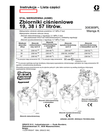 Nie wolno zmieniaæ lub modyfikowaæ urz¹dzenia. U¿ywaæ wy³¹cznie oryginalnych czêĹci zamiennych Graco.
