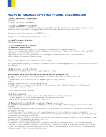 MAGNE B6 – CHARAKTERYSTYKA PRODUKTU LECZNICZEGO 1. NAZWA PRODUKTU LECZNICZEGO MAGNE B6 48 mg + 5 mg, tabletki powlekane 2. SKŁAD JAKOŚCIOWY I ILOŚCIOWY 1 tabletka powlekana zawiera 48 mg jonów magnezu (1,97 mmol) w postaci magnezu mleczanu dwuwodnego (Magnesii lactas dihydricus) i 5 mg pirydoksyny chlorowodorku (Pyridoxini hydrochloridum) Substancja pomocnicza: sacharoza 330,569 mg Pełny wykaz substancji pomocniczych patrz punkt 6.1. 3. POSTAĆ FARMACEUTYCZNA Tabletki powlekane 4. SZCZEGÓŁOWE DANE KLINICZNE 4.1. Wskazania do stosowania Występowanie poniżej wymienionych objawów może wskazywać na niedobór magnezu: -nerwowość, drażliwość, wahania nastroju, łagodny lęk, niepokój, przejściowe uczucie zmęczenia, ospałość, zaburzenia snu w niewielkim nasileniu; -objawy lęku, takie jak kurcze przewodu pokarmowego lub kołatanie serca (bez zaburzeń serca); -kurcze mięśni, mrowienie, drganie powiek. Uzupełnienie magnezu może złagodzić powyższe objawy. W przypadku braku poprawy po miesiącu stosowania produktu leczniczego Magne B 6, kontynuowanie leczenia nie jest zalecane. 4.2. Dawkowanie i sposób podawania Tabletki należy połykać w całości, popijając dużą ilością wody. Do stosowania wyłącznie u dorosłych oraz dzieci w wieku 6 lat lub powyżej Dostępne są inne postaci produktu leczniczego, odpowiednie dla dzieci w wieku poniżej 6 lat. Dorośli: 6 - 8 tabletek na dobę w 2 lub 3 dawkach podzielonych podczas posiłków. Dzieci: w wieku 6 lat lub powyżej (o masie ciała ok. 20 kg): 10 do 30 mg/kg m.c. na dobę (tzn.0,4 do1,2 mmol/kg m.c.) tzn. 4 do 6 tabletek na dobę, w 2 lub 3 dawkach podzielonych, podczas posiłków. Zazwyczaj kuracja trwa 1 miesiąc. 4.3. Przeciwwskazania - Nadwrażliwość na substancje czynne lub na którąkolwiek substancję pomocniczą. - Ciężka niewydolność nerek (klirens kreatyniny mniejszy niż 30 ml/min.). - Jednoczesne stosowanie lewodopy (patrz punkt 4.5). 4.4. Specjalne ostrzeżenia i środki ostrożności dotyczące stosowania W przypadku skojarzonego niedoboru magnezu i wapnia, w pierwszej kolejności należy wyrównać niedobór magnezu. W przypadku ciężkiego niedoboru magnezu i zaburzeń wchłaniania, leczenie należy rozpocząć od dożylnego podawania magnezu. Produkt leczniczy Magne B 6 zawiera sacharozę i dlatego jest przeciwwskazany u pacjentów z rzadkimi dziedzicznymi zaburzeniami związanymi z nietolerancją fruktozy, zespołem złego wchłaniania glukozy-galaktozy lub niedoborem sacharazy-izomaltazy. Należy zachować szczególną ostrożność u pacjentów z umiarkowaną niewydolnością nerek ze względu na ryzyko wystąpienia wysokiego poziomu magnezu we krwi. Nie stosować u dzieci poniżej 6 roku życia. Długotrwałe stosowanie pirydoksyny (kilka miesięcy, a nawet lat) może spowodować aksonalną neuropatię czuciową. Objawy obejmują: drętwienie i zaburzenia poczucia pozycji, wibracje w dystalnych częściach kończyn, a także stopniowo postępującą ataksję sensoryczną (zaburzenia koordynacji). W większości przypadków objawy ustępują po zaprzestaniu stosowania pirydoksyny. 4.5. Interakcje z innymi produktami leczniczymi i inne rodzaje interakcji Produktu leczniczego Magne B 6 nie należy podawać z następującymi lekami: - lewodopa (stosowana bez inhibitora obwodowej dopadekarboksylazy), gdyż pirydoksyna osłabia jej działanie. - fosforany lub sole wapnia, Substancje te hamują wchłanianie magnezu w jelitach; - doustne tetracykliny, dawki doustnej tetracykliny i magnezu powinny być podawane w odstępie co najmniej 3 godzin, ponieważ magnez zmniejsza wchłanianie tetracyklin w przewodzie pokarmowym. 4.6. Wpływ na płodność, ciążę i laktację Ciąża Kliniczne doświadczenia i stosowanie produktu leczniczego Magne B 6 u wystarczająco dużej liczby ciężarnych kobiet nie ujawniły toksycznego i teratogennego działania magnezu. Produkt można stosować u ciężarnych kobiet tylko w przypadku zdecydowanej konieczności. Karmienie piersią: Każdy ze składników, zarówno magnez jak i witamina B 6, może być stosowany w czasie karmieniem piersią. Odpowiednia dawka magnezu to 30 mg na dobę dla niemowląt w wieku od 0 do 6 miesięcy i 75 mg na dobę dla niemowląt w wieku od 7 do 12 miesięcy. Magnez, który znajduje się w mleku karmiących kobiet, waha się w szerokim zakresie (od 15 do 64 mg/l) z medianą wartości 31 mg/l i 75% średnich wartości stężeń odnotowanych poniżej 35 mg/l. Uważa się, cytując niektórych autorów, że odpowiednia dawka pirydoksyny dla niemowląt to 0,1 mg na dobę. U dobrze odżywionych kobiet otrzymujących od 2,5 do 20 mg pirydoksyny przez 3 kolejne dni wykazano, iż jej poziom w mleku był w zakresie od 123 do 314 ng/ml. Zaleca się, aby kobiety karmiące piersią stosowały pirydoksynę w dawce maksymalnie 20 mg na dobę. Przegląd dostępnych danych dotyczących stosowania magnezu i pirydoksyny w dawkach terapeutycznych u kobiet karmiących nie wykazał żadnych powodów do obaw dotyczących bezpieczeństwa. Dodatkowa ilość magnezu obecna w mleku matki leczonej zwykle stosowanymi dawkami magnezu i pirydoksyny nie jest znacząca. Płodność Badania nad witaminą B 6 wykazują tylko obwodową neurotoksyczność i wpływ na płodność mężczyzn. Jednakże taki efekt obserwuje się tylko przy bardzo wysokich dawkach. Bezpieczeństwo Magne B 6 jest bardzo wysokie ze względu na niską zawartość witaminy B 6. 4.7. Wpływ na zdolność prowadzenia pojazdów i obsługiwania maszyn Produkt leczniczy Magne B 6 nie ma wpływu na zdolność prowadzenia pojazdów i obsługiwania maszyn. 4.8. Działania niepożądane Działania niepożądane występują rzadko. Czasami może wystąpić biegunka i bóle brzucha lub zaczerwienienie skóry. Bardzo rzadko obserwowano reakcje alergiczne. 4.9. Przedawkowanie Przedawkowanie magnezu stosowanego doustnie nie powoduje reakcji toksycznych u pacjentów z prawidłową czynnością nerek. U p