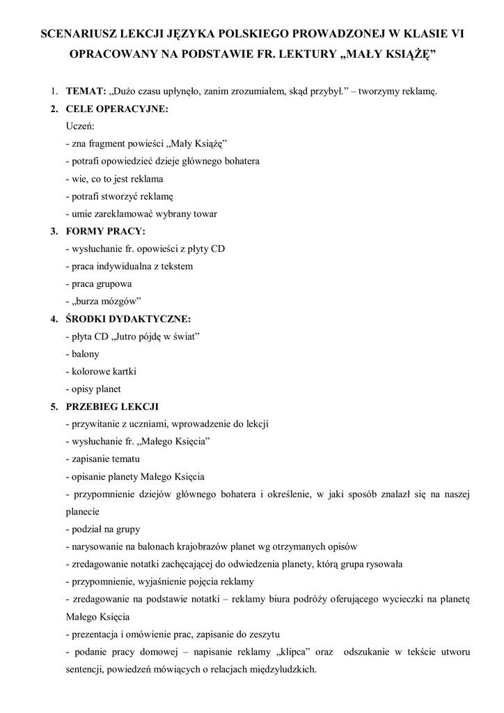 SCENARIUSZ LEKCJI JĘZYKA POLSKIEGO PROWADZONEJ W KLASIE VI OPRACOWANY NA PODSTAWIE FR. LEKTURY „MAŁY KSIĄŻĘ” 1. TEMAT: „Dużo czasu upłynęło, zanim zrozumiałem, skąd przybył.” – tworzymy reklamę. 2. CELE OPERACYJNE: Uczeń: - zna fragment powieści „Mały Książę” - potrafi opowiedzieć dzieje głównego bohatera - wie, co to jest reklama - potrafi stworzyć reklamę - umie zareklamować wybrany towar 3. FORMY PRACY: - wysłuchanie fr. opowieści z płyty CD - praca indywidualna z tekstem - praca grupowa - „burza mózgów” 4. ŚRODKI DYDAKTYCZNE: - płyta CD „Jutro pójdę w świat” - balony - kolorowe kartki - opisy planet 5. PRZEBIEG LEKCJI - przywitanie z uczniami, wprowadzenie do lekcji - wysłuchanie fr. „Małego Księcia” - zapisanie tematu - opisanie planety Małego Księcia - przypomnienie dziejów głównego bohatera i określenie, w jaki sposób znalazł się na naszej planecie - podział na grupy - narysowanie na balonach krajobrazów planet wg otrzymanych opisów - zredagowanie notatki zachęcającej do odwiedzenia planety, którą grupa rysowała - przypomnienie, wyjaśnienie pojęcia reklamy - zredagowanie na podstawie notatki – reklamy biura podróży oferującego wycieczki na planetę Małego Księcia - prezentacja i omówienie prac, zapisanie do zeszytu - podanie pracy domowej – napisanie reklamy „klipca” oraz sentencji, powiedzeń mówiących o relacjach międzyludzkich. odszukanie w tekście utworu SCENARIUSZ LEKCJI JĘZYKA POLSKIEGO PROWADZONEJ W KLASIE VI OPRACOWANY NA PODSTAWIE FR. „MAŁEGO KSIĘCIA” 1. TEMAT: „Jeśli chcesz mieć przyjaciela, oswój mnie” - jak znaleźć prawdziwą przyjaźń? 2. CELE OPERACYJNE: Uczeń: - umie rozmawiać o uczuciach - umie wyjaśnić na podstawie tekstu, czym jest przyjaźń - potrafi określić, jak zyskuje się przyjaciela - wie, jakich zasad przestrzegać w relacjach międzyludzkich 2. FORMY PRACY - praca indywidualna z tekstem - praca w parach - praca zbiorowa 3. ŚRODKI DYDAKTYCZNE: - fr. tekstu „Małego Księcia” - kolorowy papier, pisaki - obrazki z różami 4. PRZEBIEG LEKCJI - przywitanie z uczniami, przypomnienie poprzednich zajęć - zapisanie tematu lekcji – wyjaśnienie - odszukanie i wyjaśnienie wszystkich aforyzmów dotyczących przyjaźni - zrobienie wydzieranki dla przyjaciela i zapisanie na niej sentencji - utworzenie i zapisanie „wskazówek dla poszukujących przyjaźni” - omówienie rysunków róż - podanie pracy domowej – notatka: „Czego od nas mógłby się nauczyć Mały Książę?” SCENARIUSZ LEKCJI JĘZYKA POLSKIEGO PROWADZONEJ W KLASIE VI OPRACOWANY NA PODSTAWIE FR. LEKTURY „MAŁY KSIĄŻĘ” 1. TEMAT: „O świcie obudził mnie czyjś cichy głosik” - opis postaci 2. CELE OPERACYJNE: Uczeń: - potrafi wymienić głównych bohaterów opowieści - potrafi określić, czym różni się opowiadanie od opisu - umie podać cechy charakterystyczne opisu - umie zredagować opis postaci 3. FORMY PRACY - praca indywidualna - praca grupowa - mapa mentalna 4. ŚRODKI DYDAKTYCZNE: - szary papier, pisaki - fr. tekstu „Małego Księcia” 5. PRZEBIEG LEKCJI - przywitanie z uczniami, przypomnienie poprzednich zajęć - praca w grupach - sporządzenie mapy mentalnej wokół rysunku przedstawionego na plakacie - przypomnienie definicji opisu i opowiadania - znalezienie we fr. tekstu elementów potrzebnych do opisu - zredagowanie i zapisanie opisu postaci Małego Księcia - praca domowa – zredagowanie na podstawie ilustracji i tekstu opisu baranka