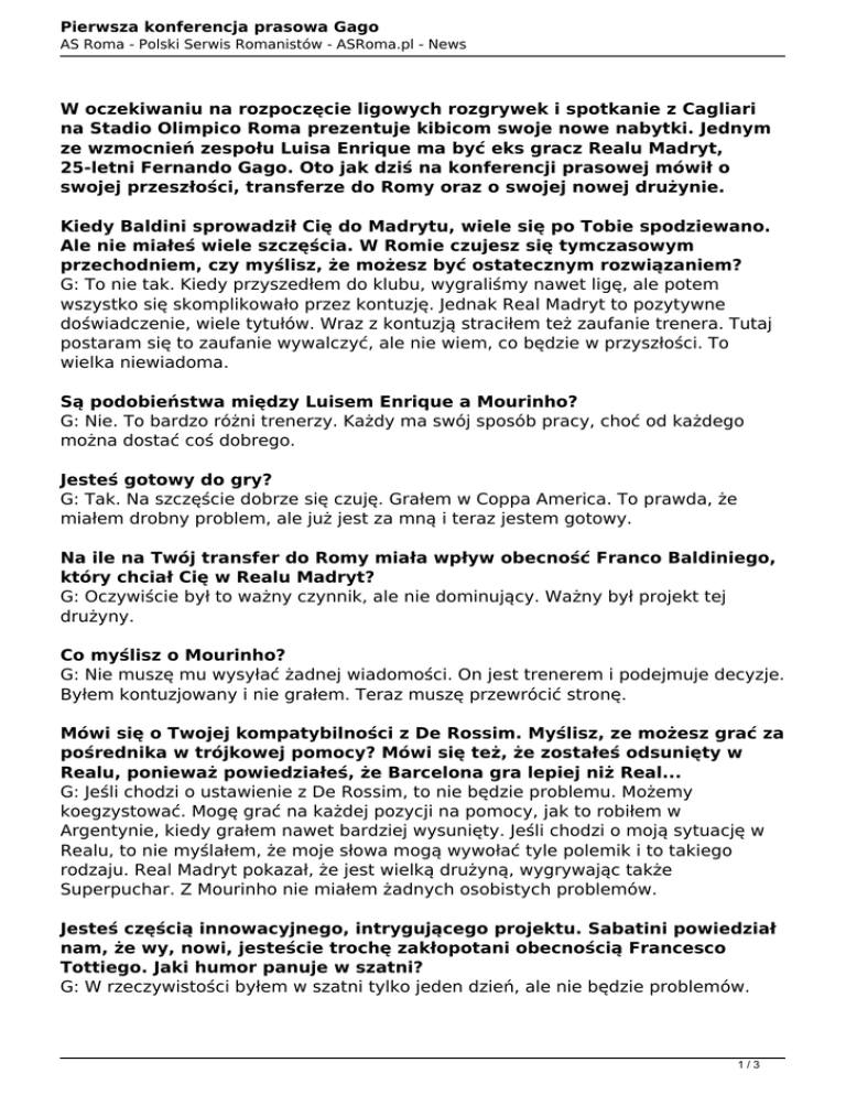 Pierwsza konferencja prasowa Gago AS Roma - Polski Serwis Romanistów - ASRoma.pl - News W oczekiwaniu na rozpoczęcie ligowych rozgrywek i spotkanie z Cagliari na Stadio Olimpico Roma prezentuje kibicom swoje nowe nabytki. Jednym ze wzmocnień zespołu Luisa Enrique ma być eks gracz Realu Madryt, 25-letni Fernando Gago. Oto jak dziś na konferencji prasowej mówił o swojej przeszłości, transferze do Romy oraz o swojej nowej drużynie. Kiedy Baldini sprowadził Cię do Madrytu, wiele się po Tobie spodziewano. Ale nie miałeś wiele szczęścia. W Romie czujesz się tymczasowym przechodniem, czy myślisz, że możesz być ostatecznym rozwiązaniem? G: To nie tak. Kiedy przyszedłem do klubu, wygraliśmy nawet ligę, ale potem wszystko się skomplikowało przez kontuzję. Jednak Real Madryt to pozytywne doświadczenie, wiele tytułów. Wraz z kontuzją straciłem też zaufanie trenera. Tutaj postaram się to zaufanie wywalczyć, ale nie wiem, co będzie w przyszłości. To wielka niewiadoma. Są podobieństwa między Luisem Enrique a Mourinho? G: Nie. To bardzo różni trenerzy. Każdy ma swój sposób pracy, choć od każdego można dostać coś dobrego. Jesteś gotowy do gry? G: Tak. Na szczęście dobrze się czuję. Grałem w Coppa America. To prawda, że miałem drobny problem, ale już jest za mną i teraz jestem gotowy. Na ile na Twój transfer do Romy miała wpływ obecność Franco Baldiniego, który chciał Cię w Realu Madryt? G: Oczywiście był to ważny czynnik, ale nie dominujący. Ważny był projekt tej drużyny. Co myślisz o Mourinho? G: Nie muszę mu wysyłać żadnej wiadomości. On jest trenerem i podejmuje decyzje. Byłem kontuzjowany i nie grałem. Teraz muszę przewrócić stronę. Mówi się o Twojej kompatybilności z De Rossim. Myślisz, ze możesz grać za pośrednika w trójkowej pomocy? Mówi się też, że zostałeś odsunięty w Realu, ponieważ powiedziałeś, że Barcelona gra lepiej niż Real... G: Jeśli chodzi o ustawienie z De Rossim, to nie będzie problemu. Możemy koegzystować. Mogę grać na każdej pozycji na pomocy, jak to robiłem w Argentynie, kiedy grałem nawet bardziej wysunięty. Jeśli chodzi o moją sytuację w Realu, to nie myślałem, że moje słowa mogą wywołać tyle polemik i to takiego rodzaju. Real Madryt pokazał, że jest wielką drużyną, wygrywając także Superpuchar. Z Mourinho nie miałem żadnych osobistych problemów. Jesteś częścią innowacyjnego, intrygującego projektu. Sabatini powiedział nam, że wy, nowi, jesteście trochę zakłopotani obecnością Francesco Tottiego. Jaki humor panuje w szatni? G: W rzeczywistości byłem w szatni tylko jeden dzień, ale nie będzie problemów. 1/3 Pierwsza konferencja prasowa Gago AS Roma - Polski Serwis Romanistów - ASRoma.pl - News Ważne jest to, że chcemy wygrywać wszystkie mecze. Sam fakt, że tak wiele się mówi w ostatnich dniach o Tottim, świadczy o tym, ze młodzi muszą brać z niego przykład. Sądząc po kadrze Romy, jak daleko może zajść ta drużyna i jakie cele może osiągnąć? G: Mówienie dziś o celach może być przedwczesne. Na poziomie klubu i projektu Roma musi mierzyć w najwyższe cele. Piłkarze chcą podarować kibicom największe sukcesy. Co znaczy mieć Tottiego na boisku? G: Myślę, że bardzo wpływa zarówno na to, co się dzieje na boisku, jak i poza nim. Jest ważny z uwagi na to, co wygrał i co sobą reprezentuje. Z uwagi na swoją charyzmę. Zawsze lepiej mieć go we własnej drużynie niż poza nią. Totti to prawdziwy wzór. Twoja wada i zaleta? Jak opiszesz Erika Lamelę? G: Trudno wskazać jedną wadę i jedną zaletę. W każdym razie staram się pracować i poprawiać każdego dnia. Zaangażowanie musi być maksymalne. Myślę, że wszyscy trochę mnie znają, jako ze grałem przez 5 lat w Realu. Lamela ma jasne pomysły i dobrze jest, że jest taki chętny do gry w klubie takim, jak Roma. Z jakiego powodu przez te lata w Boca i Realu strzelałeś mało bramek? G: To zależy od mojej pozycji na boisku. W Boca i Realu grałem bardzo cofnięty. Ale na pewno jest to coś, co należy poprawić. Dlaczego zdecydowałeś się przenieść do Romy, chociaż odpadła z Ligi Europejskiej? Luis Enrique? G: Nie myślę, żeby to był błąd czy ryzyko. To nowy projekt. Szkoda, że Roma została wyeliminowana z puchary, ale są inne ważne cele. Jeśli chodzi o Luisa Enrique, to zaletą jest to, że mówi po hiszpańsku jak ja. Z mojego punktu widzenia, jest on bardzo mądrym człowiekiem, który dobrze wie, czego chce. Masz 25 lat. Na ile to motywujące, że jest się częścią projektu z tak wieloma młodymi ludźmi? G: To niezmiernie interesujący projekt. Zbudowano znaczącą drużynę. To prawda, że mam 25 lat i dziwne jest, że zagrałem tak wiele meczów w Realu i kadrze. Chcę być dodatkową opcją dla trenera. Jaką radę możesz dać młodym w Romie, żeby umocnili swoją pozycję? G: Zaczynałem bardzo młodo, wygrałem wiele tytułów w Boca Juniors. Kolejnym etapem był Real Madryt. W wieku 20 lat po raz pierwszy trafiłem do reprezentacji. Sekret polega na tym, żeby zawsze być skromnym i nie zapominać o ważnych celach. Nie można pozwolić sobie na uderzenie wody sodowej po zagraniu dobrze jednego meczu w Serie A czy Lidze Mistrzów. 2/3 Pierwsza konferencja prasowa Gago AS Roma - Polski Serwis Romanistów - ASRoma.pl - News Jak przebiegały negocjacje z Romą? To prawda, że zainteresowane było też Palermo? G: Nie wiedziałem o zainteresowaniu Palermo. Dałem słowo Romie, a dla mnie słowo jest cenniejsze od pieniędzy. Jaką opinię wyrobiłeś sobie o lidze włoskiej i o tym, jak może zagrać ta drużyna? Jakiś projekt taktyczny? G: Myślę, że Serie A to dalej jedna z najmocniejszych lig na świecie uwagi na swoją renomę oraz na graczy, którzy tu grają. Przyjechałem zagrać przeciw Romie z Realem Madryt i uderzył mnie stadion. Ta gorąca atmosfera przypomina Argentynę. W drużynie panuje zdro