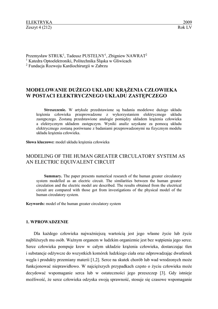 ELEKTRYKA Zeszyt 4 (212) 2009 Rok LV Przemysław STRUK1, Tadeusz PUSTELNY1, Zbigniew NAWRAT2 1 Katedra Optoelektroniki, Politechnika Śląska w Gliwicach 2 Fundacja Rozwoju Kardiochirurgii w Zabrzu MODELOWANIE DUŻEGO UKŁADU KRĄŻENIA CZŁOWIEKA W POSTACI ELEKTRYCZNEGO UKŁADU ZASTĘPCZEGO Streszczenie. W artykule przedstawione są badania modelowe dużego układu krążenia człowieka przeprowadzone z wykorzystaniem elektrycznego układu zastępczego. Zostaną przedstawione analogie pomiędzy układem krążenia człowieka a elektrycznym układem zastępczym. Wyniki analiz uzyskane za pomocą układu elektrycznego zostaną porównane z badaniami przeprowadzonymi na fizycznym modelu układu krążenia człowieka. Słowa kluczowe: model układu krążenia człowieka MODELING OF THE HUMAN GREATER CIRCULATORY SYSTEM AS AN ELECTRIC EQUIVALENT CIRCUIT Summary. The paper presents numerical research of the human greater circulatory system modelled as an electric circuit. The similarities between the human greater circulation and the electric model are described. The results obtained from the electrical circuit are compared with those got from investigations of the physical model of the human circulatory system. Keywords: model of the human greater circulatory system 1. WPROWADZENIE Dla każdego człowieka najważniejszą wartością jest jego własne życie lub życie najbliższych mu osób. Ważnym organem w ludzkim organizmie jest bez wątpienia jego serce. Serce człowieka pompuje krew w całym układzie krążenia człowieka, dostarczając tlen i substancje odżywcze do wszystkich komórek ludzkiego ciała oraz odprowadzając dwutlenek węgla i produkty przemiany materii [1,2]. Serce na skutek chorób lub wad wrodzonych może funkcjonować nieprawidłowo. W najcięższych przypadkach często o życiu człowieka może decydować wspomaganie serca lub w ostateczności jego przeszczep [3]. Gdy istnieje możliwość, że serce człowieka odzyska swoją sprawność, stosuje się czasowe wspomaganie 86 P. Struk, T. Pustelny, Z. Nawrat z wykorzystaniem komory wspomagania serca. W Polsce stosuje się komory wspomagania serca typu POLVAD, opracowane w Fundacji Rozwoju Kardiochirurgii w Zabrzu. Gdy serce jest uszkodzone w sposób nieodwracalny, stosuje się protezę sztucznego serca typu POLTAH do czasu znalezienia dawcy serca naturalnego [4]. Ważnym zagadnieniem w badaniach dużego układu krążenia jest możliwość symulacji i analizy jego pracy oraz zachowania się serca i układu krążenia w zmiennych warunkach - fizjologicznie prawidłowych oraz fizjologicznie patologicznych. W pracy przedstawiono model dużego układu krążenia człowieka w postaci elektrycznego układu zastępczego. Przedstawiono także analogie pomiędzy układem krążenia a jego elektrycznym układem zastępczym. W części eksperymentalnej przeprowadzono analizy numeryczne dla stanów fizjologicznie prawidłowych i stanów patologicznych. Otrzymane rezultaty porównano z wynikami otrzymanymi za pomocą fizycznego modelu układu krążenia człowieka z wykorzystaniem komory wspomagania serca POLVAD. 2. METODY SYMULACJI UKŁADU KRĄŻENIA CZŁOWIEKA Zadaniem elektrycznego układu zastępczego jest w jak największym stopniu wodzorowywać impedancję hydrodynamiczną układu krążenia człowieka widzianą przez lewą komorę serca od strony aorty występującej w postaci impedancji elektrycznego układu zastępczego widzianej przez źródło prądowe od strony zacisków wejściowych - rys. 2. Zgodnie z przyjętymi założeniami, elektryczny układ zastępczy musi zapewnić odwzorowanie hemodynamicznych parametrów dużego układu krążenia, takich jak: impedancja hydrodynamiczna dużego układu krążenia, przebiegi przepływu krwi i ciśnienia w aorcie człowieka, podatności segmentów aorty i podatności systemowych, rezystancji segmentów aorty i rezystancje systemowe, inertancja segmentów aorty, struktura aorty i odgałęzień systemowych. Elektryczny model zastępczy wymaga wprowadzenia analogii pomiędzy wielkościami charakteryzującymi układ krążenia człowieka, jego hemodynamikę, impedancję hydrodynamiczną z wielkościami elektrycznymi opisującymi układ elektryczny [2, 5, 6, 7]. Ciśnieniu krwi w aorcie P=100 Pa odpowiada napięcie u=1V według analogii: (1) Pu Przepływowi krwi w aorcie Q=1m /s odpowiada przepływ prądu i=1kA według analogii: 3 Rezystancji Rh=1 MPa*s/m 3 Qi (2) w układzie krążenia człowieka odpowiada rezystancja R= w elektrycznym układzie zastępczym według analogii: Modelowanie dużego układu… 87 u P R (3) i Q Podatności Ch=15 cm3/kPa układu krążenia człowieka odpowiada pojemność C=1F w elektrycznym układzie zastępczym według analogii: Rh dP du iC (4) dt dt Inertancji przepływu krwi Lh=1*10-5 kg/m4 w układzie krążenia człowieka odpowiada indukcyjność L w elektrycznym układzie zastępczym według analogii: Q Ch di dQ uL (5) dt dt W fazie skurczu serca następuje wypchnięcie pewnej objętości krwi do aorty, co powoduje wymuszenie przepływu [7]. Odpowiedzią dużego układu krążenia jest przebieg ciśnienia P przedstawiony na rys. 4. Podobnie został zaprojektowany elektryczny układ zastępczy. Rolę serca spełnia źródło prądowe Is, które wymusza przepływ prądu is o przebiegu czasowym identycznym jak przepływ krwi Q bezpośrednio za zastawką aortalną. Odpowiedzią elektrycznego układu zastępczego dużego układu krążenia człowieka są przebiegi napięcia uodp. Schemat ideowy wymuszeń i odpowiedzi przedstawia rys. 1. P Lh Rys. 1. Schemat ideowy Fig. 1. Ideological diagram Z przedstawionych analogii wynika, że układ krążenia człowieka może być modelowany za pomocą elektrycznego układu zastępczego zbudowanego z elementów R,L,C, które odzwierciedlają jego impedancję hydrodynamiczną z zachowaniem topologii aorty człowieka i jej głównych odgałęzień systemowych. Struktura dużego układu krążenia i elektrycznego uk