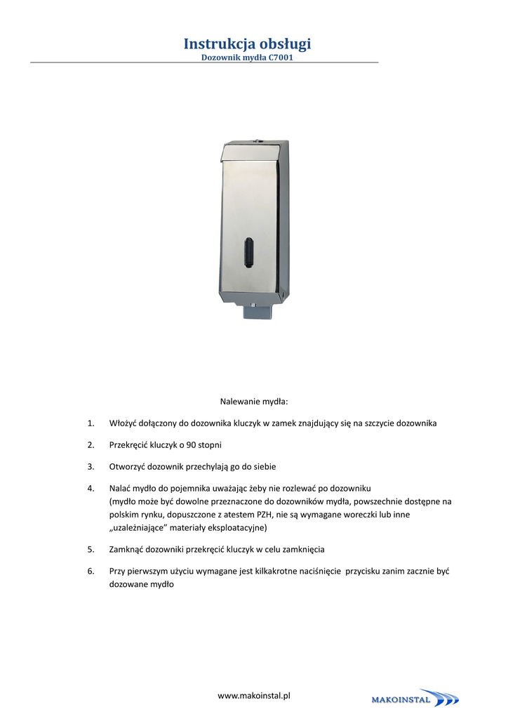 Instrukcja obsługi Dozownik mydła C7001 Nalewanie mydła: 1. Włożyć dołączony do dozownika kluczyk w zamek znajdujący się na szczycie dozownika 2. Przekręcić kluczyk o 90 stopni 3. Otworzyć dozownik przechylają go do siebie 4. Nalać mydło do pojemnika uważając żeby nie rozlewać po dozowniku (mydło może być dowolne przeznaczone do dozowników mydła, powszechnie dostępne na polskim rynku, dopuszczone z atestem PZH, nie są wymagane woreczki lub inne „uzależniające” materiały eksploatacyjne) 5. Zamknąć dozowniki przekręcić kluczyk w celu zamknięcia 6. Przy pierwszym użyciu wymagane jest kilkakrotne naciśnięcie przycisku zanim zacznie być dozowane mydło www.makoinstal.pl