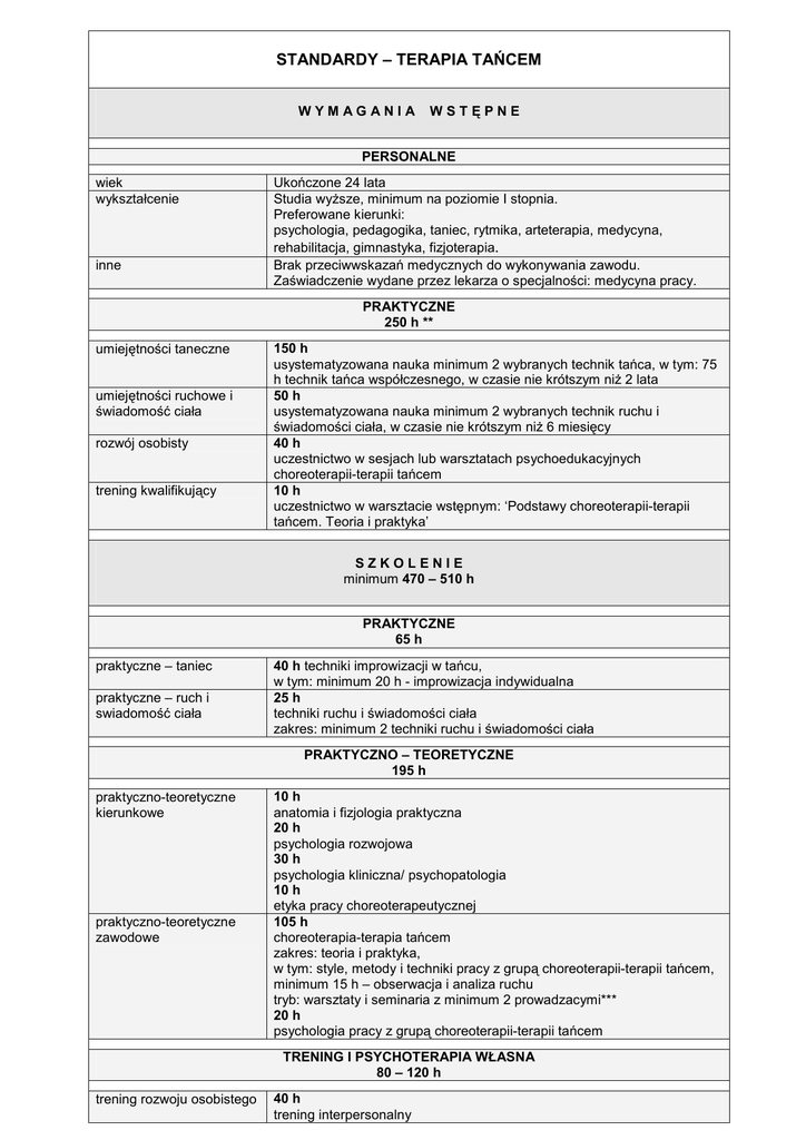 STANDARDY – TERAPIA TAŃCEM WYMAGANIA WSTĘPNE PERSONALNE wiek wykształcenie inne Ukończone 24 lata Studia wyŜsze, minimum na poziomie I stopnia. Preferowane kierunki: psychologia, pedagogika, taniec, rytmika, arteterapia, medycyna, rehabilitacja, gimnastyka, fizjoterapia. Brak przeciwwskazań medycznych do wykonywania zawodu. Zaświadczenie wydane przez lekarza o specjalności: medycyna pracy. PRAKTYCZNE 250 h ** umiejętności taneczne umiejętności ruchowe i świadomość ciała rozwój osobisty trening kwalifikujący 150 h usystematyzowana nauka minimum 2 wybranych technik tańca, w tym: 75 h technik tańca współczesnego, w czasie nie krótszym niŜ 2 lata 50 h usystematyzowana nauka minimum 2 wybranych technik ruchu i świadomości ciała, w czasie nie krótszym niŜ 6 miesięcy 40 h uczestnictwo w sesjach lub warsztatach psychoedukacyjnych choreoterapii-terapii tańcem 10 h uczestnictwo w warsztacie wstępnym: ‘Podstawy choreoterapii-terapii tańcem. Teoria i praktyka’ SZKOLENIE minimum 470 – 510 h PRAKTYCZNE 65 h praktyczne – taniec praktyczne – ruch i swiadomość ciała 40 h techniki improwizacji w tańcu, w tym: minimum 20 h - improwizacja indywidualna 25 h techniki ruchu i świadomości ciała zakres: minimum 2 techniki ruchu i świadomości ciała PRAKTYCZNO – TEORETYCZNE 195 h praktyczno-teoretyczne kierunkowe praktyczno-teoretyczne zawodowe 10 h anatomia i fizjologia praktyczna 20 h psychologia rozwojowa 30 h psychologia kliniczna/ psychopatologia 10 h etyka pracy choreoterapeutycznej 105 h choreoterapia-terapia tańcem zakres: teoria i praktyka, w tym: style, metody i techniki pracy z grupą choreoterapii-terapii tańcem, minimum 15 h – obserwacja i analiza ruchu tryb: warsztaty i seminaria z minimum 2 prowadzacymi*** 20 h psychologia pracy z grupą choreoterapii-terapii tańcem TRENING I PSYCHOTERAPIA WŁASNA 80 – 120 h trening rozwoju osobistego 40 h trening interpersonalny psychoterapia własna, grupowa lub indywidualna 80 h psychoterapia grupowa tryb: regularne sesje grupowe w czasie nie krótszym niŜ 10 miesięcy; lub 60 h pogłębiona psychoterapia grupowa tryb: regularne sesje lub warsztaty grupowe w czasie nie krótszym niŜ 10 miesięcy; lub 40 h psychoterapia indywidualna tryb: regularne indywidualne sesje w czasie nie krótszym niŜ 10 miesięcy PRACA Z GRUPĄ TERAPEUTYCZNĄ 130 h praca z grupą terapeutyczną – staŜ asystencki praca z grupą terapeutyczną – pod superwizją ‘na Ŝywo’ praca z grupą terapeutyczną – praktyka pod superwizją 20 h metodyczny staŜ asystencki*** zakres: udział w prowadzeniu grupowej choreoterapii-terapii tańcem tryb: regularne sesje lub warsztaty 20 h praca pod superwizją ‘na Ŝywo’**** zakres: prowadzenie sesji lub warsztatów grupowej choreoterapii-terapii tańcem, w obecności superwizora tryb: maksimum 2h/ sesja w odstępach: minimum 1 tydzień między sesjami; maksimum 5 h/ warsztat w odstępach: minimum 2 miesiące między warsztatami 80 h praktyka pod superwizją zakres: samodzielne prowadzenie grupowej choreoterapii-terapii tańcem pod superwizją tryb: regularne sesje lub warsztaty grupowe w czasie nie krótszym niŜ 10 miesięcy 10 h konsultacje superwizyjne**** w trakcie praktyki samodzielnego prowadzenia grupowej choreoterapii-terapii tańcem tryb: minimum 1 h/ miesiąc WYMAGANIA KOŃCOWE minimum 40 h szkolenia, warsztaty, treningi, kursy 40 h podnoszenie kwalifikacji zawodowych po uzyskaniu Certyfikatu zawodu zakres: udział w szkoleniach, warsztatach, treningach, kursach, w kierunku zgodnym ze standardami zawodu Choreoterapeuta-Terapeuta Tańcem - TT tryb: minimum 40 h/ 2 lata Certyfikowany Choreoterapeuta-Terapeuta Tańcem alias Terapeuta Tańcem – TT, powinien*: 1. Rozumieć terapeutyczne wartości tańca i posiadać umiejętność zastosowania ich w pracy z róŜnymi grupami klientów. 2. Posiadać umiejętność samodzielnej pracy z grupą terapeutyczną. 3. Posiadać umiejętność reagowania w sytuacjach trudnych w kontekście sytuacji terapeutycznej. 4. Posiadać umiejętność prowadzenia dokumentacji przebiegu procesu terapeutycznego oraz prezentowania i omawiania go z zespołem terapeutycznym. 5. Posiadać umiejętność współpracy z zespołem terapeutycznym, w procesie zintegrowanej terapii dla bezpieczeństwa klienta. 6. Postępować zgodnie z kodeksem etycznym i zawodowym Polskiego Stowarzyszenia ChoreoterapiiPTT, ustanowionym dla dziedziny Choreoterapii w Polsce. * * posługiwanie się tytułem Choreoterapeuta-Terapeuta Tańcem alias Terapeuta Tańcem - TT, zastrzeŜone jest dla osób, które ukończyły szkolenie zgodne z p/w standardami i uzyskały Certyfikat zawodu.. ** godziny akademickie (1 h akademicka = 45 minut) *** certyfikowany TT **** certyfikowany Superwizor TT lub PT Członkowie Polskiego Stowarzyszenia Choreoterapii-PTT, którzy w trybie 'otwartym' uzyskali kwalifikacje zgodne ze standardami TT, mają prawo do ubiegania się o nadanie Certyfikatu zawodu: Choreoterapeuta-Terapeuta Tańcem – TT