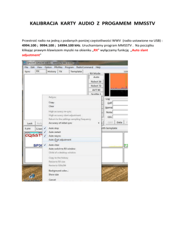 KALIBRACJA KARTY AUDIO Z PROGAMEM MMSSTV Przestroić radio na jedną z podanych poniżej częstotliwości WWV (radio ustawione na USB) : 4994.100 ; 9994.100 ; 14994.100 kHz. Uruchamiamy program MMSSTV . Na początku klikając prawym klawiszem myszki na okienku „RX” wyłączamy funkcję „Auto slant adjustment” W menu głównym programu wybieramy : Setup MMSSTV Teraz w następnym oknie dialogowym przechodzimy do zakładki TX Wybieramy kartę dźwiękową, której używać chcemy dla pracy emisjami cyfrowymi. W naszym przypadku jest to karta dźwiękowa „USB Audio CODEC” z interfejsu „musb2232fka” (nazwa karty może być troszkę inna dla róznych systemów Windows !!!) . Po wybraniu karty i ustawieniu częstotliwości próbkowania z listy programu naciskamy przycisk „Adj”. Poniższe obrazki pokazują opisane powyżej czynności. Po wyświetleniu się powyższego ekranu, przy nadającej sygnał stacji WWV na ekranie pojawiają się czarne pasy na szarym tle. Kalibracji dokonujemy za pomocą klawisza lewego myszki po odczekaniu chwili pozwalającej na wypełnienie całego pola liniami pionowymi. W celu ułatwienia ustawień można za pomocą kliknięcia prawego klawisza myszki „ustawić” zielona linie pomocnicza przy „dolnej” części powstającej linii co pozwala później łatwiej wskazać „poprawkę”. Ilustrują ten proces poniższe obrazki: Jak widać wyżej aby uzyskać „poprawkę-korektę” dla zegara karty audio klikamy lewym klawiszem na dole (brzeg linii) i po pojawieniu się żółtej linii pomocniczej klikamy na krawędzi linii u góry ekranu. Pojawia się okienko z komunikatem informującym o wielkości poprawki. Po drugim naciśnięciu lewego klawisza myszki poprawka zostaje wprowadzona automatycznie do programu (zmieniona częstotliwość próbkowania karty). Podana tu poprawka w „Hz i p.p.m” może być użyta w innych programach. Na przykład w MixW wpisana do pola korekcji „RX”. Mamy zrobioną korektę karty audio dla części odbiorczej. Aby zrobić to samo dla nadawania postępujemy następująco. Wyłączamy odbiornik i przechodzimy w oknie ustawień do zakładki „TX”. Pokazuje to poniższy obrazek. We fragmencie okna dialogowego „Loop back” (pętla sprzężenia zwrotnego) Zaznaczamy opcję „Internal” co spowoduje powstanie „programowej” pętli sprzężenia zwrotnego pomiędzy wejściem i wyjściem naszej karty dźwiękowej (tutaj USB Audio CODEC). Po zaznaczeniu tych opcji przechodzimy do okna głównego programu. Wybieramy przycisk „Tx” i program zaczyna nadawać obrazek z planszy w zamkniętej pętli sprzężenia zwrotnego. Przechodzimy do zakładki „Sync”, gdzie możemy ocenić pracę naszej karty audio przy nadawaniu i w razie potrzeby wyznaczyć stosowne poprawki w częstotliwości próbkowania. W naszym przypadku widać, że linia synchronizacji jest pionowa więc nie trzeba ustawiać poprawki dla zegara przy nadawaniu. Jeżeli oceniamy, ze poprawka jest konieczna to postępujemy analogicznie jak w przypadku części odbiorczej i klikamy lewym przyciskiem myszki na dole brzegu linii i drugi raz na końcu. Jak widać otrzymaliśmy tutaj poprawkę +4p.pm dla naszej karty. Ta wartość można użyć w innych programach. UWAGA Przy wpisywaniu poprawki należy „bezwzględnie” uwzględnić wartość liczbową i znak poprawki !!!!