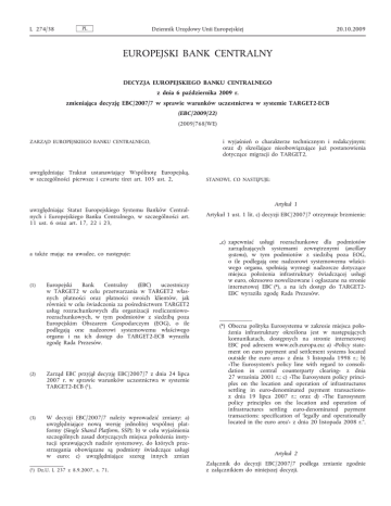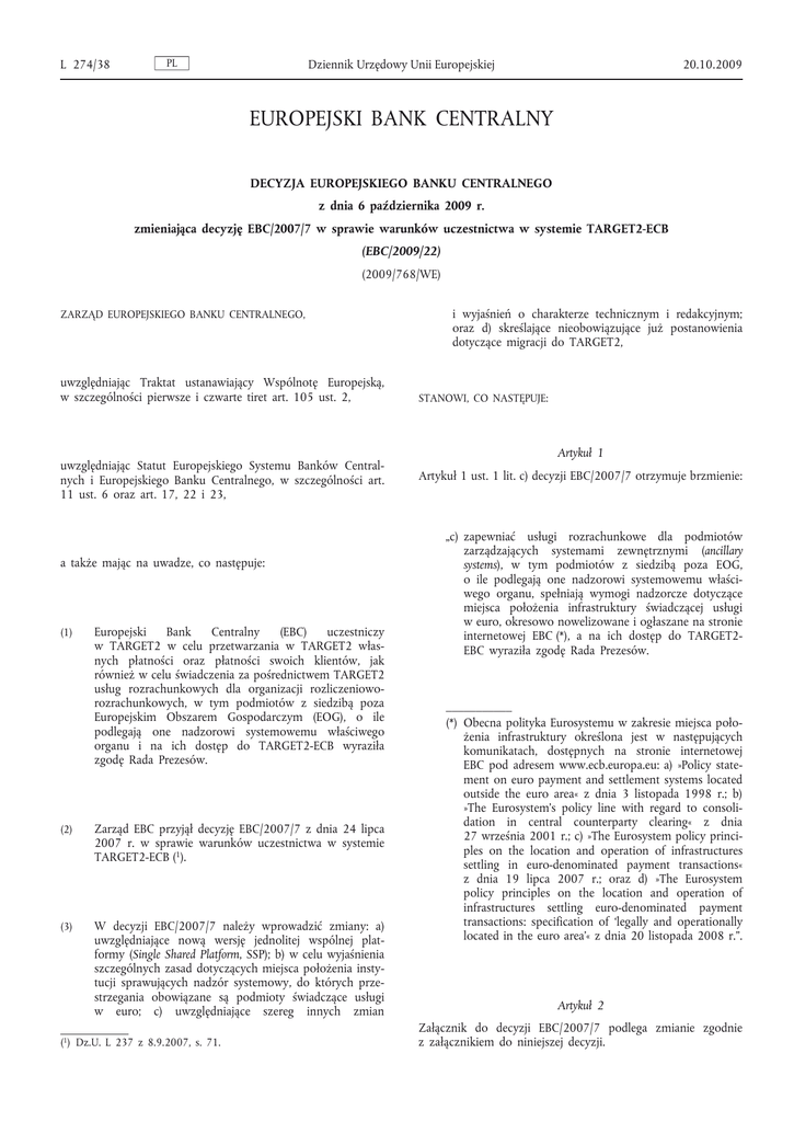 L 274/38 PL Dziennik Urzędowy Unii Europejskiej 20.10.2009 EUROPEJSKI BANK CENTRALNY DECYZJA EUROPEJSKIEGO BANKU CENTRALNEGO z dnia 6 października 2009 r. zmieniająca decyzję EBC/2007/7 w sprawie warunków uczestnictwa w systemie TARGET2-ECB (EBC/2009/22) (2009/768/WE) ZARZĄD EUROPEJSKIEGO BANKU CENTRALNEGO, uwzględniając Traktat ustanawiający Wspólnotę Europejską, w szczególności pierwsze i czwarte tiret art. 105 ust. 2, uwzględniając Statut Europejskiego Systemu Banków Central nych i Europejskiego Banku Centralnego, w szczególności art. 11 ust. 6 oraz art. 17, 22 i 23, a także mając na uwadze, co następuje: (1) Europejski Bank Centralny (EBC) uczestniczy w TARGET2 w celu przetwarzania w TARGET2 włas nych płatności oraz płatności swoich klientów, jak również w celu świadczenia za pośrednictwem TARGET2 usług rozrachunkowych dla organizacji rozliczenioworozrachunkowych, w tym podmiotów z siedzibą poza Europejskim Obszarem Gospodarczym (EOG), o ile podlegają one nadzorowi systemowemu właściwego organu i na ich dostęp do TARGET2-ECB wyraziła zgodę Rada Prezesów. (2) Zarząd EBC przyjął decyzję EBC/2007/7 z dnia 24 lipca 2007 r. w sprawie warunków uczestnictwa w systemie TARGET2-ECB (1). (3) W decyzji EBC/2007/7 należy wprowadzić zmiany: a) uwzględniające nową wersję jednolitej wspólnej plat formy (Single Shared Platform, SSP); b) w celu wyjaśnienia szczególnych zasad dotyczących miejsca położenia insty tucji sprawujących nadzór systemowy, do których prze strzegania obowiązane są podmioty świadczące usługi w euro; c) uwzględniające szereg innych zmian (1) Dz.U. L 237 z 8.9.2007, s. 71. i wyjaśnień o charakterze technicznym i redakcyjnym; oraz d) skreślające nieobowiązujące już postanowienia dotyczące migracji do TARGET2, STANOWI, CO NASTĘPUJE: Artykuł 1 Artykuł 1 ust. 1 lit. c) decyzji EBC/2007/7 otrzymuje brzmienie: „c) zapewniać usługi rozrachunkowe dla podmiotów zarządzających systemami zewnętrznymi (ancillary systems), w tym podmiotów z siedzibą poza EOG, o ile podlegają one nadzorowi systemowemu właści wego organu, spełniają wymogi nadzorcze dotyczące miejsca położenia infrastruktury świadczącej usługi w euro, okresowo nowelizowane i ogłaszane na stronie internetowej EBC (*), a na ich dostęp do TARGET2EBC wyraziła zgodę Rada Prezesów. ___________ (*) Obecna polityka Eurosystemu w zakresie miejsca poło żenia infrastruktury określona jest w następujących komunikatach, dostępnych na stronie internetowej EBC pod adresem www.ecb.europa.eu: a) »Policy state ment on euro payment and settlement systems located outside the euro area« z dnia 3 listopada 1998 r.; b) »The Eurosystem’s policy line with regard to consoli dation in central counterparty clearing« z dnia 27 września 2001 r.; c) »The Eurosystem policy princi ples on the location and operation of infrastructures settling in euro-denominated payment transactions« z dnia 19 lipca 2007 r.; oraz d) »The Eurosystem policy principles on the location and operation of infrastructures settling euro-denominated payment transactions: specification of ‘legally and operationally located in the euro area’« z dnia 20 listopada 2008 r.”. Artykuł 2 Załącznik do decyzji EBC/2007/7 podlega zmianie zgodnie z załącznikiem do niniejszej decyzji. PL 20.10.2009 Dziennik Urzędowy Unii Europejskiej Artykuł 3 Wejście w życie 1. Przepis art. 1 niniejszej decyzji oraz pkt 1 lit. a) i pkt 2 załącznika do niniejszej decyzji wchodzą w życie w dniu 23 października 2009 r. 2. Pozostałe przepisy niniejszej decyzji wchodzą w życie w dniu 23 listopada 2009 r. Frankfurt nad Menem dnia 6 października 2009 r. Prezes EBC Jean-Claude TRICHET L 274/39 PL L 274/40 Dziennik Urzędowy Unii Europejskiej ZAŁĄCZNIK W załączniku do decyzji EBC/2007/7 wprowadza się następujące zmiany: 1) w art. 1 wprowadza się następujące zmiany: a) definicja terminu „ancillary system” otrzymuje brzmienie: „— »ancillary system (AS)« means a system managed by an entity that is subject to supervision and/or oversight by a competent authority and complies with the oversight requirements for the location of infrastructures offering services in euro, as amended from time to time and published on the ECB website (*), in which payments and/or financial instruments are exchanged and/or cleared while the resulting monetary obligations are settled in TARGET2 in accordance with Guideline ECB/2007/2 and a bilateral arrangement between the ancillary system and the relevant CB, ___________ (*) The Eurosystem’s current policy for the location of infrastructure is set out in the following statements, which are all available on the ECB website at www.ecb.europa.eu: (a) the »Policy statement on euro payment and settlements located outside the euro area« of 3 November 1998; (b) »The Eurosystem’s policy line with regard to consolidation in central counterparty clearing« of 27 September 2001; (c) »The Eurosystem policy princi ples on the location and operation of infrastructures settling in euro-denominated payment transactions« of 19 July 2007; and (d) »The Eurosystem policy principles on the location and operation of infrastructures settling euro-denominated payment transactions: specification of ‘legally and operationally located in the euro area’« of 20 November 2008.”; b) skreśla się definicję terminu „Banking Directive”; c) definicja terminu „technical malfunction of TARGET2” w art. 1 otrzymuje brzmienie: „— »technical malfunction of TARGET2« means any difficulty, defect or failure in the technical infrastructure and/or the computer systems used by TARGET2-ECB, or any other event that makes it impossible to execute and complete the same-day processing of payments in TARGET2-ECB.”; 2) artykuł 4 otrzymuje brzmienie: „Article 4 Access criteria Entities managing ancillary systems (including entities established outside the