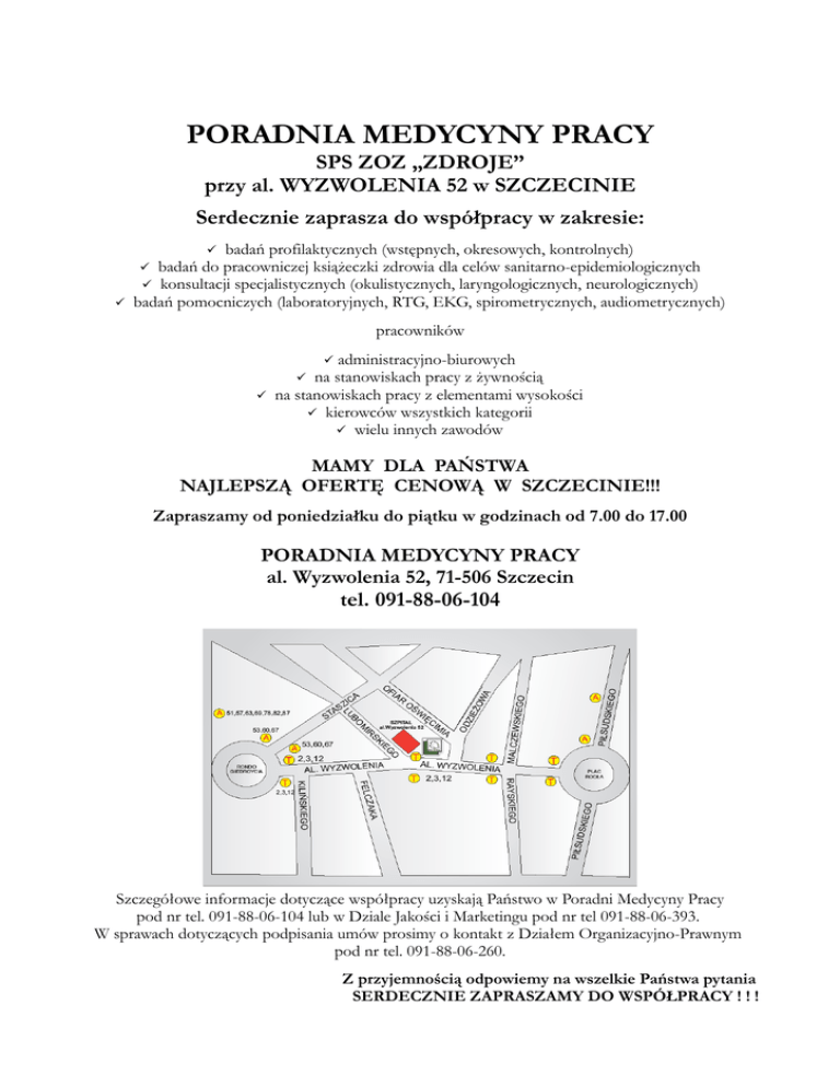 PORADNIA MEDYCYNY PRACY SPS ZOZ „ZDROJE” przy al. WYZWOLENIA 52 w SZCZECINIE Serdecznie zaprasza do współpracy w zakresie: badań profilaktycznych (wstępnych, okresowych, kontrolnych) badań do pracowniczej książeczki zdrowia dla celów sanitarno-epidemiologicznych konsultacji specjalistycznych (okulistycznych, laryngologicznych, neurologicznych) badań pomocniczych (laboratoryjnych, RTG, EKG, spirometrycznych, audiometrycznych) pracowników administracyjno-biurowych na stanowiskach pracy z żywnością na stanowiskach pracy z elementami wysokości kierowców wszystkich kategorii wielu innych zawodów MAMY DLA PAŃSTWA NAJLEPSZĄ OFERTĘ CENOWĄ W SZCZECINIE!!! Zapraszamy od poniedziałku do piątku w godzinach od 7.00 do 17.00 PORADNIA MEDYCYNY PRACY al. Wyzwolenia 52, 71-506 Szczecin tel. 091-88-06-104 Szczegółowe informacje dotyczące współpracy uzyskają Państwo w Poradni Medycyny Pracy pod nr tel. 091-88-06-104 lub w Dziale Jakości i Marketingu pod nr tel 091-88-06-393. W sprawach dotyczących podpisania umów prosimy o kontakt z Działem Organizacyjno-Prawnym pod nr tel. 091-88-06-260. Z przyjemnością odpowiemy na wszelkie Państwa pytania SERDECZNIE ZAPRASZAMY DO WSPÓŁPRACY ! ! ! CENNIK BADAŃ PROFILAKTYCZNYCH PORADNI MEDYCYNY PRACY SPS ZOZ „ZDROJE” przy al. WYZWOLENIA 52 w SZCZECINIE RODZAJ BADANIA Badanie lekarskie i wydanie orzeczenia Wydanie zaświadczenia o przydatności do zawodu Książeczka zdrowia (badanie lekarskie i wpis) Książeczka zdrowia (gdy wpis do książeczki dokonywany jest równocześnie z badaniem lekarskim i wystawieniem orzeczenia) CENY KOMERCYJNE SPS ZOZ „ZDROJE” (brutto) CENY PO PODPISANIU UMOWY (brutto) 35,00 zł 25,00 zł 35,00 zł 30,00 zł 25,00 zł 30,00 zł - 10,00 zł Badania dodatkowe na zlecenie lekarza medycyny pracy wynikające z czynników narażenia jakie występują na zajmowanym stanowisku pracy na podstawie Rozporządzenia Ministra Zdrowia Dz. U. Nr 69 z 1996r. poz.332 z późn. zm. Podstawowe badania laboratoryjne – OB, morfologia z rozmazem i płytkami krwi, badanie moczu Profilaktyczne badanie okulistyczne Badanie laryngologiczne Badanie neurologiczne Badania psychologiczne: • badanie psychotechniczne kierowców (kat. B,C,D,E) • badanie psychotechniczne kierowców – sprawców wypadków, za punkty, za alkohol • badanie psychotechniczne operatorów wózków widłowych i innych Spirometria Audiometria RTG klatki piersiowej z opisem EKG z opisem Dodatkowe badania laboratoryjne: • glukoza • ALT • AST • bilirubina • kreatynina • cholesterol • LIPIDY /cholesterol, TG, HDL, LDL/ Inne opłaty: Za udział w posiedzeniu komisji bezpieczeństwa i higieny pracy Przeprowadzenie dochodzenia epidemiologicznego w związku z podejrzeniem choroby zawodowej Wydanie duplikatu 21,00 zł 18,00 zł 30,00 zł 25,00 zł 25,00 zł 25,00 zł 20,00 zł 20,00 zł 100,00 zł 110,00 zł 90,00 zł 100,00 zł 80,00 zł 70,00 zł 30,00 zł 25,00 zł 30,00 zł 20,00 zł 25,00 zł 20,00 zł 28,00 zł 15,00 zł 5,00 zł 8,00 zł 8,00 zł 7,00 zł 7,00 zł 8,00 zł 35,00 zł 5,00 zł 8,00 zł 8,00 zł 7,00 zł 7,00 zł 8,00 zł 33,00 zł 150,00 zł 100,00 zł 200,00 zł 150,00 zł 7,00 zł 7,00 zł