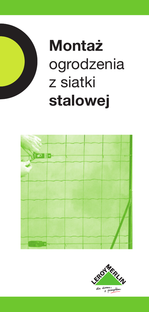 Montaż ogrodzenia z siatki stalowej Przygotowanie kosztorysu Nr artyku∏u Obliczanie iloÊci SIATKA Obwód terenu S¸UPKI Ogrodzenie z siatki plecionej: 1 s∏upek co 2,5 metra + 1 s∏upek poczàtkowy Mocowane w betonie: wysokoÊç ogrodzenia + 25 cm Osadzane bez wpuszczania w beton: wysokoÊç ogrodzenia + 50 cm Ogrodzenie z siatki zgrzewanej: maksymalnie 1 s∏upek co 2,5 metra + 1 s∏upek poczàtkowy Zastrza∏y Po 2 na ka˝dy s∏upek naro˝ny i podporowy, 1 na s∏upek poczàtkowy Cena jedn. Cena ∏àczna WZMOCNIENIA S∏upki 1 na ka˝dy s∏upek Zastrza∏y 1 na ka˝dy zastrza∏ Âruby AKCESORIA Drut napr´˝ajàcy Napinacze Po 1 drucie co 50 cm wysokoÊci ogrodzenia +1 d∏ugoÊç drutu = d∏ugoÊç ogrodzenia x liczba drutów Do ka˝dego drutu napr´˝ajàcego: po 1 na ka˝dy s∏upek poczàtkowy, naro˝ny i podporowy Drut wiàza∏kowy 30 cm na metr drutu napr´˝ajàcego Zaczepy 3 na ka˝dy metr bie˝àcy drutu napr´˝ajàcego Pr´t napinajàcy Po 1 na s∏upek poczàtkowy i koƒcowy, po 2 na s∏upki naro˝ne. Data . . . . . . . . . . . . . . . Ogólna suma . . . . . . . . . . . . . . . Określanie liczby słupków Obliczyć obwód ogradzanego terenu (w metrach): - Siatka pleciona: liczba słupków = (obwód / 2,5) +1 Siatka zgrzewana: liczba słupków = (obwód / 2 lub 2,5) + 1 2,5 m 25 m Należy przygotować po 2 zastrzały na każdy słupek narożny i po jednym na każdy słupek początkowy. Na każdy odcinek ogrodzenia dłuższy niż 25 m, przygotować słupki podporowe, które należy rozstawić co 25 metrów (po 2 zastrzały na każdy słupek). Akcesoria niezbędne do montażu ogrodzenia Drut naprężający Po ustawieniu słupków, przygotować jeden drut do rozciągnięcia w górnej i jeden drut do rozciągnięcia w dolnej części ogrodzenia. 4 3 2 1 3 2 1 Na każde 50 cm wysokości ogrodzenia należy przygotować drut wewnętrzny. Przykład 1: Ogrodzenie wysokości 1 m. Długość drutu = 3 x długość ogrodzenia + 5 % Przykład 2: Ogrodzenie wysokości 1,5 m. Długość drutu = 4 x długość ogrodzenia + 5%. Napinacze Na całą długość drutu naprężającego należy przygotować po 1 napinaczu do każdego słupka początkowego, narożnego i podporowego. Drut wiązałkowy lub zaczepy Służą do mocowania siatki do drutu naprężającego. Na 1 metr drutu naprężającego potrzeba 3 zaczepy lub 30 cm drutu wiązałkowego. Pręt napinający Umożliwia odpowiednie naciągnięcie siatki i zapobiega jej deformacji. Należy przygotować po jednym pręcie na każdy słupek początkowy i po 2 drążki na każdy słupek narożny lub podporowy. 15 cm m∏otek lub m∏ot kamieniarski napinacze poziomnica obc´gi do zaczepów szpula drutu wiàza∏kowego klucz p∏aski nr 6 lub nr 8 zaczepy szpilki (do betonowych s∏upków) obc´gi lub szczypce tnàce ∏opata szpadel pr´ty napinajàce NARZĘDZIA I AKCESORIA drut napr´˝ajàcy sznur korytko i szpachelka Przygotowanie Dobór słupków Rodzaj stupka należy dopasować do jego lokalizacji. Słupek początkowy: jeden zastrzał (A) Słupek narożnikowy: dwa zastrzały, ustawione pod kątem 90° (B) Słupek pośredni: bez zastrzałów (C1) C2 B C1 A Słupek podporowy: dwa zastrzały (C2) Określenie wysokości słupków 1. Wpuszczane w podmurówkę lub beton: Wysokość ogrodzenia + 25 cm 1 2 25 cm 50 cm 2. Wkopywane w ziemię: Wysokość ogrodzenia + 50 cm 3. Słupki mocowane na kotwach Wysokość słupka = Wysokość ogrodzenia 3 Montaż Słupki Za pomocą sznura wyznaczyć linię prostą, wzdtuż której umieszczone zostaną słupki. Rozpocząć od ustawienia słupków początkowych i narożnych, następnie dopasować do nich słupki pośrednie. A) Mocowanie w betonie Wykopać w ziemi dołek o wymiarach 25 x 25 x 25 cm. Przygotować beton, ułożyć go w wykonanym dołku, następnie umieścić w nim słupek (patrz rysunek). Przy użyciu poziomnicy sprawdzić, czy słupek jest ustawiony pionowo. Przed rozpięciem siatki zaczekać, aż beton stwardnieje (2-3 dni). B) 25 cm Montaż słupków na kotwach Kotwy dostosowane są do słupków drewnianych lub metalowych. Nie można ich użyć, gdy podłoże jest skaliste. 25 cm Przed rozpięciem siatki zaczekać, aż beton stwardnieje (2-3 dni). Zalety: • szybki montaż, nienaruszone podłoże • nie ma potrzeby wykonywania robót ziemnych ani betonowych • lepsze mocowanie słupków • oszczędność - słupki krótsze o 50 cm • lepsza ochrona drewnianych słupków przed działaniem wilgoci • możliwość montażu słupków i siatki tego samego dnia Zastrzały A B Zabetonowany. Na kotwie. A B Druty naprężające Zamocować napinacze w odległości 15 cm od każdego słupka narożnego, początkowego i podporowego. Założyć druty naprężające. Stopniowo napinać każdy drut. Napinanie drutów należy obowiązkowo zaczynać od dolnego. 15 cm Siatka A) Siatka zgrzewana 1. Siatkę należy tak ustawić, by zagięcia skierowane były w dół. Zagięcia (kapinosy) są to niewielkie odkształcenia siatki, umożliwiające właściwe spływanie wody (1). 1 2 2. Do pierwszego słupka narożnego przymocować siatkę wraz z prętem napinającym (2). 3. Kolejny pręt napinający umieszcza się w odległości około 50 cm od słupka narożnego i przymocowuje go do siatki przy użyciu drutu wiązał-kowego i napinaczy. pr´t napinajàcy 3 50 cm 4. Przymocować siatkę do drutów naprężających i do słupków pośrednich. Stopniowo napinać siatkę. 5. Uciąć siatkę przy każdym słupku narożnym i powtórzyć czynności, zaczynając od punktu (1). 4 p∏aszczyzna ogrodzenia B) Siatka pleciona 1. Położyć rulon siatki na ziemi i rozwinąć go. 2. Sprawdzić rozmiary i rozstaw oczek. 3. Wsunąć pierwszy pręt napinający w siatkę na brzegu rulonu i przymocować go do stupka początkowego. 4. Wsunąć drugi drążek naprężający blisko stupka narożnego. Przymocować pręt napinający do stupka i przy użyciu na-pinaczy i naciągnąć siatkę. 1 2 3 4 Odciąć nadmiar sia