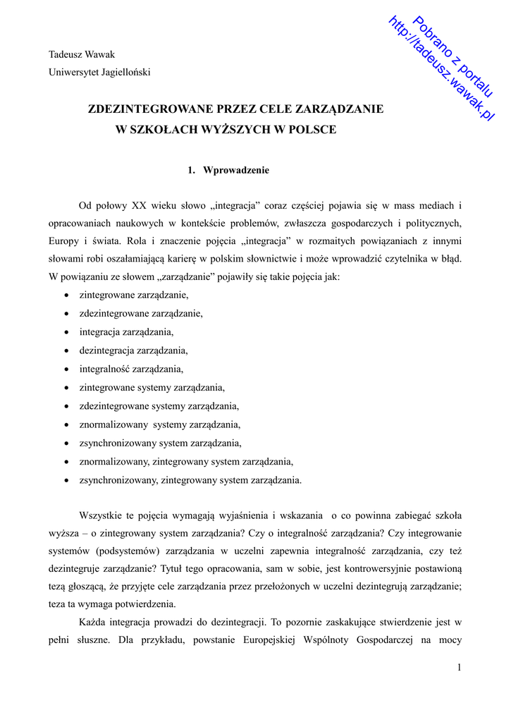 tp lu .pl rta ak po aw z o z.w an us br de Po //ta : ht Tadeusz Wawak Uniwersytet Jagielloński ZDEZINTEGROWANE PRZEZ CELE ZARZĄDZANIE W SZKOŁACH WYŻSZYCH W POLSCE 1. Wprowadzenie Od połowy XX wieku słowo „integracja” coraz częściej pojawia się w mass mediach i opracowaniach naukowych w kontekście problemów, zwłaszcza gospodarczych i politycznych, Europy i świata. Rola i znaczenie pojęcia „integracja” w rozmaitych powiązaniach z innymi słowami robi oszałamiającą karierę w polskim słownictwie i może wprowadzić czytelnika w błąd. W powiązaniu ze słowem „zarządzanie” pojawiły się takie pojęcia jak: • zintegrowane zarządzanie, • zdezintegrowane zarządzanie, • integracja zarządzania, • dezintegracja zarządzania, • integralność zarządzania, • zintegrowane systemy zarządzania, • zdezintegrowane systemy zarządzania, • znormalizowany systemy zarządzania, • zsynchronizowany system zarządzania, • znormalizowany, zintegrowany system zarządzania, • zsynchronizowany, zintegrowany system zarządzania. Wszystkie te pojęcia wymagają wyjaśnienia i wskazania o co powinna zabiegać szkoła wyższa – o zintegrowany system zarządzania? Czy o integralność zarządzania? Czy integrowanie systemów (podsystemów) zarządzania w uczelni zapewnia integralność zarządzania, czy też dezintegruje zarządzanie? Tytuł tego opracowania, sam w sobie, jest kontrowersyjnie postawioną tezą głoszącą, że przyjęte cele zarządzania przez przełożonych w uczelni dezintegrują zarządzanie; teza ta wymaga potwierdzenia. Każda integracja prowadzi do dezintegracji. To pozornie zaskakujące stwierdzenie jest w pełni słuszne. Dla przykładu, powstanie Europejskiej Wspólnoty Gospodarczej na mocy 1 tp lu .pl rta ak po aw z o z.w an us br de Po //ta : ht podpisanego w 1957 roku Traktatu Rzymskiego 1 wywołało stopniowo postępujący proces scalania na początku gospodarczego sześciu państw, a potem 27 krajów Europy w ramach Unii Europejskiej oraz postępującą dezintegrację Europy. Powstanie w 1949 roku Organizacji Paktu Północnoatlantyckiego NATO i w odpowiedzi na przyjęcie RFN do NATO w 1955 Układu Warszawskiego 2 doprowadziło do dezintegracji świata, bezsensownego wyścigu militarnego i zagrożenia bezpieczeństwa dla całej ludzkości. Integracja monetarna krajów Europy podzieliła kraje Unii Europejskiej na dwa wewnętrzne ugrupowania o tzw. różnych prędkościach - na kraje tzw. „Eurolandu” i pozostałe kraje Unii Europejskiej. Prowadzone badania naukowe, wiedza i doświadczenia autora 3, pozwalają na stwierdzenie: integracja w jednym obszarze oznacza jednocześnie dezintegrację w drugim; działa więc w dwie, występujące łącznie, przeciwstawne strony. Powyższa zależność występuje także w obszarze zarządzania. Jeśli w organizacji działają obok siebie, na przykład trzy, oddzielne, zintegrowane wewnętrznie, systemy zarządzania znormalizowanego (np. jakością, wpływem na środowisko, i bezpieczeństwem informacji) oparte na trzech normach ISO (kolejno: 9001, 14001 oraz 27001) to integracja tych systemów zarządzania polegać będzie na dążeniu do wyodrębnienia elementów wspólnych i podobnych oraz oddzielnie specyficznych dla poszczególnych systemów, które po połączeniu stają się podsystemami. Może to dotyczyć: celów, relacji, dokumentacji, auditów, zasobów, struktur, obiektów, itd. Musimy, jednocześnie pamiętać o tym, że „pełna integracja podsystemów nie jest możliwa, ze względu na specyficzny charakter poszczególnych standardów i każdej sytuacji, niezależnie od stopnia integracji i w końcu, należy wykazać spełnienie wymagań poszczególnych standardów oddzielnie” 4 lub sporządzić listę wymagań specyficznych dla poszczególnych podsystemów zarządzania. Scalając trzy podsystemy zarządzania, które wcześniej były zintegrowane wewnętrznie, otrzymujemy zintegrowany system zarządzania znormalizowanego (obejmujący trzy podsystemy zarządzania znormalizowanego) składający się z elementów wspólnych i podobnych oraz reszty składającej się ze specyficznych elementów tych podsystemów. W sumie mamy wątpliwości – czy uzyskaliśmy w szkołach wyższych postęp w integracji zarządzania? oraz – czy osiągnęliśmy w uczelni zamierzony, zadowalający poziom integralności 1 Europa – Jak działa UE, http://europa.eu/about-eu/index_en.htm data odczyt 22.06.2012 r. 2 NATO, http://pl.wikipedia.org/wiki/NATO, data odczyt 22.06.2012 r. 3 Autor w swej pracy magisterskiej i doktorskiej i pierwszych publikacjach zajmował się integracją gospodarczą w Europie w ramach EWG i krajów tzw. trzeciego świata w Afryce; a obecnie zajmuje się integracją szkolnictwa wyższego w ramach procesu bolońskiego, która prowadzi do Europejskiego Obszaru Szkolnictwa Wyższego. 4 J. Bagiński, Doświadczenia we wdrażaniu zintegrowanych systemów zarządzania, [w:] „Zintegrowane systemy zarządzania jakością”, materiały konferencji naukowej Akademii Ekonomicznej w Krakowie, Kraków 1998 r., s s.25 2 tp lu .pl rta ak po aw z o z.w an us br de Po //ta : ht zarządzania? Pojawia się kolejne pytanie – czy ważniejsze jest dążenie do scalania podsystemów zarządzania w zintegrowany system zarządzania od tworzenia zintegrowanego zarządzania? Nie są to pojęcia tożsame. 2. Zintegrowane zarządzanie Prof. Ber Haus przez „zintegrowane zarządzanie” rozumiał: całość, kompleksowość połączonych spójnych części zarządzania, w którym „zawarte są wszystkie elementy składające się na zarządzanie. Tymi elementami bez uciekania się do bardzo szczegółowej analizy, są jego zsyntetyzowane funkcje, tj. planowanie, organizowanie, motywowanie i kontrolowanie.” 5 Obowiązkiem osoby zarządzającej, niezależnie od przyjętej konfiguracji jest utrzymanie integralności zarządzania; przy czym zawsze istnieje niebezpieczeństwo jej naruszania. 