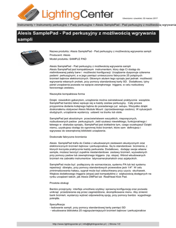 Utworzono: czwartek, 02 marzec 2017 Instrumenty > Instrumenty perkusyjne > Pady perkusyjne > Alesis SamplePad - Pad perkusyjny z możliwością wgrywania Alesis SamplePad - Pad perkusyjny z możliwością wgrywania sampli Nazwa produktu: Alesis SamplePad - Pad perkusyjny z możliwością wgrywania sampli Producent: Alesis Model produktu: SAMPLE PAD Alesis SamplePad - Pad perkusyjny z możliwością wgrywania sampli Alesis SamplePad jest kompaktowym instrumentem, ktory daje Ci dostęp do nielimitowanej palety barw i możliwości konfiguracji. Urządzenie dysponuje czterema padami perkusyjnymi, a w jego pamięci umieszczono fabrycznie 25 potężnych brzmień bębnow elektronicznych. Głownym atutem tego sprzętu jest jednak możliwość wgrywania własnych probek, przy pomocy standardowej karty SD. Dodatkowo, tylny panel urządzenia pozwala na wpięcie zewnętrznego triggera, w celu rozbudowy tworzonego zestawu. Niezwykle kompaktowa forma Dzięki niewielkim gabarytom, urządzenie można zainstalować praktycznie wszędzie. SamplePad bardzo łatwo wpisuje się w każdy zestaw perkusyjny. Cały proces przypomina dodanie kolejnego bębna do posiadanego już setupu. Wszystko dzięki doskonałemu statywowi Alesis Module Mount (sprzedawanego osobno). W sytuacjach studyjnych, urządzenie wystarczy ustawić na biurku lub stole. SamplePad jest absolutnym przeciwieństwem wszystkich, nieporęcznych, rozbudowanych padow perkusyjnych. Jeśli szukasz niewielkiego, funkcjonalnego i łatwego w obsłudze sprzętu, SamplePad jest dokładnie tym, czego oczekujesz! Dzięki niemu, uzyskujesz dostęp do ogromnej ilości brzmień, ktore sam definiujesz i wgrywasz do wewnętrznej biblioteki urządzenia. Doskonałe fabryczne brzmienia Alesis SamplePad trafia do Ciebie z wbudowanym zestawem akustycznych oraz elektronicznych brzmień bębnow i perkusjonaliow. Są to standardowe brzmienia, z ktorych korzysta praktycznie każdy perkusista. Dodatkowo, dodając swoje własne sample, możesz tworzyć zupełnie niestandardowe zestawy brzmień, wyzwalanych przy pomocy padow lub zewnętrznego triggera (np. stopa). Wśrod wbudowanych brzmień nie zabrakło instrumentow latynoamerykańskich oraz azjatyckich. SamplePad może być podłączony do wzmacniacza, systemu PA lub też systemu rejestracji dźwięku, przy pomocy standardowych przewodow jack 1/4". W celu zminimalizowania hałasu, sygnał może być odsłuchiwany przy uzyciu słuchawek. Wejście dodatkowego triggera (stopa) jest kompatybilne z większością dostępnych na rynku urządzeń takich, jak Alesis DMPad lub RealHead Kick Pad. Prostota obsługi Bardzo przejrzysty interfejs umożliwia szybką i sprawną konfigurację oraz pozwala uniknąć przedzierania się przez zagnieżdżone, skomplikowane menu. Aby zmienić bank brzmień, wystarczy wybrać odpowiednią opcję, przy pomocy bardzo wygodnego pokrętła. Specyfikacja: - ładowanie sampli, przy pomocy standardowej karty pamięci SD - wbudowana biblioteka 25 najpopularniejszych brzmień bębnow i perkusjonaliow http://www.lightingcenter.pl | [email protected] | | Strona 1/2 Utworzono: czwartek, 02 marzec 2017 Instrumenty > Instrumenty perkusyjne > Pady perkusyjne > Alesis SamplePad - Pad perkusyjny z możliwością wgrywania Alesis SamplePad - Pad perkusyjny z możliwością wgrywania sampli - czytelny, niebieski podświetlany wyświetlacz, intuicyjny interfejs, łatwa kontrola urządzenia - 4 stopnie dynamiki padow - zapis ulubionych zestawow brzmień - kompaktowa forma - łatwy montaż - jako element posiadanego zestawu perkusyjnego - kompatybilny ze statywem do werbla - możliwość ustawienia na biurku lub montażu na dowolnym statywie (przy pomocy Alesis Module Mount - sprzedawany osobno) - możliwość dostrajania sampli i nakładani na nie pogłosu - wyjście MIDI - akceptowany format wgrywanych sampli: 16/8 bit; 48/44.1/32/22.05/11.205 kHz - maksymalny rozmiar sampla: 14 MB - w zestawie: SamplePad, zasilacz - brzmienia: Clap, Finger Snap, Cowbell High, Cowbell Low, Triangle Muted, Triangle Open, Tambourine, Wind Chimes, Sleighbells, Claves, Block, Jawbone, Studio Shaker, Live Shaker, Electro Tom Hex, Timbale, Conga Slap, Conga Open, Electro Kick 8, Electro Kick 9, Electro Kick Hex, Electro Snare 8, Electro Snare 9, Electro Snare Hex, Electro Crack Hex Cena: 594.00zł Cena promocyjna: 535.00zł http://www.lightingcenter.pl | [email protected] | | Strona 2/2