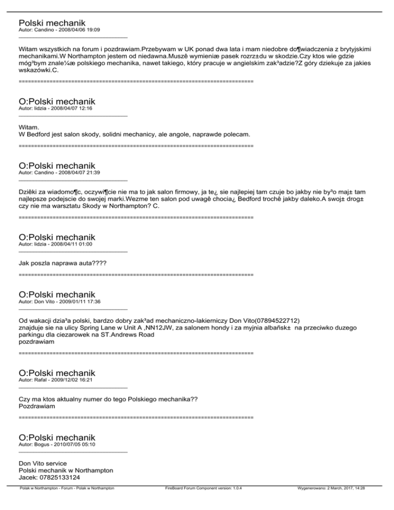 Polski mechanik Autor: Candino - 2008/04/06 19:09 _____________________________________ Witam wszystkich na forum i pozdrawiam.Przebywam w UK ponad dwa lata i mam niedobre do¶wiadczenia z brytyjskimi mechanikami.W Northampton jestem od niedawna.Muszê wymieniæ pasek rozrz±du w skodzie.Czy ktos wie gdzie móg³bym znale¼æ polskiego mechanika, nawet takiego, który pracuje w angielskim zak³adzie?Z góry dziekuje za jakies wskazówki.C. ============================================================================ O:Polski mechanik Autor: lidzia - 2008/04/07 12:16 _____________________________________ Witam. W Bedford jest salon skody, solidni mechanicy, ale angole, naprawde polecam. ============================================================================ O:Polski mechanik Autor: Candino - 2008/04/07 21:39 _____________________________________ Dziêki za wiadomo¶c, oczywi¶cie nie ma to jak salon firmowy, ja te¿ sie najlepiej tam czuje bo jakby nie by³o maj± tam najlepsze podejscie do swojej marki.Wezme ten salon pod uwagê chocia¿ Bedford trochê jakby daleko.A swoj± drog± czy nie ma warsztatu Skody w Northampton? C. ============================================================================ O:Polski mechanik Autor: lidzia - 2008/04/11 01:00 _____________________________________ Jak poszla naprawa auta???? ============================================================================ O:Polski mechanik Autor: Don Vito - 2009/01/11 17:36 _____________________________________ Od wakacji dzia³a polski, bardzo dobry zak³ad mechaniczno-lakierniczy Don Vito(07894522712) znajduje sie na ulicy Spring Lane w Unit A ,NN12JW, za salonem hondy i za myjnia albañsk± na przeciwko duzego parkingu dla ciezarowek na ST.Andrews Road pozdrawiam ============================================================================ O:Polski mechanik Autor: Rafal - 2009/12/02 16:21 _____________________________________ Czy ma ktos aktualny numer do tego Polskiego mechanika?? Pozdrawiam ============================================================================ O:Polski mechanik Autor: Bogus - 2010/07/05 05:10 _____________________________________ Don Vito service Polski mechanik w Northampton Jacek: 07825133124 Polak w Northampton - Forum - Polak w Northampton FireBoard Forum Component version: 1.0.4 Wygenerowano: 2 March, 2017, 14:28 Jeszcze nie by³em, ale w Pi±tek jestem umówiony na rozrz±d do Mazdy. Podobno bardzo dobry (tak mi kilka osób poradzi³o) Pozdrawiam i powodzenia ============================================================================ High Tech Engineering Autor: Artur - 2010/08/06 10:13 _____________________________________ polecam High Tech Engineering www.kjcarsint.co.uk/ maja pojecie o robocie, nie sciemniaja ============================================================================ O:Polski mechanik Autor: FCS Accident Ltd - 2010/10/07 22:48 _____________________________________ Witam, Jesli jeszcze ktos potrzebuje Don Vito 07535558510 (Przemek) Jest jeszcze jeden polski warsztat "ABAS" : 01604637023 Pozdrawiam Grzegorz www.fcs-accident.com ============================================================================ O:Polski mechanik Autor: danny_c - 2011/02/13 12:19 _____________________________________ Witam, jestem nowo przyby³ym mieszkañcem Northampton i nie znam miasta. Szukam polskiego mechanika, który siê na Vauxhallach. Mam Vectrê i prawdopodobnie mam do wymiany ¶wiece ¿arowe oraz czujnik temperatury/termostat w uk³adzie ch³odzenia. W±tek jest do¶æ stary, wiêc je¿eli kto¶ zna dobrego mechanika, który zna siê na rzeczy i przy okazji ma rozs±dne stawki proszê o kontakt. ============================================================================ O:Polski mechanik Autor: dawid - 2011/02/24 14:24 _____________________________________ polecam ten polski mechanik janusz numer telefonu 07894627837 high tech engineering . ============================================================================ O:Polski mechanik Autor: Skuter - 2011/03/09 21:26 _____________________________________ przepraszam, ze sie wtrace w temat, ale... jak wyglada kwestia warsztatow specjalizujacych sie w naprawach skuterow/quadow w northampton? jest to popularne czy moze brakuje? obecnei w takim warsztacie pracuje w polsce w trojmiescie i w sezonei przemial mamy przeogromny i Polak w Northampton - Forum - Polak w Northampton FireBoard Forum Component version: 1.0.4 Wygenerowano: 2 March, 2017, 14:28 sprzedaz tez nie mala. jakie marki sa popularne? firmowe piaggio, aprilla, kymco itp czy moze furore robia chinczyki ? w northampton bylem jakies 8 miesiecy swego czasu, ale jakos wtedy nie pomyslalem zeby zbadac temat, pod koniec lata mam zamiar wrocic i wroce na pewno, ale praca w magazynie to nie koniecznie to czego bym chcial :D ============================================================================ Polak w Northampton - Forum - Polak w Northampton FireBoard Forum Component version: 1.0.4 Wygenerowano: 2 March, 2017, 14:28