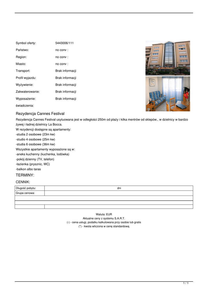 Symbol oferty: 5443006/111 Państwo: no conv : Region: no conv : Miasto: no conv : Transport: Brak informacji Profil wyjazdu: Brak informacji Wyżywienie: Brak informacji Zakwaterowanie: Brak informacji Wyposażenie: Brak informacji świadczenia: Rezydencja Cannes Festival Rezydencja Cannes Festival usytuowana jest w odległości 250m od plaży i kilka mentrów od sklepów., w dzielnicy w bardzo żywej i ładnej dzielnicy La Bocca. W rezydencji dostępne są apartamenty: -studia 2 osobowe (23m kw) -studio 4 osobowe (25m kw) -studia 6 osobowe (36m kw) Wszystkie apartamenty wyposażone są w: -aneks kuchenny (kuchenka, lodówka) -pokój dzienny (TV, telefon) -łazienka (prysznic, WC) -balkon albo taras TERMINY: CENNIK: Długość pobytu: dni Grupa cenowa: Waluta: EUR Aktualne ceny z systemu S.A.R.T. (-) - cena usługi, podatku kalkulowana przy osobie lub gratis (*) - kwota wliczona w cenę standardową 1/1