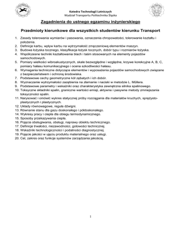 Katedra Technologii Lotniczych Wydział Transportu Politechnika Śląska Zagadnienia do ustnego egzaminu inżynierskiego Przedmioty kierunkowe dla wszystkich studentów kierunku Transport 1. Zasady tolerowania wymiarów i pasowania, oznaczenia chropowatości, tolerowanie kształtu i położenia. 2. Definicje karbu, wpływ karbu na wytrzymałość zmęczeniową elementów maszyn. 3. Budowa łożyska tocznego, klasyfikacja łożysk tocznych, dobór typu i rozmiarów łożyska. 4. Współczesne techniki kształtowania blach i taśm stosowanych na elementy pojazdów samochodowych. 5. Pomiary wielkości wibroakustycznych, skale bezwzględne i względne, krzywe korekcyjne A, B, C, pomiary hałasu komunikacyjnego i ocena szkodliwości hałasu. 6. Wymagania techniczne dotyczące elementów i wyposażenia pojazdów samochodowych związane z bezpieczeństwem i ochroną środowiska. 7. Podstawowe cechy geometryczne kół zębatych i ich dobór. 8. Wyznaczanie wytrzymałości zazębienia na złamanie i naciski w metodzie L. Műllera. 9. Podstawowe parametry i wskaźniki oraz charakterystyka zewnętrzna silnika spalinowego. 10. Toksyczne składniki spalin, graniczne wartości emisji, aktywne i pasywne metody zmniejszania toksyczności spalin. 11. Narysować i omówić wykres statycznej próby rozciągania dla materiałów kruchych, sprężystoplastycznych i plastycznych. 12. Układy równowagowe, reguła dźwigni. 13. Równanie stanu dla gazu doskonałego i półdoskonałego. 14. Wykresy pracy i ciepła dla obiegu termodynamicznego. 15. Sposoby przekazywania ciepła. 16. Pojęcia obsługiwania, obsługi, naprawy obiektu technicznego. 17. Definicje trwałości, niezawodności, gotowości technicznej. 18. Wskaźniki technologiczności i podatności diagnostycznej. 19. Pojęcie jakości w ujęciu produktu materialnego oraz usługi. 20. Cel, zakres oraz funkcje systemów zarządzania jakością. 1 Katedra Technologii Lotniczych Wydział Transportu Politechnika Śląska Zagadnienia dla specjalności: Nawigacja Powietrzna 1. 2. 3. 4. 5. 6. 7. 8. 9. 10. 11. 12. 13. 14. 15. 16. 17. 18. 19. 20. 21. 22. 23. 24. 25. 26. 27. 28. 29. 30. Pomoce i systemy nawigacyjne stosowane w transporcie lotniczym w aspekcie wybranych trzech międzynarodowych dokumentów. Wymienić 10 zasadniczych systemów nawigacyjnych pokładowo – naziemnych i krótko je scharakteryzować. Nawigacyjny trójkąt prędkości, elementy składowe i ich charakterystyka Czas, jego rodzaje i zależności pomiędzy nimi. Sposoby definiowania zbieżności południków i obliczenia w wybranej metodzie. Radionamiar i jego elementy składowe Charakterystyka metod lotu do radiolatarni. Punkt Krytyczny i sposób obliczanie jego położenia. Rodzaje map lotniczych i ich charakterystyka (wymienić przynajmniej 8). Wymagania dotyczące certyfikacji przewoźnika lotniczego i nadzoru i ich charakterystyka. Stosowane dokumenty ICAO i ich charakterystyka Wypełnić formularz „Plan lotu” i omówić Charakterystyka typów NOTAM-ów, napisać aktualny, dowolny NOTAM w wersji standardowej i „Q”. Charakterystyka SNOWTAM, napisać aktualny, dowolny SNOWTAM. Cykl AIRAC i obowiązujące wyprzedzenia, związane z podawaniem informacji Charakterystyka AIP Polska Charakterystyka Lotniczej Sieci Łączności Stałej (AFTN) i struktura depeszy AFTN. Procedura podejścia do lądowania wg. ILS dla wybranego lotniska – występujące elementy z opisem. Podział operacji terminalowej z punktu widzenia funkcjonalnego Operacje terminalowe, związane z przylotami i odlotami. Rodzaje przesyłek. Odprawa załogi i statków powietrznych. Skład załogi, obowiązki pracowników pokładowych. Rodzaje informacji PIB (Pre-flight Information Bulletin). Przewóz dzieci, ładunków niebezpiecznych. Działanie w sytuacjach awaryjnych. Wyposażenie samolotów w apteczki, gaśnice, kamizelki i tratwy ratunkowe- zasady ich użycia. Zagrożenie terroryzmem- sposoby przeciwdziałania zjawisku. Licencjonowanie, szkolenie załóg personelu pokładowego. Fronty atmosferyczne (rodzaje, sposób powstania, prędkość, ruchy powietrza, formowanie). Zjawiska atmosferyczne i ich charakterystyka. Charakterystyka warstw atmosfery z uwzględnieniem temperatury oraz prezentacja po jednym z wybranych zjawisk akustycznych i optycznych. Zasadniczy podział chmur i charakterystyka. Charakterystyka mas powietrza, podział, strefy występowania na kuli ziemskiej. Charakterystyka niebezpiecznych zjawisk atmosferycznych dla lotnictwa. 2 Katedra Technologii Lotniczych Wydział Transportu Politechnika Śląska Zagadnienia dla specjalności: Mechanika i Eksploatacja Lotnicza 1. 2. 3. 4. 5. 6. 7. 8. 9. 10. 11. 12. 13. 14. 15. 16. 17. 18. 19. 20. 21. 22. 23. 24. 25. 26. 27. 28. 29. 30. Siła nośna statku powietrznego – powstawanie, prawo Bernouliego. Siły, momenty działające na samolot – układ odniesienia, relacje sił w poszczególnych fazach lotu. Klasyfikacja struktur płatowca statku powietrznego – zasadnicze elementy struktury w zależności od jego rodzaju. Podać przykłady odnoszące się do poszczególnych elementów klasyfikacji. Elementy mechanizacji skrzydła statku powietrznego – przeznaczenie, rodzaje, omówić z uwzględnieniem elementów aerodynamiki statku powietrznego. Charakterystyka instalacji paliwowej samolotu – przeznaczenie, zasadnicze elementy, zasady eksploatacji. Charakterystyka instalacji hydraulicznej statku powietrznego – przeznaczenie, zasadnicze elementy, zasady eksploatacji. Charakterystyka instalacji elektrycznej statku powietrznego – przeznaczenie, zasadnicze elementy, zasady eksploatacji. Klasyfikacja poszczególnych grup przyrządów pokładowych statku powietrznego – przeznaczenie, zasada działania poszczególnych grup przyrządów, dajniki, zasadnicze przyrządy pokładowe. Klasyfikacja napędów lotniczych – przeznaczenie, podział, budowa, ogólna charakterystyka działania. Omówić zasady i zasadnicze dokumenty certyfikacyjne statku powietrznego